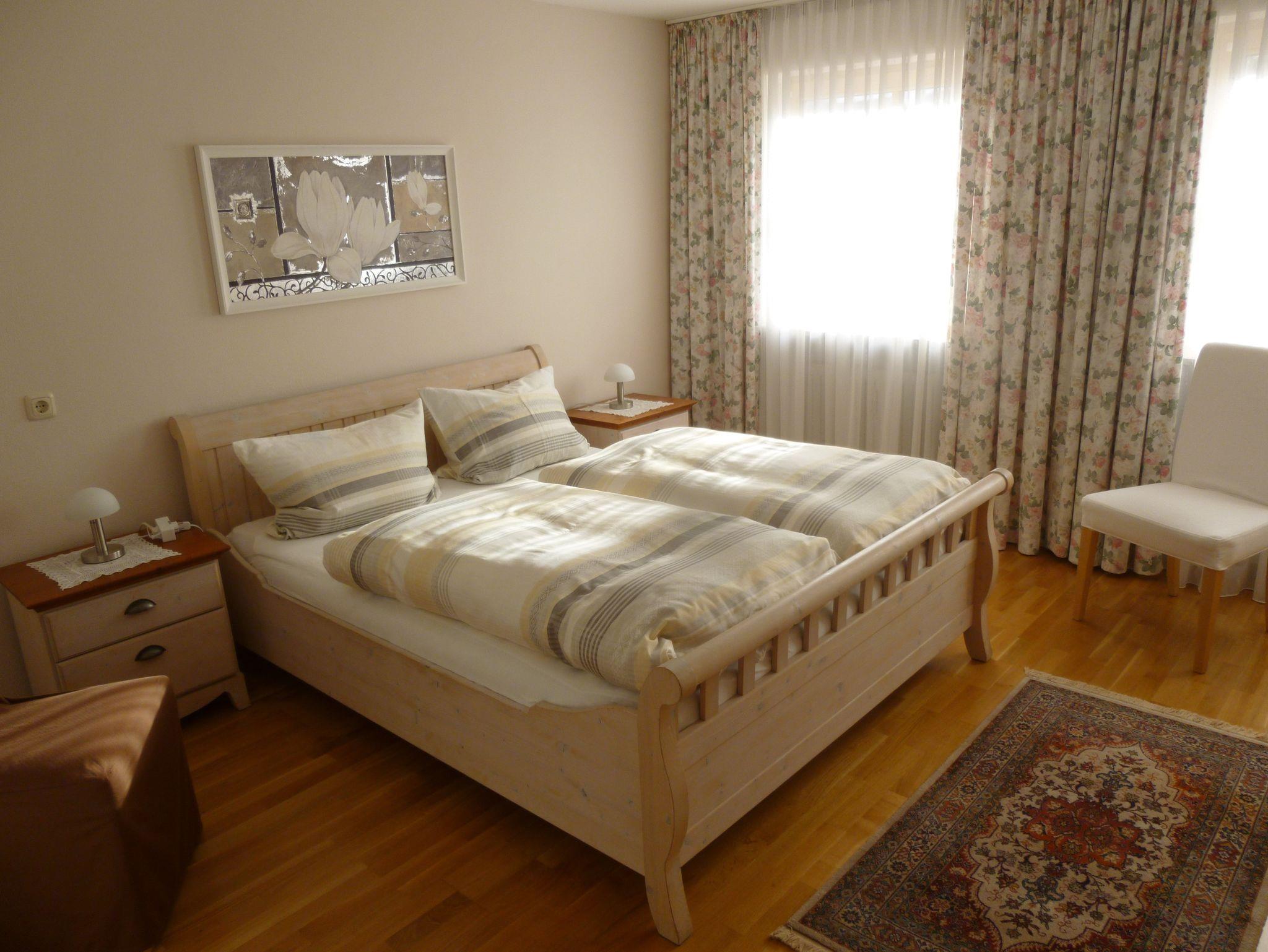 Komfortable 60 qm große Ferienwohnung für 1-2 Personen, 2015 neu renoviert. Die Wohnung befindet sich im 1. Obergeschoss und hat ein Wohnzimmer mit Schlafcouch, eine komplett ausgestattete Küche mit Esstisch, und ein Schlafzimmer. Ausserdem gibt es ein Bad mit Dusche und Waschbecken, sowie ein extra WC. Ebenso erwartet Sie ein extra großer überdachter Süd-West Balkon (14,5m Länge; 1,5m Breite) mit freien Blick auf Wald, Wiesen und Berge.