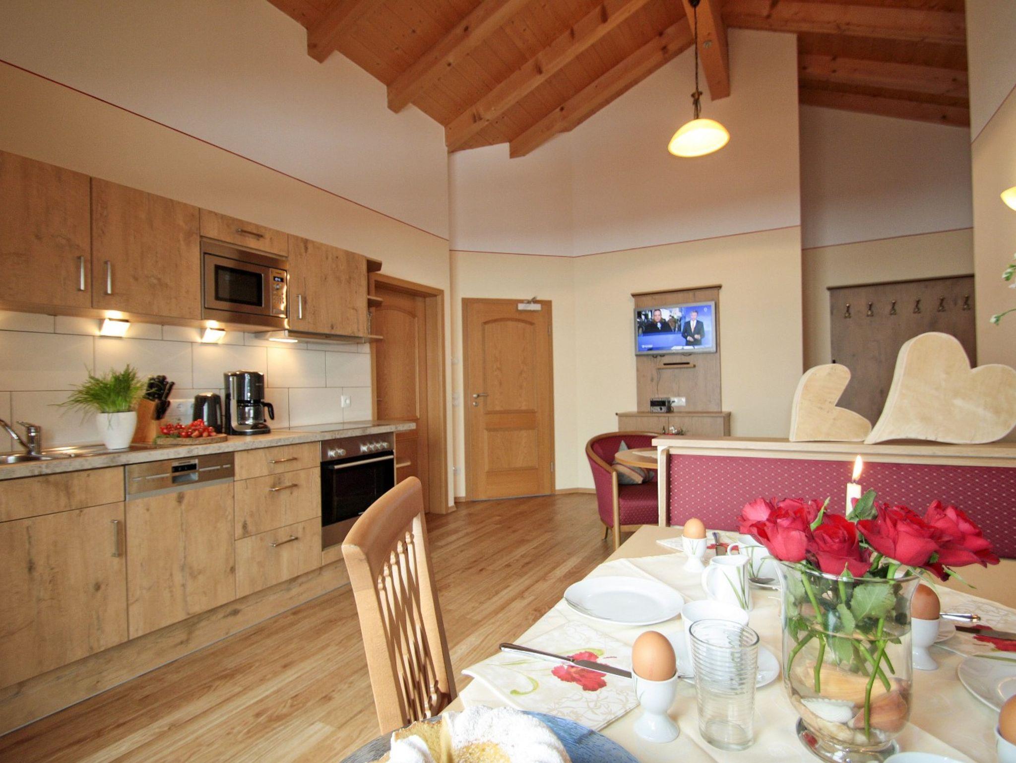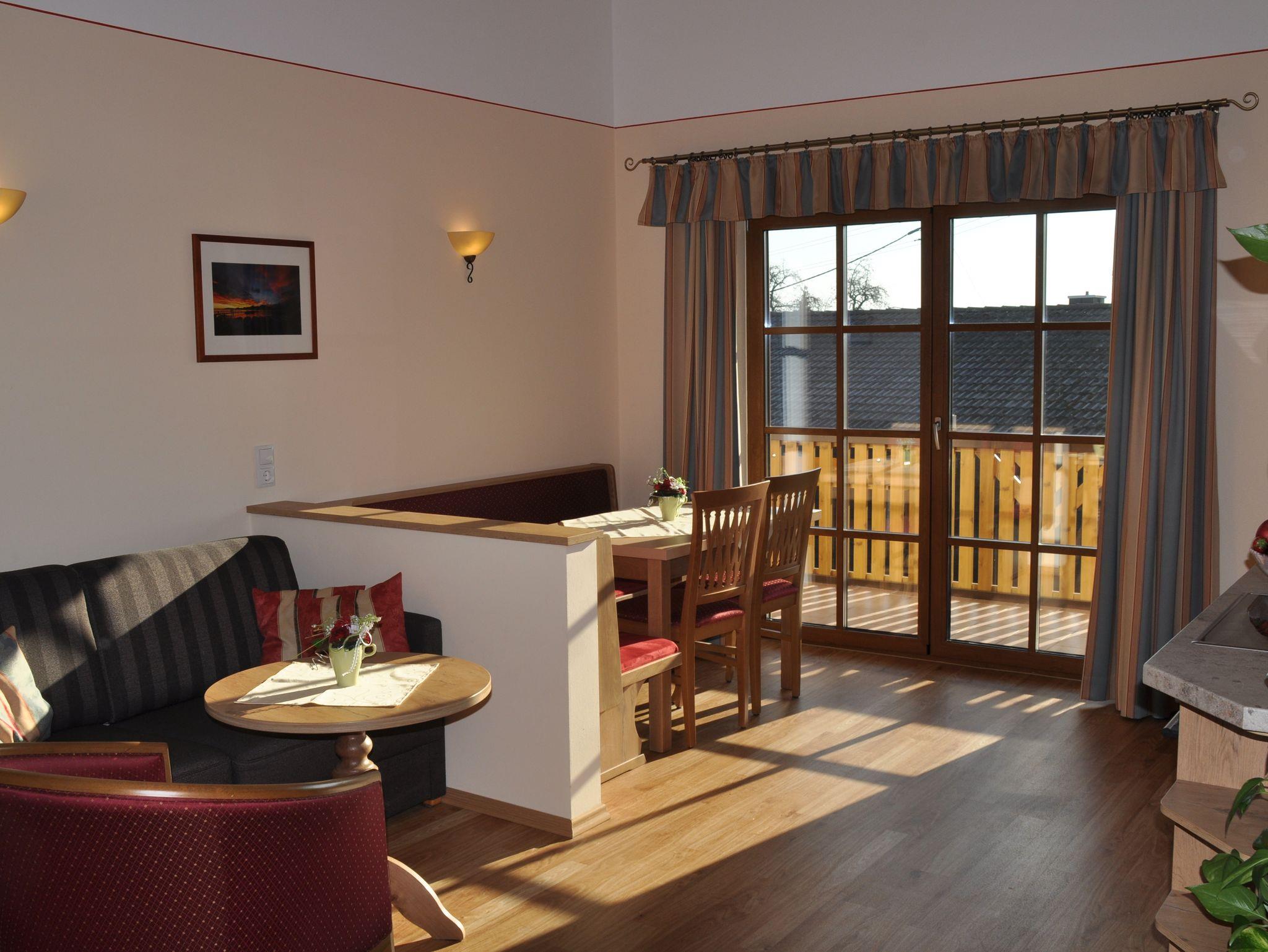 In unserem neu gebauten Nebengebäude befinden sich im Obergeschoß zwei große Ferienwohnungen mit je 75 qm und einem schönen Sichtdachstuhl. Die Wohnung Edelweiß hat zwei getrennte Schlafzimmer, eine komplett ausgestattete Küche mit Geschirrsüpülmaschine, eine gemütlich Sitzecke, eine ausziehbare Couch, einen Flachbildschirm und natürlich ein großzügiges Badezimmer. Vom Wohnbereich aus können Sie auf Ihrem eigenen Balkon (ca. 15n qm) die warmen Sonnenstrahlen genießen und haben einen schönen Blick in die Chiemgauer Berge. Kostenfreies WLAN.