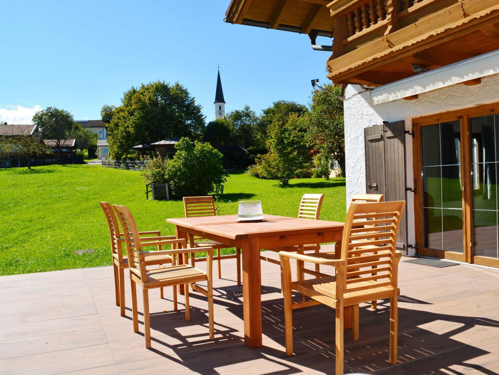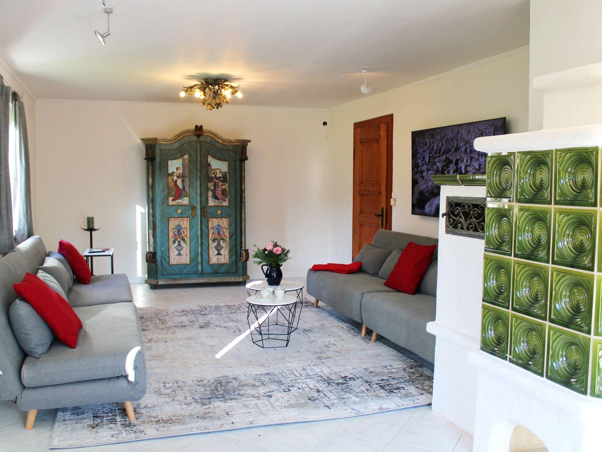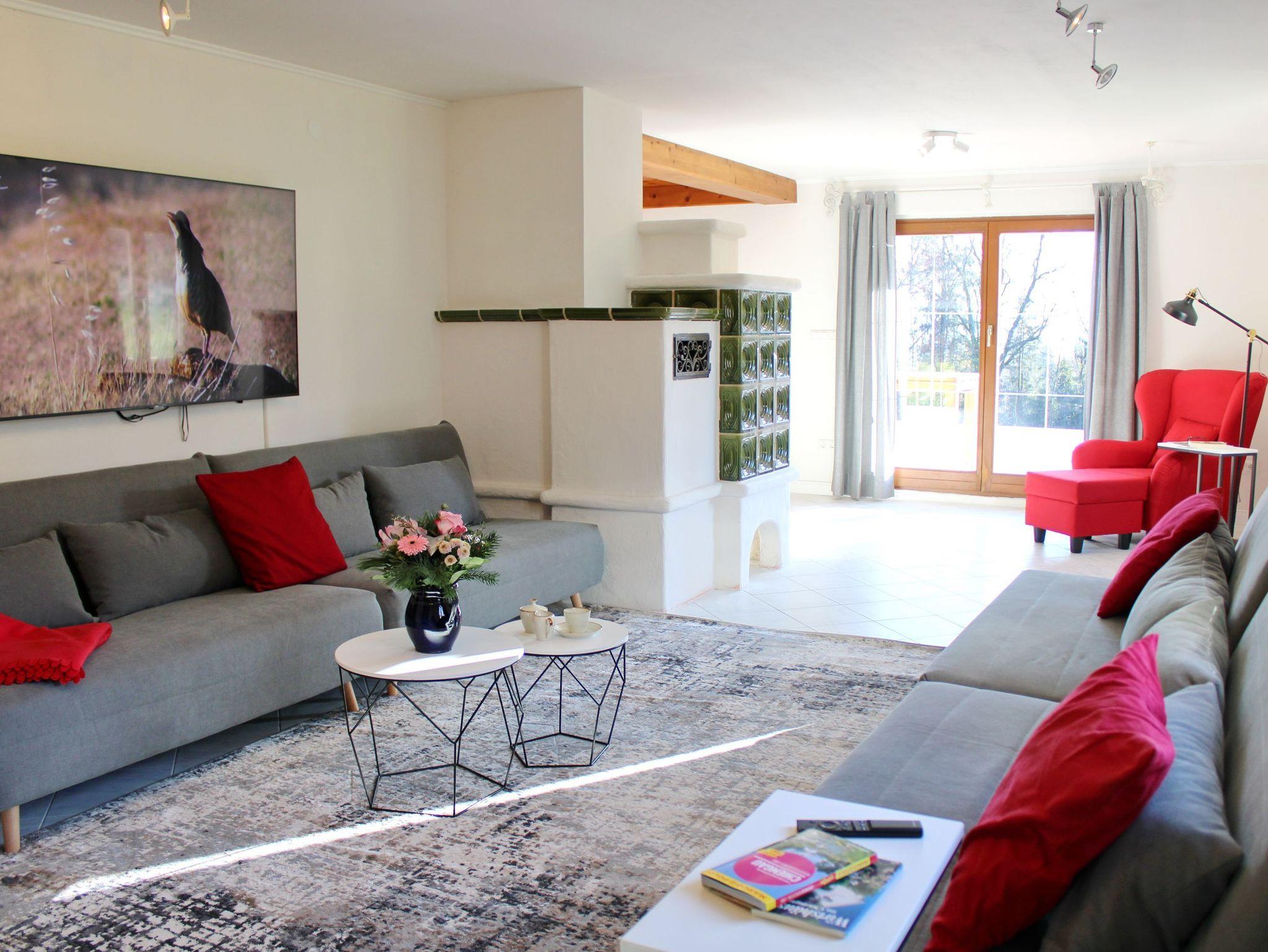 Der helle und großzügige Wohnbereich mit vielen Sitzmöglichkeiten und großem TV lädt zum Entspannen im Erdgeschoss ein. Für kuschelige Wärme sorgt der im typisch bayerischen Stil gehaltene Kachelofen. Die Holzvertäfelung unterstreicht den alpenländischen Charakter des Essbereiches mit Erker, welcher optisch durch den Kachelofen vom Wohnbereich getrennt ist. Hier findet sicherlich jeder seinen Rückzugsort. Die Küche lädt ein, seine Liebsten ausgiebig mit regionalen Köstlichkeiten zu verwöhnen und anschließend entspannt einen erfüllten Tag auf der großen Terrasse und im Garten ausklingen zu lassen. Terrasse und Garten können über den Wohnbereich betreten werden. Zwei Gartensofas laden zur Erholung inmitten der Natur mit wunderschönem Blick auf den Chiemsee ein.