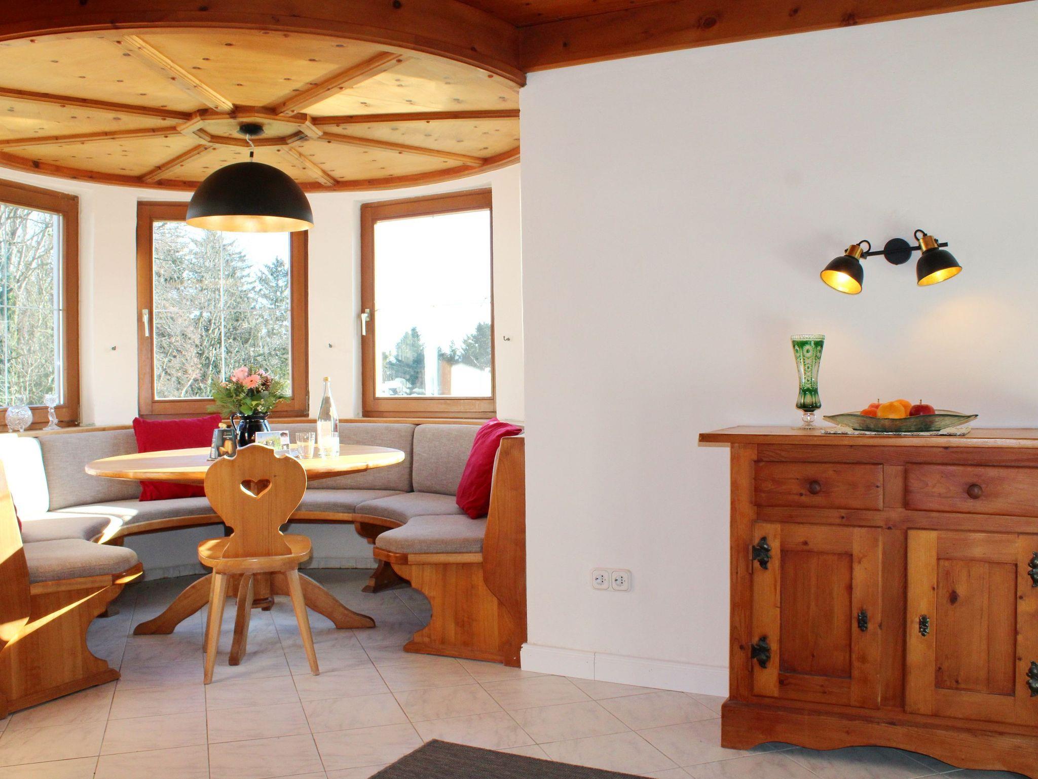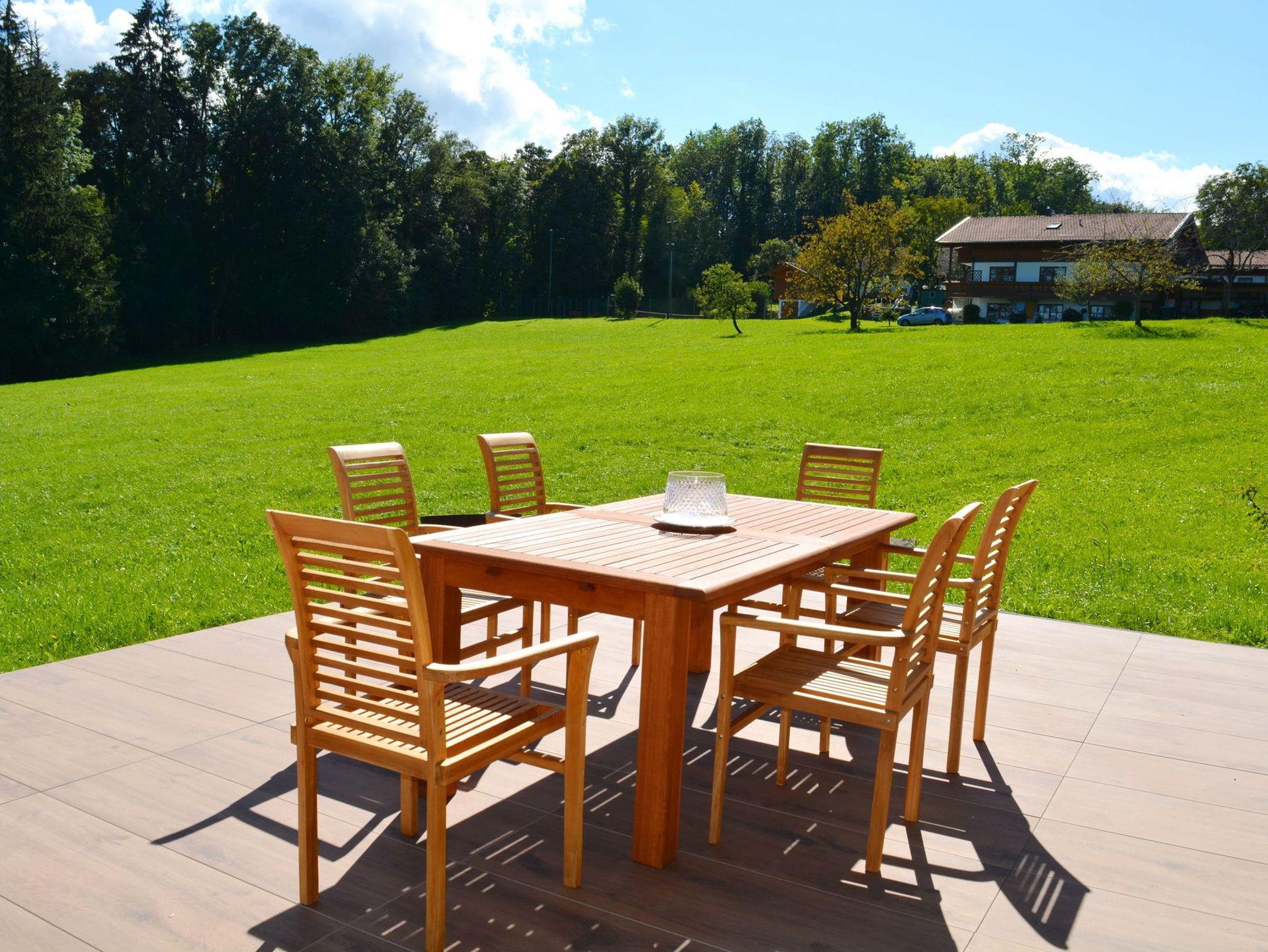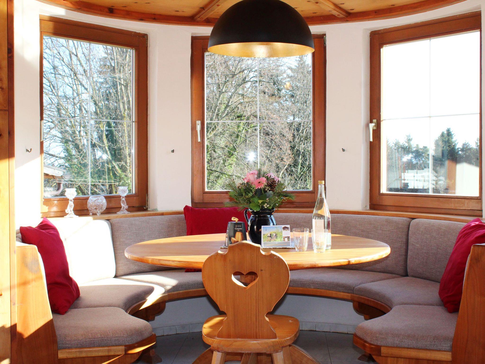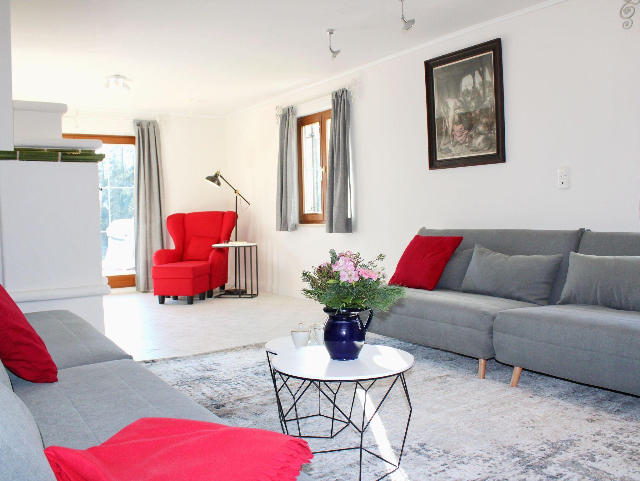 Der helle und großzügige Wohnbereich mit vielen Sitzmöglichkeiten und großem TV lädt zum Entspannen im Erdgeschoss ein. Für kuschelige Wärme sorgt der im typisch bayerischen Stil gehaltene Kachelofen. Die Holzvertäfelung unterstreicht den alpenländischen Charakter des Essbereiches mit Erker, welcher optisch durch den Kachelofen vom Wohnbereich getrennt ist. Hier findet sicherlich jeder seinen Rückzugsort. Die Küche lädt ein, seine Liebsten ausgiebig mit regionalen Köstlichkeiten zu verwöhnen und anschließend entspannt einen erfüllten Tag auf der großen Terrasse und im Garten ausklingen zu lassen. Terrasse und Garten können über den Wohnbereich betreten werden. Zwei Gartensofas laden zur Erholung inmitten der Natur mit wunderschönem Blick auf den Chiemsee ein.