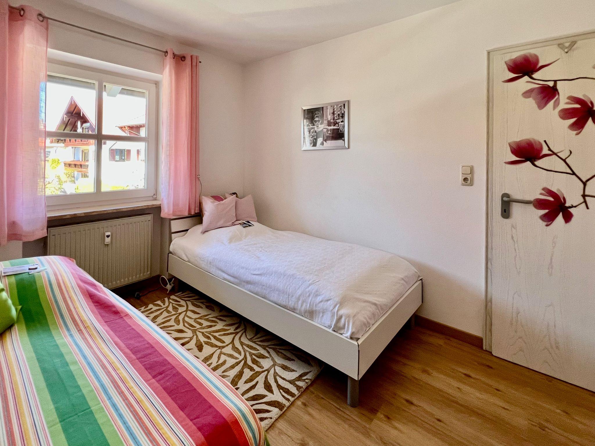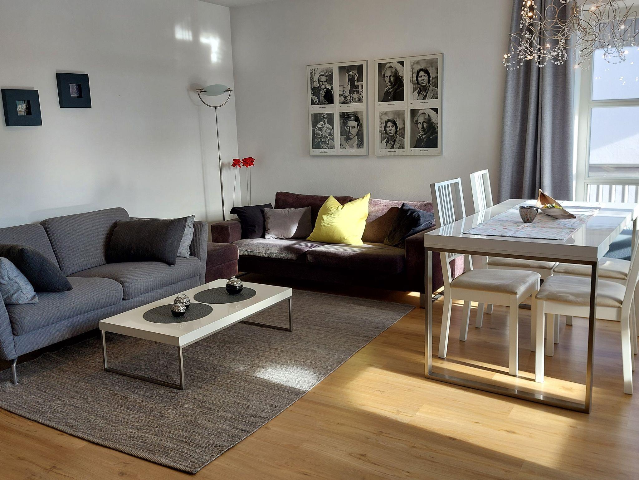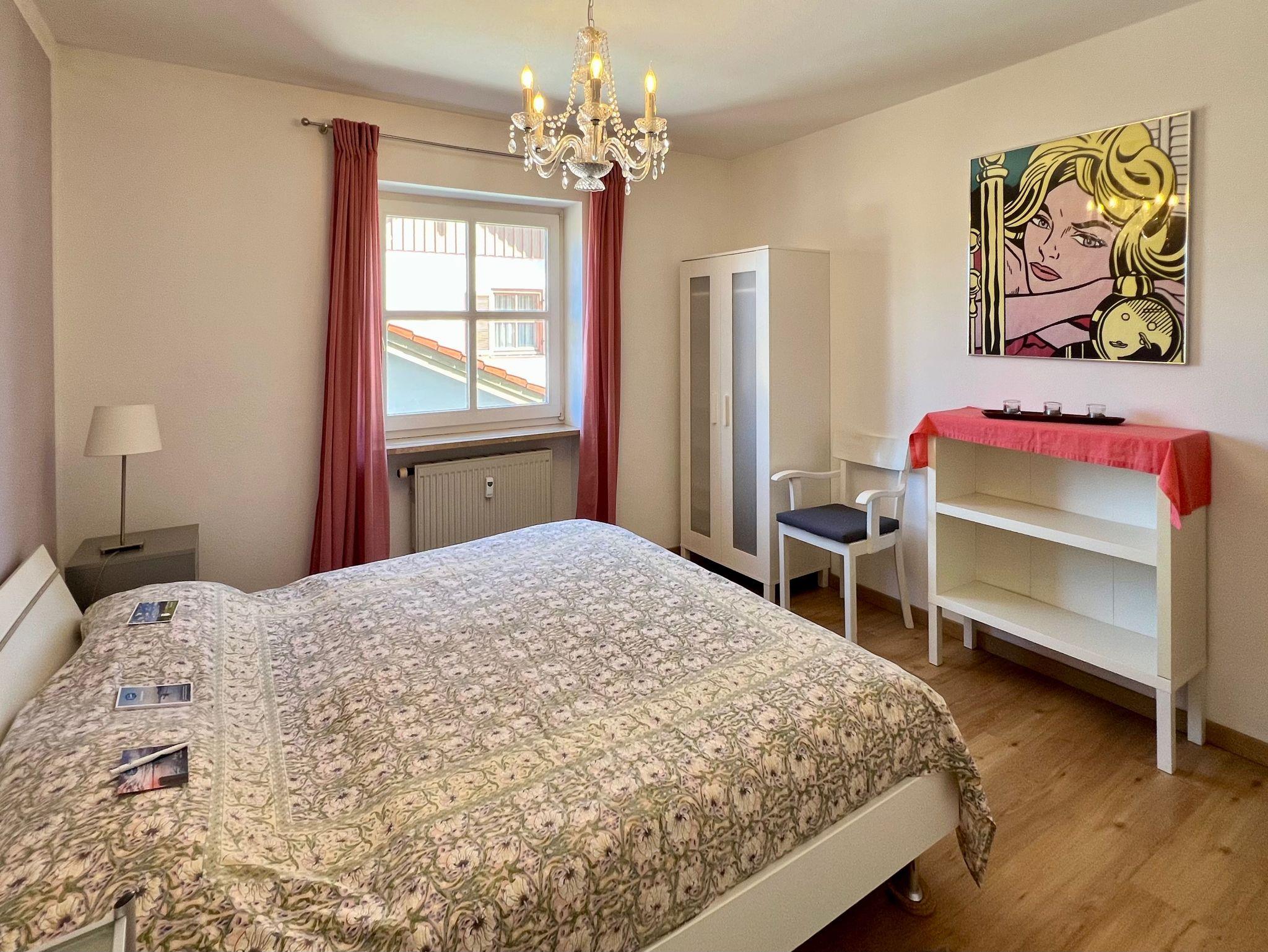 Die top ausgestattete Ferienwohnung besticht durch das lichtdurchflutete, geräumige Wohn-/Esszimmer mit großer, bodentiefer Fensterfront sowie einem überdachtem 15 qm großen Süd- sowie Ostbalkon (incl. Balkonmöbel sowie einer Sonnenliege) mit Blick auf die Berge rund um die Kampenwand. Ein 40-Zoll-Flat-TV und ein schneller WLAN-Anschluss ist selbstverständlich. Im großen Wohnbereich mit 2 Designer Sofas von BoConcept und einem modernen Esstisch mit Aussicht findet auch eine 4-köpfige Familie ausreichend Platz. Die Designer-Einbauküche von NOLTE ist komplett mit Siemens Geräten ausgestattet (Backofen mit Ceran-Kochfelder, Spülmaschine, großer Kühlschrank mit Gefrierfach). Außerdem sind weitere Küchengeräte wie Toaster, Kaffeemaschine, Wasserkocher sowie eine umfangreiche Geschirr-Ausstattung vorhanden. Der gemütliche Küchen-Essplatz an der Fensterfront bietet sich zum Frühstücken bestens an. Das großzügige Schlafzimmer ist u.a. mit einem 1,80 m breiten Doppelbett (2 Einzelbetten mit hochwertigen Matratzen: 1 weiche Matratze, eine härtere Matratze), Schrank und 2 Kommoden ausgestattet. Im Gäste- bzw. Kinderzimmer befinden sich 2 Einzelbetten, die bei Bedarf auch zusammen gestellt werden können (1 1m breites Bett mit mittelfester Matratze sowie ein 90 cm breites Bett mit weicher Matratze).Neben einem geräumigen Bad mit Fenster, Wanne und Wellness-Dusche sowie Waschmaschine und WC gibt es noch ein separates Gäste-WC. Im Eingangsbereich befindet sich ein großer Schiebetüren-Schrank für Ihr Gepäck. Die gesamte Wohnung ist mit einem Design-Parkett-Boden in Eiche natur Optik verlegt.