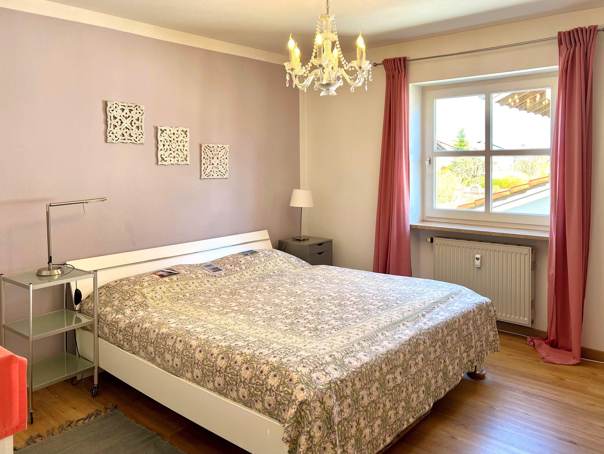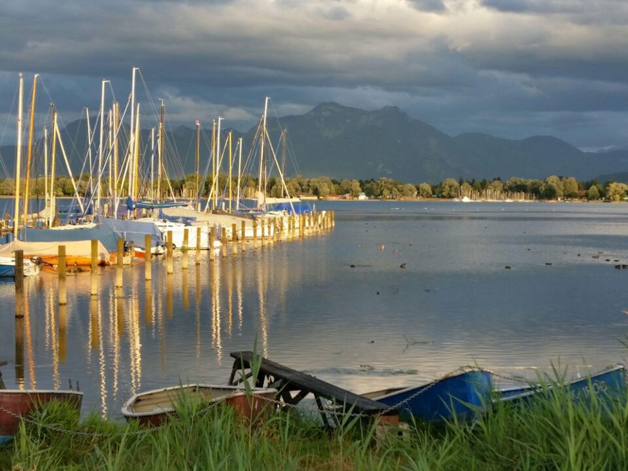 Sehr helle und ruhige 3-Zimmer-Ferienwohnung (87 qm) mit Charme - in Fußnähe zum Chiemsee und sehr nah in die Berge. Modern und komfortabel sowie gehoben möbliert, mit großem Balkon und traumhaften Bergblicken. Sämtliche Freizeit- und Touristen-Attraktionen befinden sich in unmittelbarer Erreichbarkeit. (Für Reha-Besucher: die beiden Medical Park Reha-Kliniken sind ebenso fußläufig erreichbar). Die 87 qm große Wohnung befindet sich im 1. OG eines schönen Wohnhauses – eingebettet in einen großen Garten - in einem ruhigen und gepflegten Wohngebiet Nahe des Chiemsees und der Berge. Die top ausgestattete Ferienwohnung besticht durch das lichtdurchflutete, geräumige Wohn-/Esszimmer mit großer Fensterfront (bodentief) sowie einem überdachtem 15 qm großen Süd- sowie Ostbalkon (incl. Balkonmöbel) mit Blick auf die Kampenwand und die umliegenden Berge. Im großen Wohnbereich mit 2 Designer Sofas und Ottomane (BoConcept) bietet der moderne Esstisch vor der Fensterfront mit Aussicht Platz für bis zu 6 Personen. Ein 40-Zoll-Flat-TV und ein schneller WLAN-Anschluss ist selbstverständlich.Auf dem Süd-Ost-seitigen und überdachten Balkon stehen Balkonmöbel sowie eine Sonnenliege zur Verfügung.Die Design-Einbauküche (NOLTE) ist komplett mit Siemens Geräten versehen (Backofen mit Ceran-Kochfelder, Spülmaschine, großer Kühlschrank mit Gefrierfach). Außerdem weitere Küchengeräte wie Toaster, Kaffeemaschine, Wasserkocher sowie eine umfangreiche Geschirr Ausstattung. Der gemütliche Küchen-Essplatz an der Fensterfront bietet sich zum Frühstücken an. Das großzügige Schlafzimmer ist u.a. mit einem 1,80 m breiten Doppelbett (2 Einzelbetten mit hochwertigen Matratzen: 1 weiche Matratze, eine härtere Matratze), Schrank und 2 Kommoden ausgestattet. Im Gäste- bzw. Kinderzimmer befinden sich 2 Einzelbetten, die bei Bedarf auch zusammen gestellt werden können (1 1m breites Bett mit mittelfester Matratze sowie ein 90 cm breites Bett mit weicher Matratze). Neben einem geräumigen Bad mit Fenster, Wanne und Wellness-Dusche sowie Waschmaschine und WC gibt es noch ein separates Gäste-WC. Im Eingangsbereich befindet sich ein großer Schiebetüren-Schrank für Ihr Gepäck. Die gesamte Wohnung ist mit einem Design-Parkett-Boden in Eiche natur Optik verlegt.