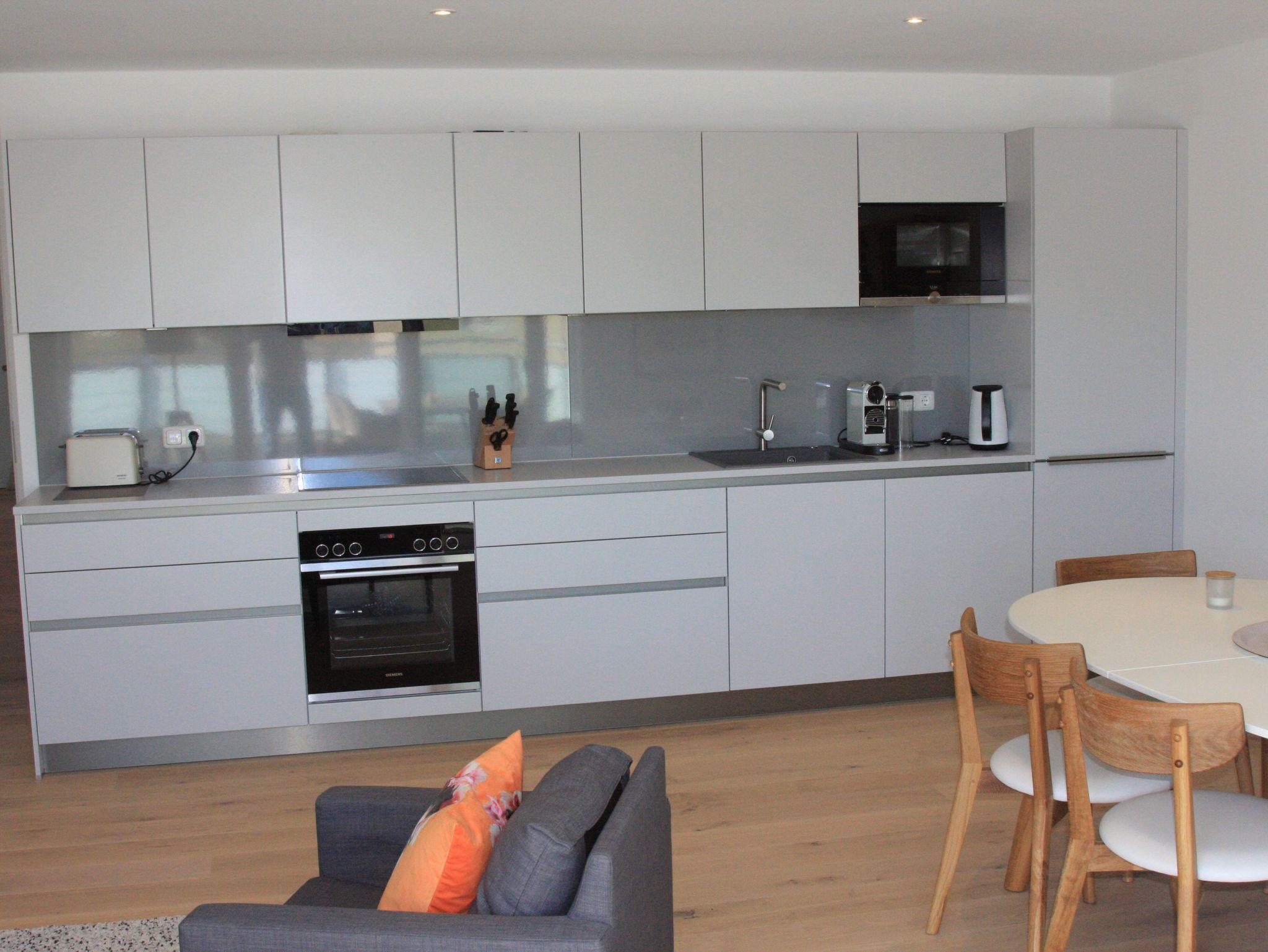Das Wohnzimmer ist sehr geräumig und verfügt über eine hochwertige, offene Küche sowie eine große Fensterfront (bodentief). Dem Wohnzimmer schließt sich eine großzügige, halb überdachte Terrasse an, von der aus man einen herrlichen Blick auf die umliegende Bergkette hat.42-Zoll-Flat-TV und High-Speed WLAN Anschluss sind obligatorisch. Die Küche ist mit hochwertigen Geräten versehen, es gibt einen Backofen, eine separate Miktrowelle und einen Induktionsherd, eine Spülmaschine und einen großen Kühl- und Gefrierschrank. Sie ist außerdem ausgestattet mit einer Kaffeemaschine, Wasserkocher und Toaster. Der Essbereich lädt zum gemütlichen Beisammensein ein. Eines der beiden Schlafzimmer ist ausgestattet mit einem 1,80 m breiten Doppelbett, das zweite Schlafzimmer mit zwei Einzelbetten, die bei Bedarf zusammengeschoben werden können. Darüber hinaus befindet sich in den Schlafzimmern jeweils ein großer Kleiderschrank. Das geräumige Bad mit Dusche enthält außerdem einen Wasch-Trockner.