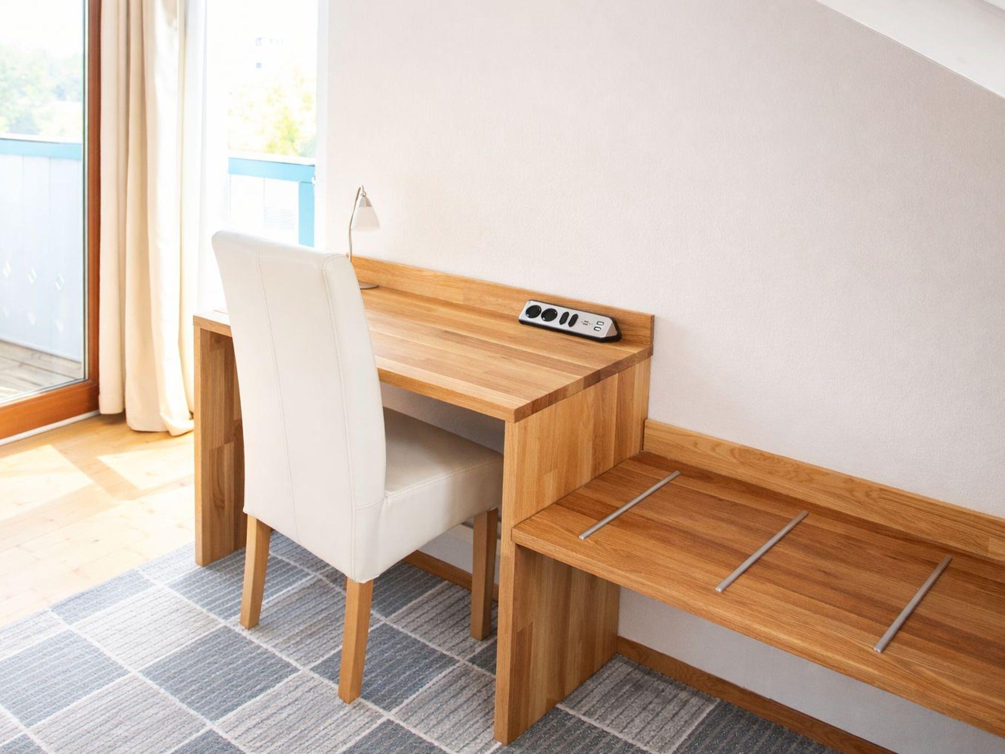 Ein schicker Arbeitsplatz macht die Wohnung ideal für Gäste, die auch im Urlaub produktiv bleiben möchten.