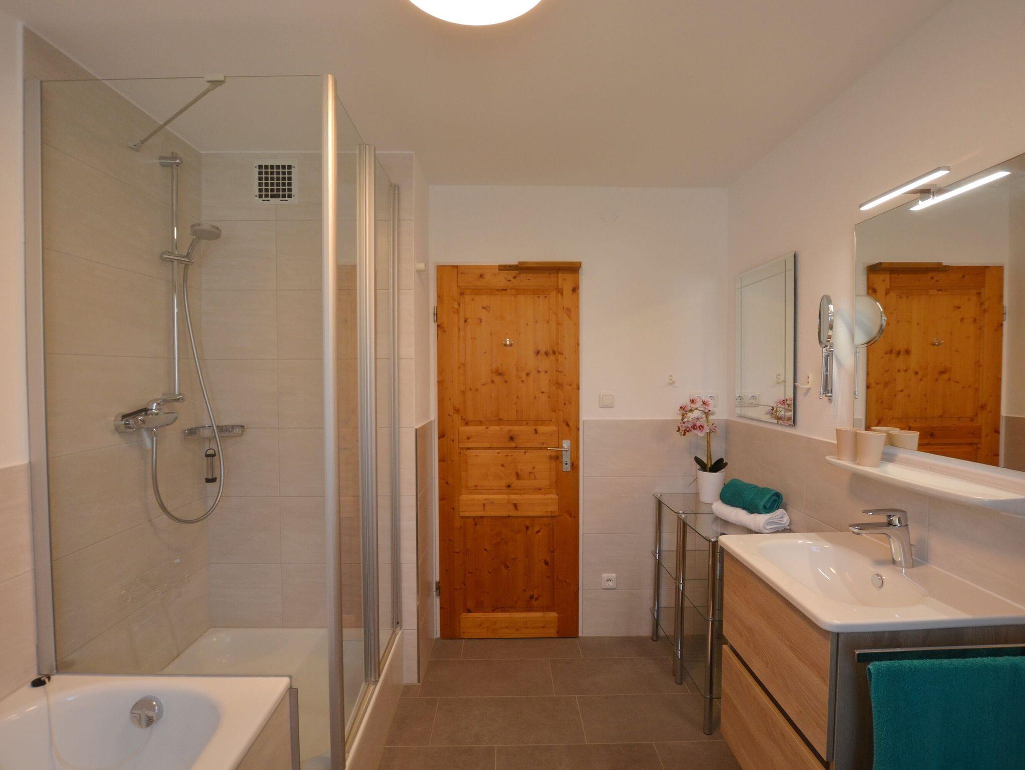 Das moderne Badezimmer bietet mit Badewanne, separater Dusche und WC besonderen Komfort. Der Südbalkon, direkt vom Wohnbereich aus zugänglich, lädt zu sonnigen Stunden und entspannten Abenden mit Blick auf die Berge ein.