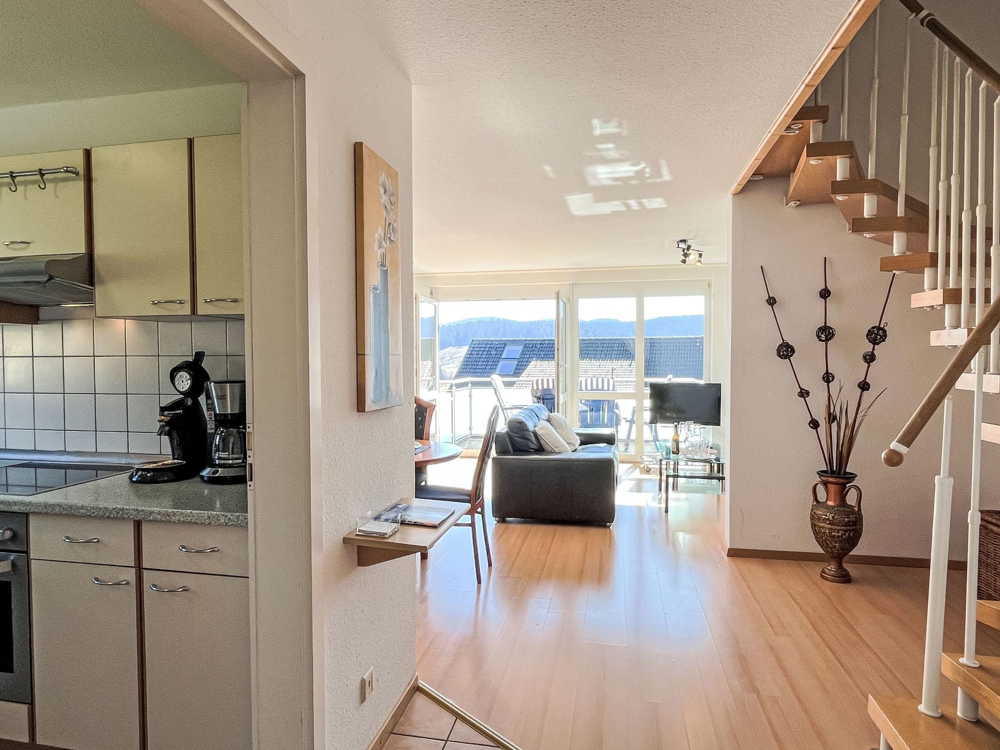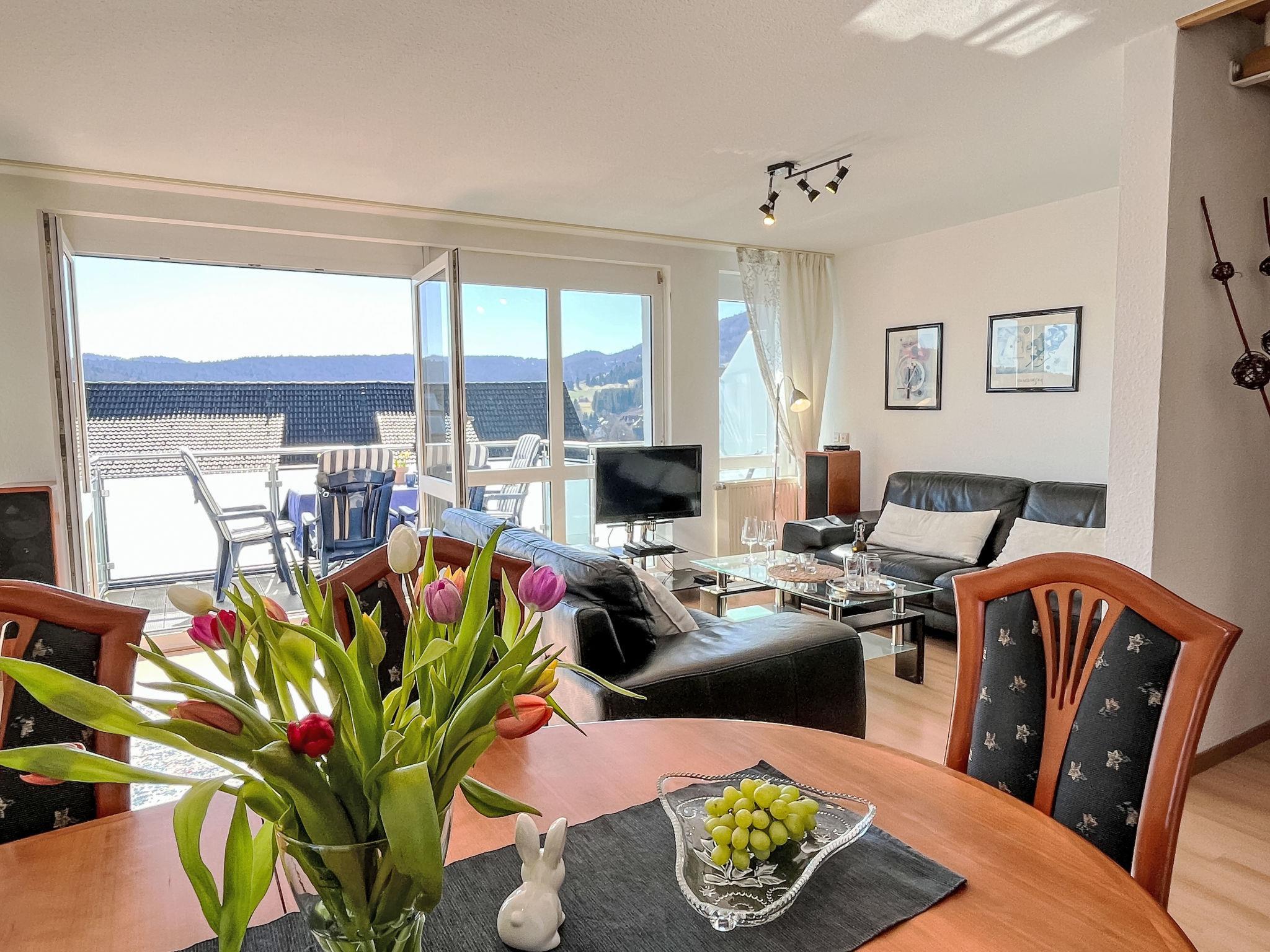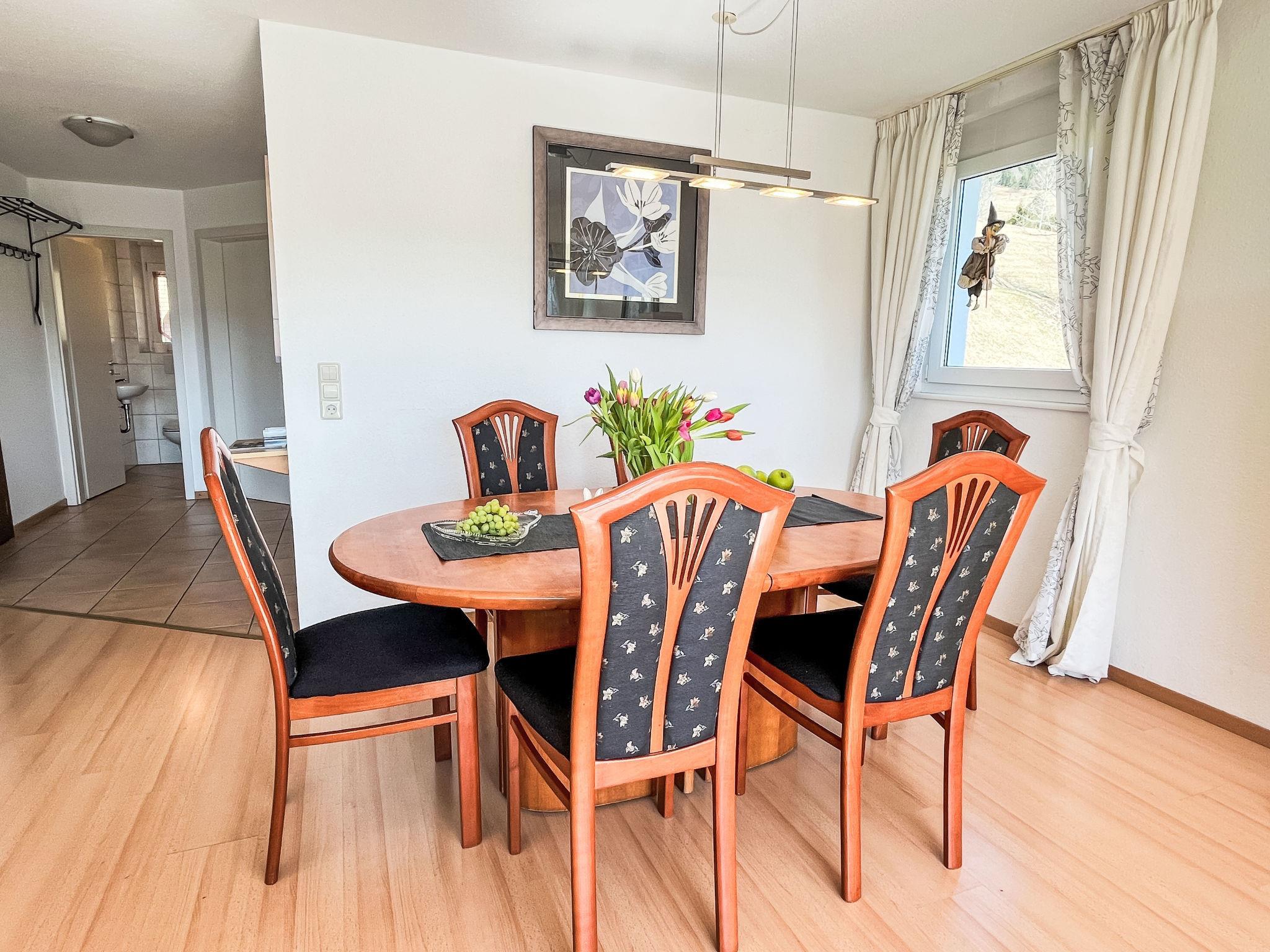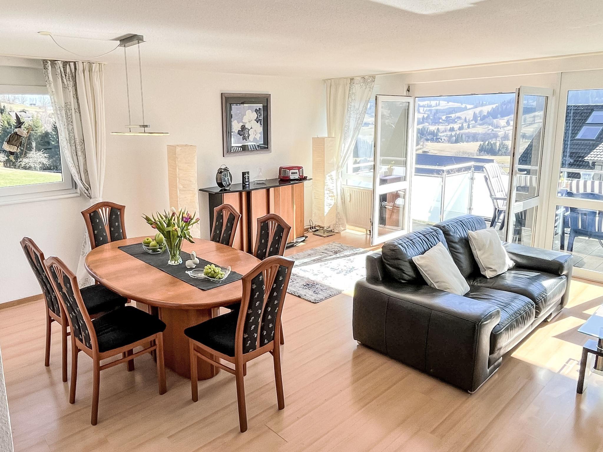 "Schwarzwaldblick IV", 5-room apartment 120 m2 on 2 levels. Practical furnishings: living/dining room with dining nook. Exit to the balcony. 1 room with 1 double bed (1 x 180 cm, length 200 cm). Kitchen (oven, dishwasher, 4 ceramic glass hob hotplates, toaster, kettle, microwave, electric coffee machine). Sep. WC. Upper floor: 2 rooms, each room with 1 double bed (1 x 180 cm, length 200 cm). 1 room with 1 x 2 bunk beds (90 cm, length 200 cm). Bath/shower/WC. Heating. Balcony. Balcony furniture. Facilities: children's high chair, baby cot. Internet (WiFi). Parking (2 cars). Please note: non-smokers only. Smoke alarm.
