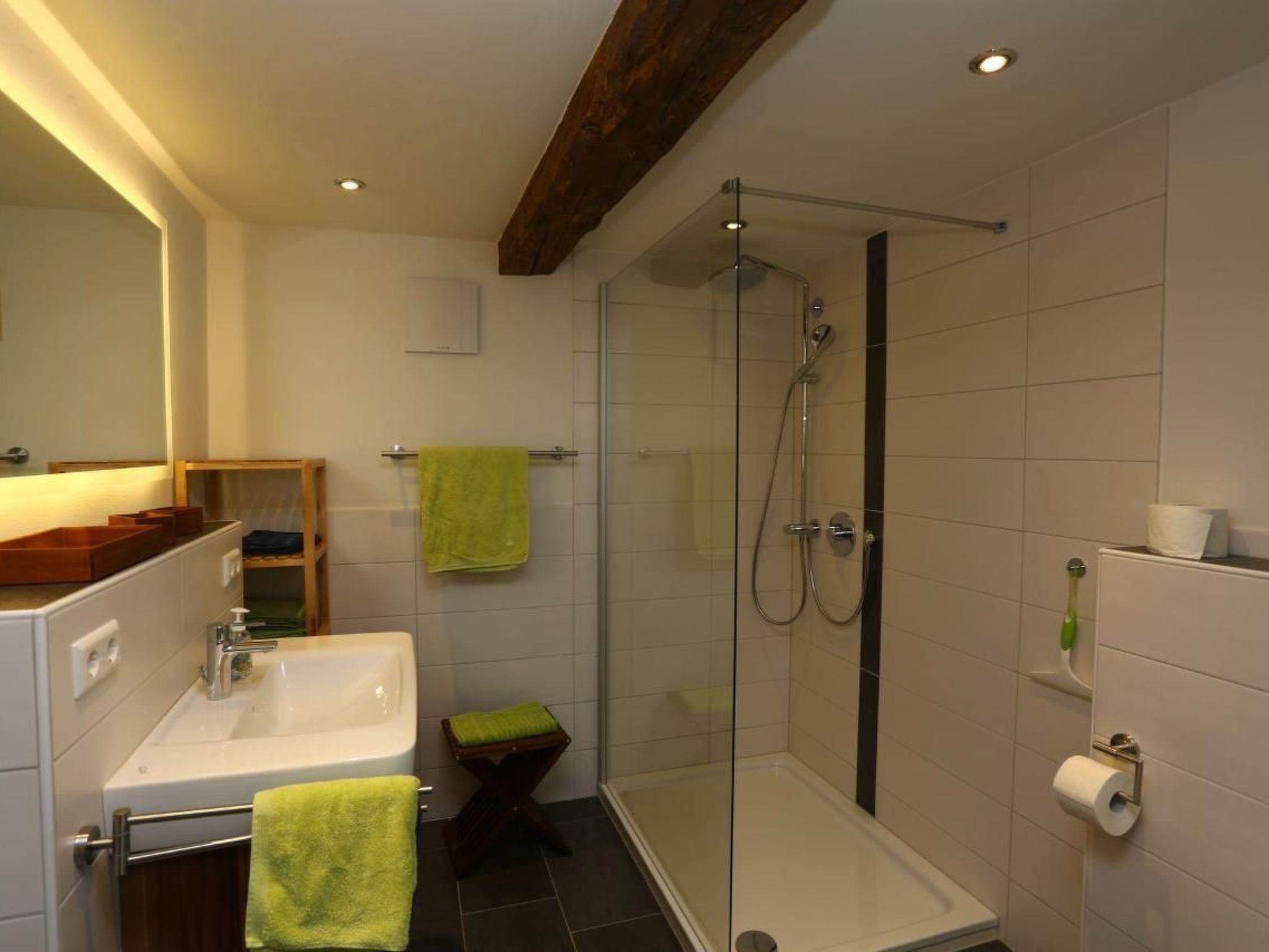 The 160m² holiday flat boasts a spacious layout for up to 4 people, ideal for families or small groups looking for something special (can be extended for up to 6 people on request). A highlight is the historic "Stube" with its 200-year-old tiled stove, which invites you to linger in a cosy atmosphere. The modern kitchen retains the charm of the original, including the soot-blackened beams, and is well equipped with a modern induction hob, oven, microwave, dishwasher and a fully automatic coffee machine. The bedrooms on the upper floor offer a historic ambience with original refurbished beds and antique wardrobes. Two modern shower bathrooms, one on each floor, complete the interior design and offer additional comfort alongside a rain shower and underfloor heating in the ground floor bathroom.