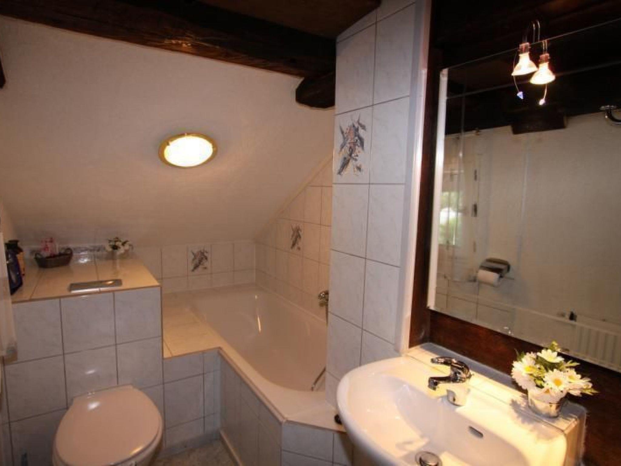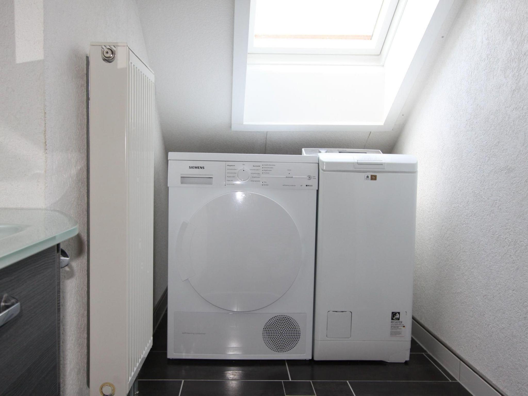 The holiday home is divided as follows: Ground floor: 1 fully equipped eat-in kitchen (main kitchen, 27 m²) with corner bench and large table for up to 14 people, ceramic hob (4 hotplates), oven, fridge-freezer, dishwasher, coffee machine, toaster, kettle and everything you need for up to 14 people (crockery, glasses, cutlery....) with access to the south-facing balcony 1 bedroom (16 sqm) with bathroom (shower/washbasin/WC) 1st floor: 1 bedroom (16 sqm) with double bed and armchair bed; washbasin and access to the balcony 1 TV room with satellite TV (20 sqm), white designer leather couch 1 kitchenette (modern fitted kitchen) with ceramic hob, oven, dishwasher, coffee machine, kettle, toaster, fridge with freezer compartment. This kitchenette can be booked on request for an additional charge 1 bathroom with washbasin/bathtub/WC 1 bathroom with shower/washbasin/WC (height approx. 1.80, shower approx. height 1.75), washing machine, tumble dryer Top floor: 1 reading room (12 sqm) with 2 sofa beds and table + wall of books 1 bedroom (16 sqm) with double bed (2 single beds) and washbasin, access to balcony 1 bedroom (16 sqm) with double bed and shower; 1 room (7 sqm) with futon bed (1.40 x 2.00) 1 small room (6 sqm) with 2 single beds (2 x 0.80 x 2.00) 1 bathroom with bathtub/2 washbasins/WC