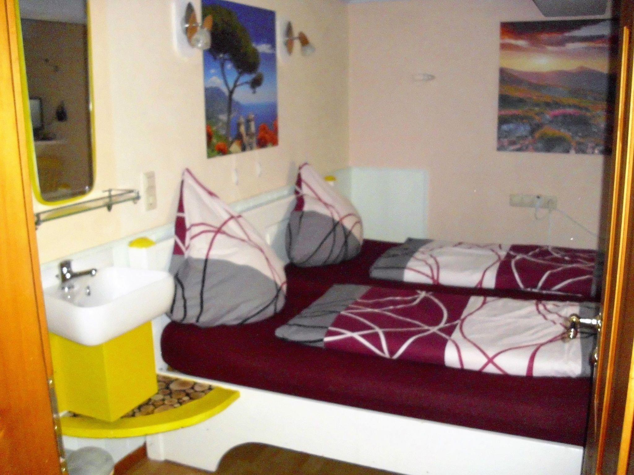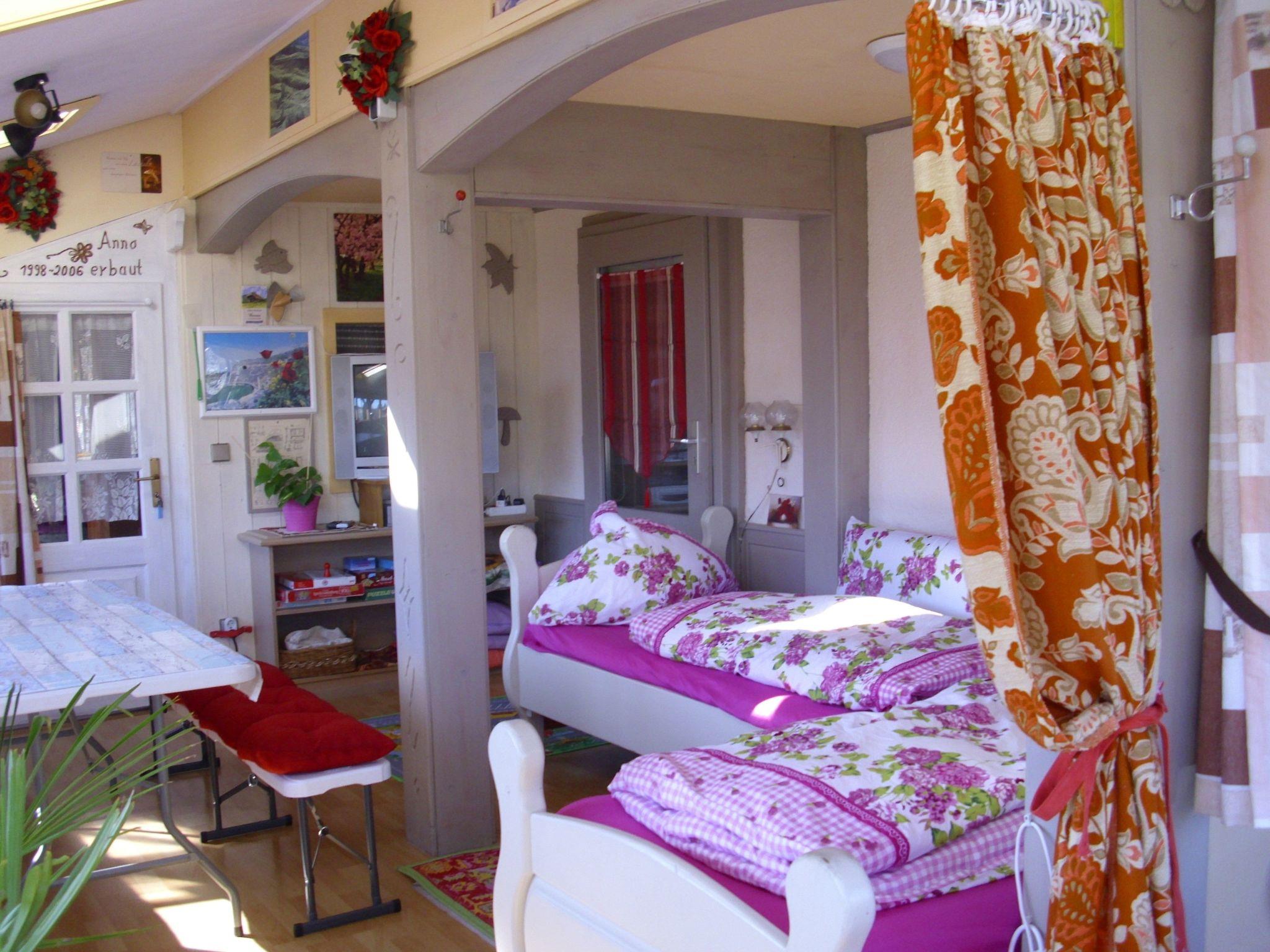 Inside, you will find a cosy bedroom with a double bed, while the heated conservatory has two additional single beds. The spacious kitchen is equipped with a gas hob, electric oven, toaster, kettle, fridge and a small freezer. A tiled stove provides additional cosiness - particularly popular in the cooler months. In the living room you will find another tiled stove, a comfortable couch, satellite TV, hi-fi system, DVD and VHS recorder as well as a record player, complemented by a selection of records, books, MCs, CDs and DVDs on the 1st floor.