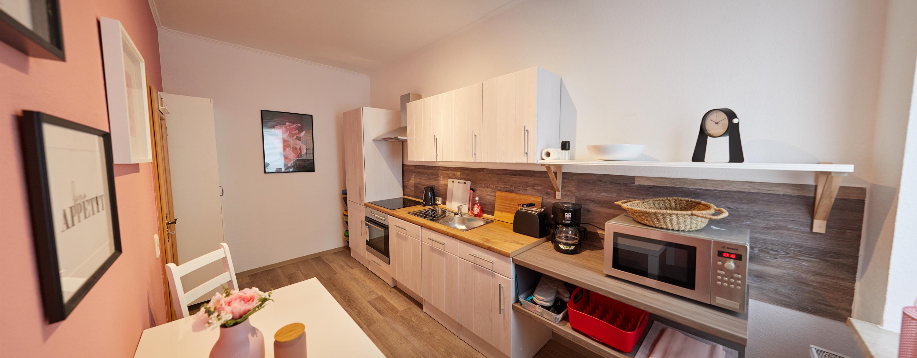 Die Küche ist mit Kaffeemaschine, Toaster, Wasserkocher, Mikrowelle, Kühlschrank und Geschirrspüler ausgestattet.