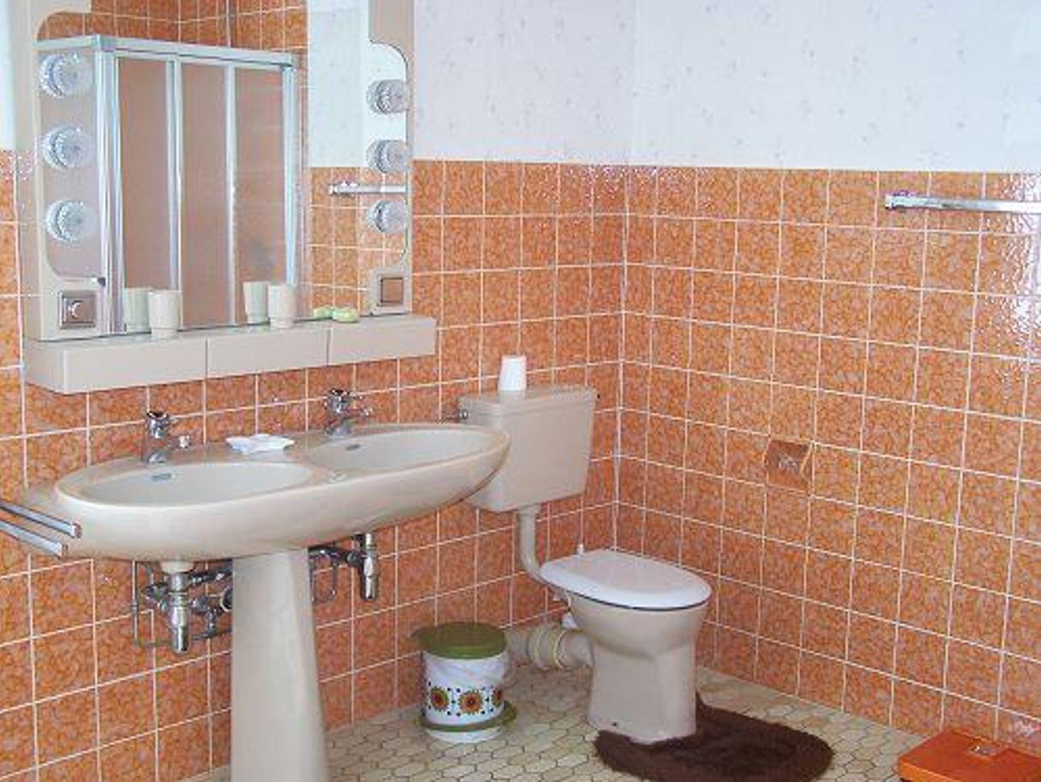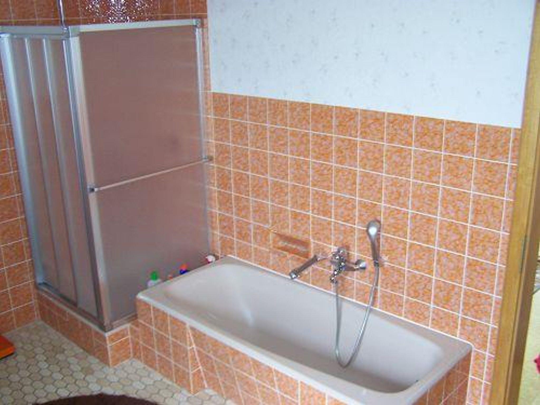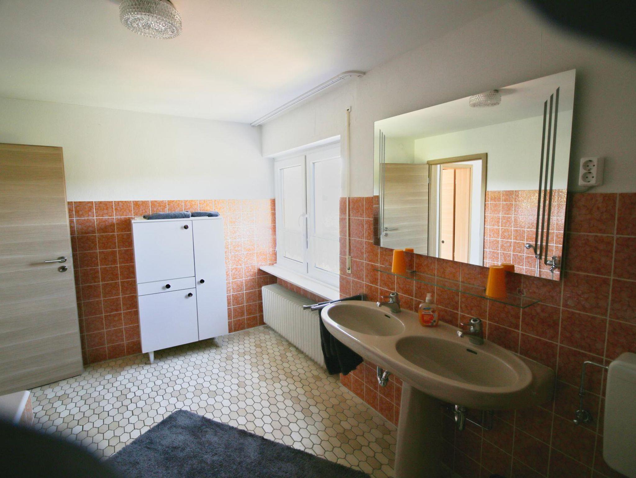 * das Bad ist ca. 16 qm groß mit Badewanne, Dusche und WC, Doppelwaschbecken