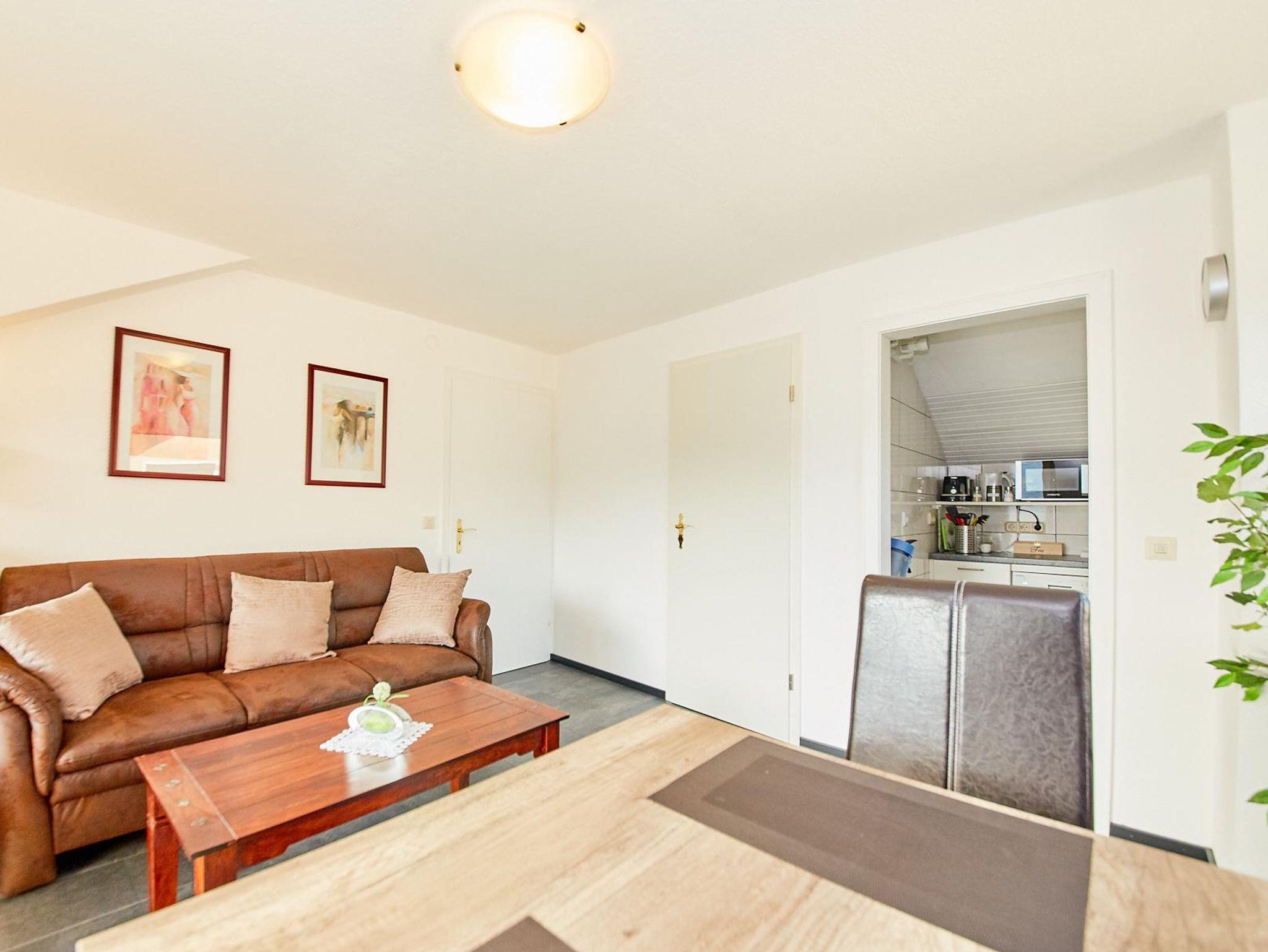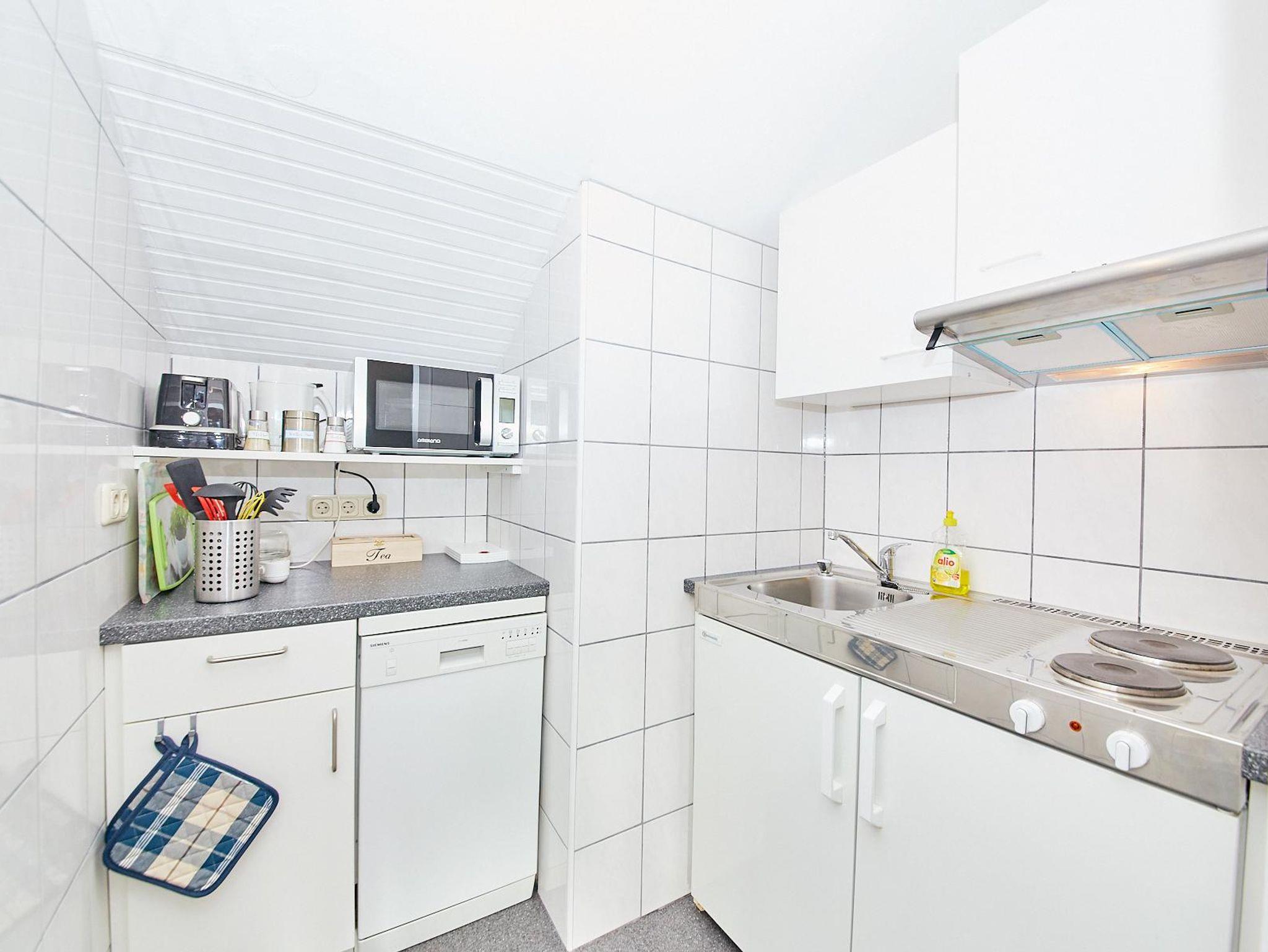 Die kleine Küchenzeile umfasst eine Spülmaschine, einer Doppelkochplatte, Kühlschrank mit einem kleinen Gefrierfach, sowie sämtliche Küchenutensilien, ein Kombi - Gerät - das sowohl als Mikowelle, als auch als kleiner Backofen genuzt werden kann und eine Senseo - Pet - Maschine. Zusätzlich ist das Aufbrühen von Filterkaffee möglich, um Ihren Kaffeegenuss induviduell zu gestalten. Obwohl das Apartment offizell Platz für vier Personen bietet, empfehlen wir aufgrund der kompakten Küchenzeile die Nutzung vorwiegend durch drei Personen.