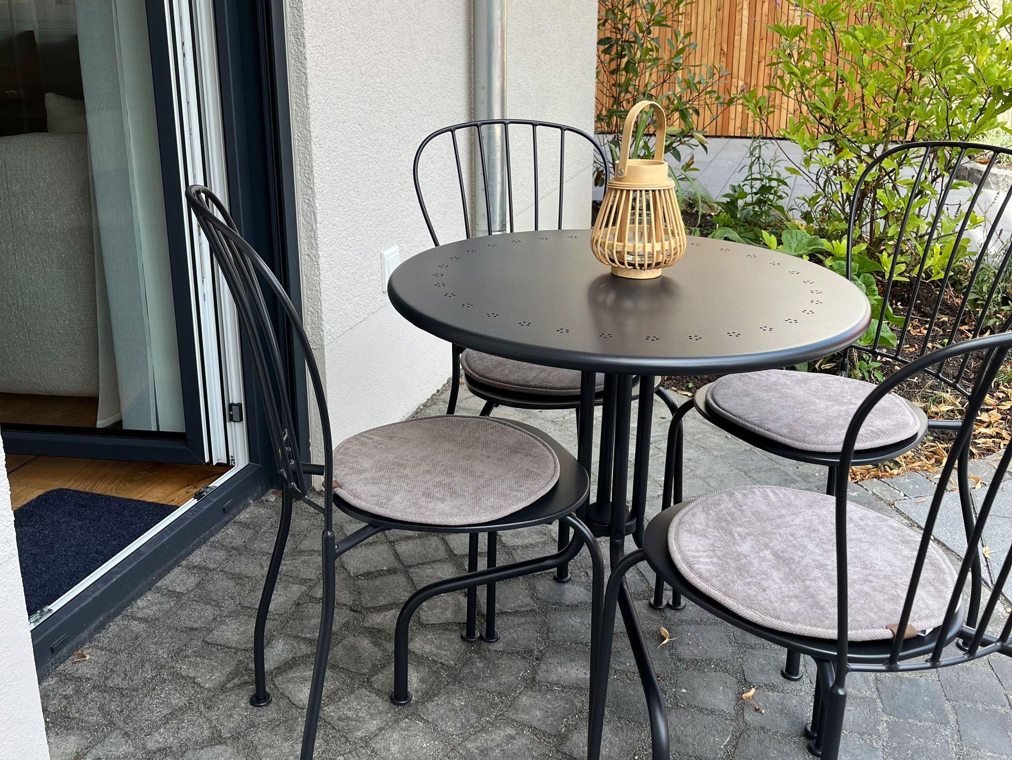 Zur Wohnung gehört ein eigener kleiner Freisitz mit Bistrotisch und Sitzgelegenheiten. Weitere Sitzmöglichkeiten im Freien zum Grillen, Chillen oder geselligen Beisammensein mit anderen Gästen finden Sie im moselbleibe Gästegarten und im idyllischen Innenhof des angrenzenden Winzerhauses.
