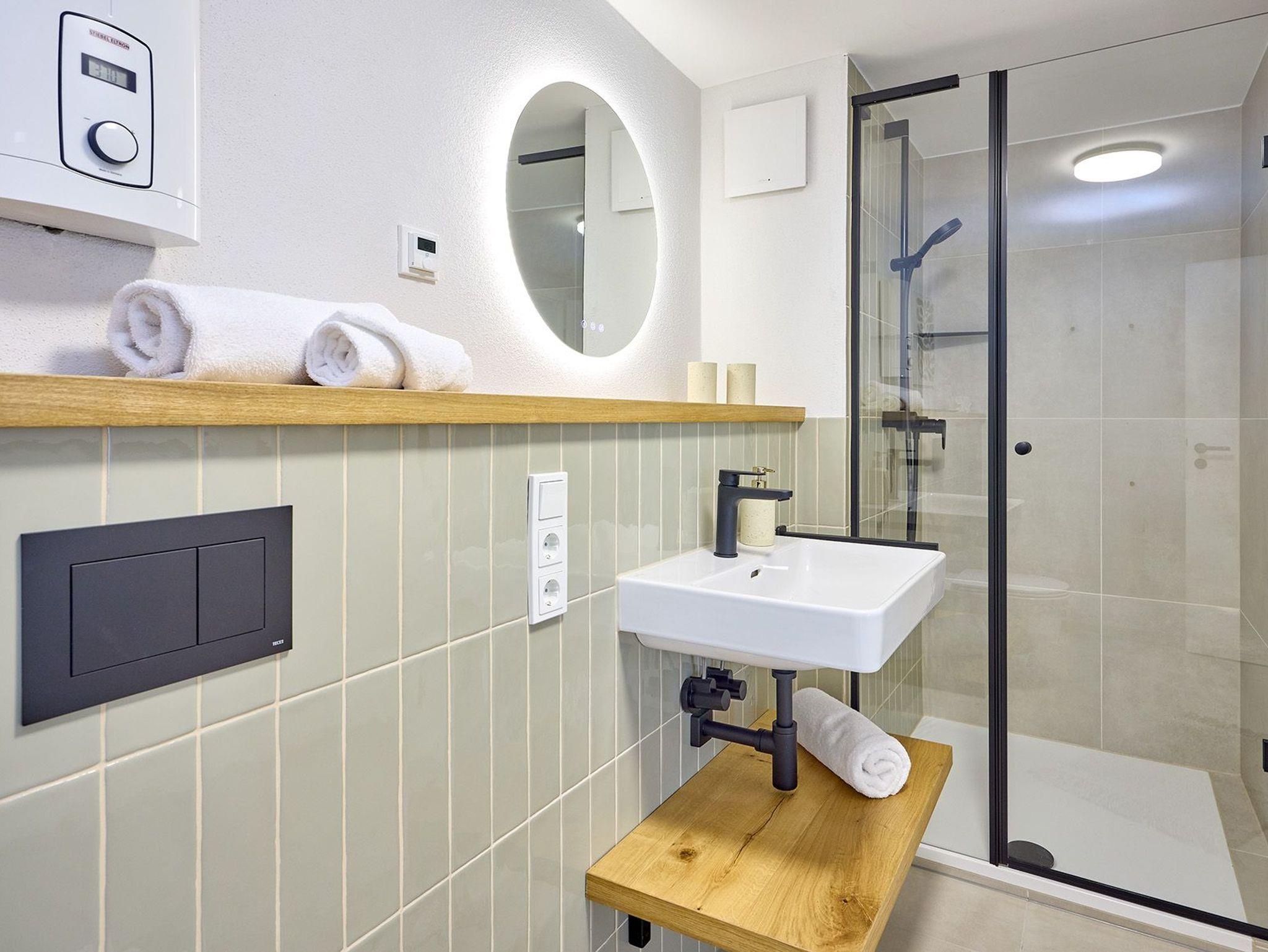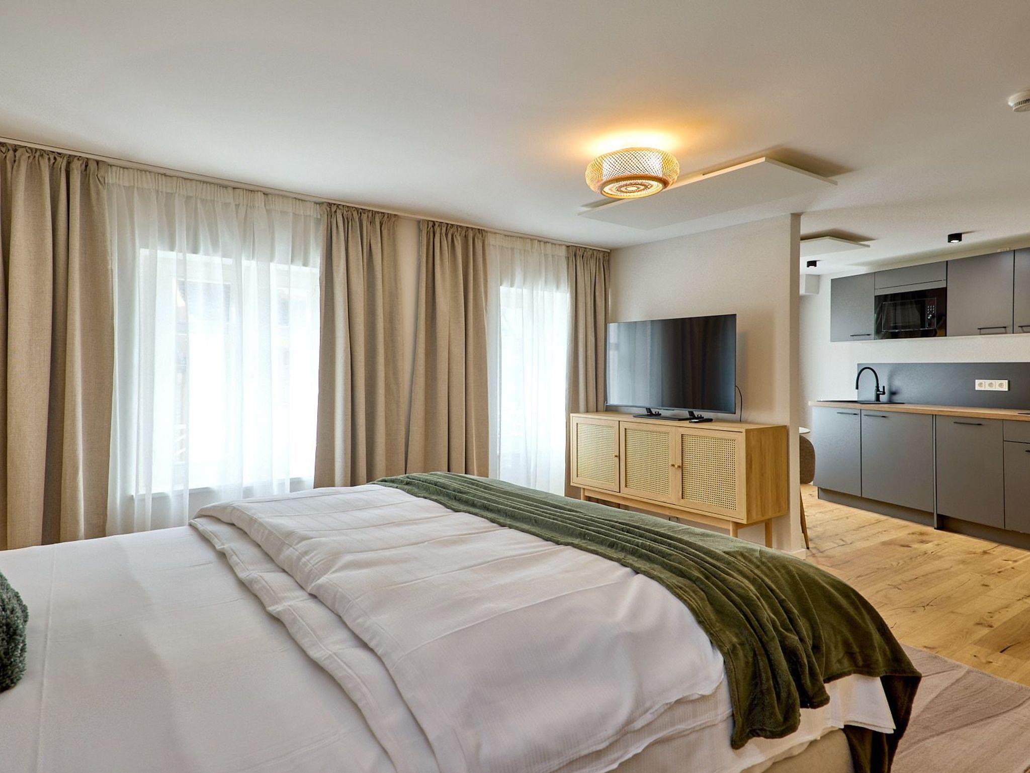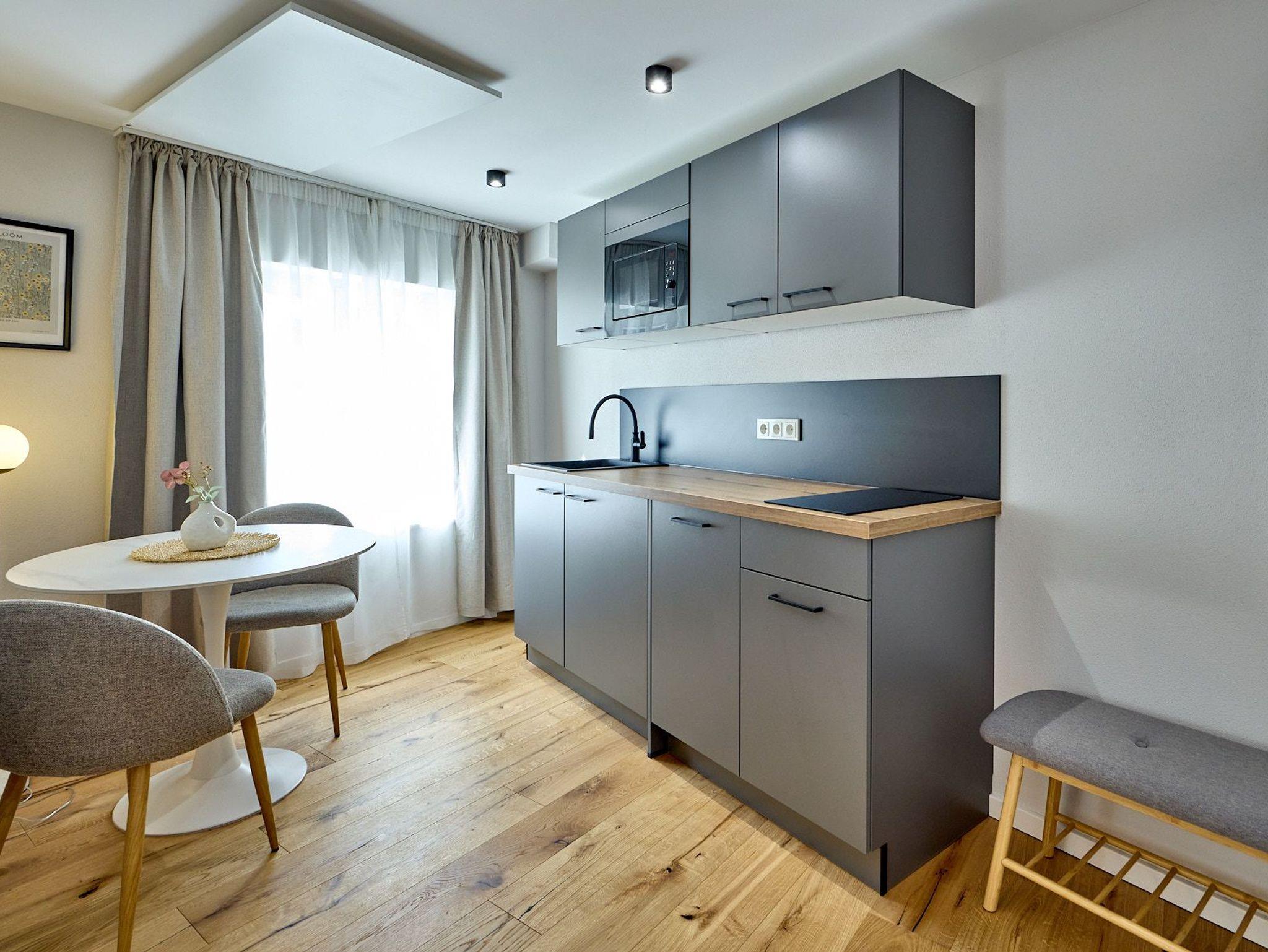 topmodernes Wohlgefühl. Kostenloses WLAN und Smart-TV und eine voll ausgestattete Kitchenette (2-Plattenherd, Spülmaschine, Kombi-Mikrowelle) sind in allen