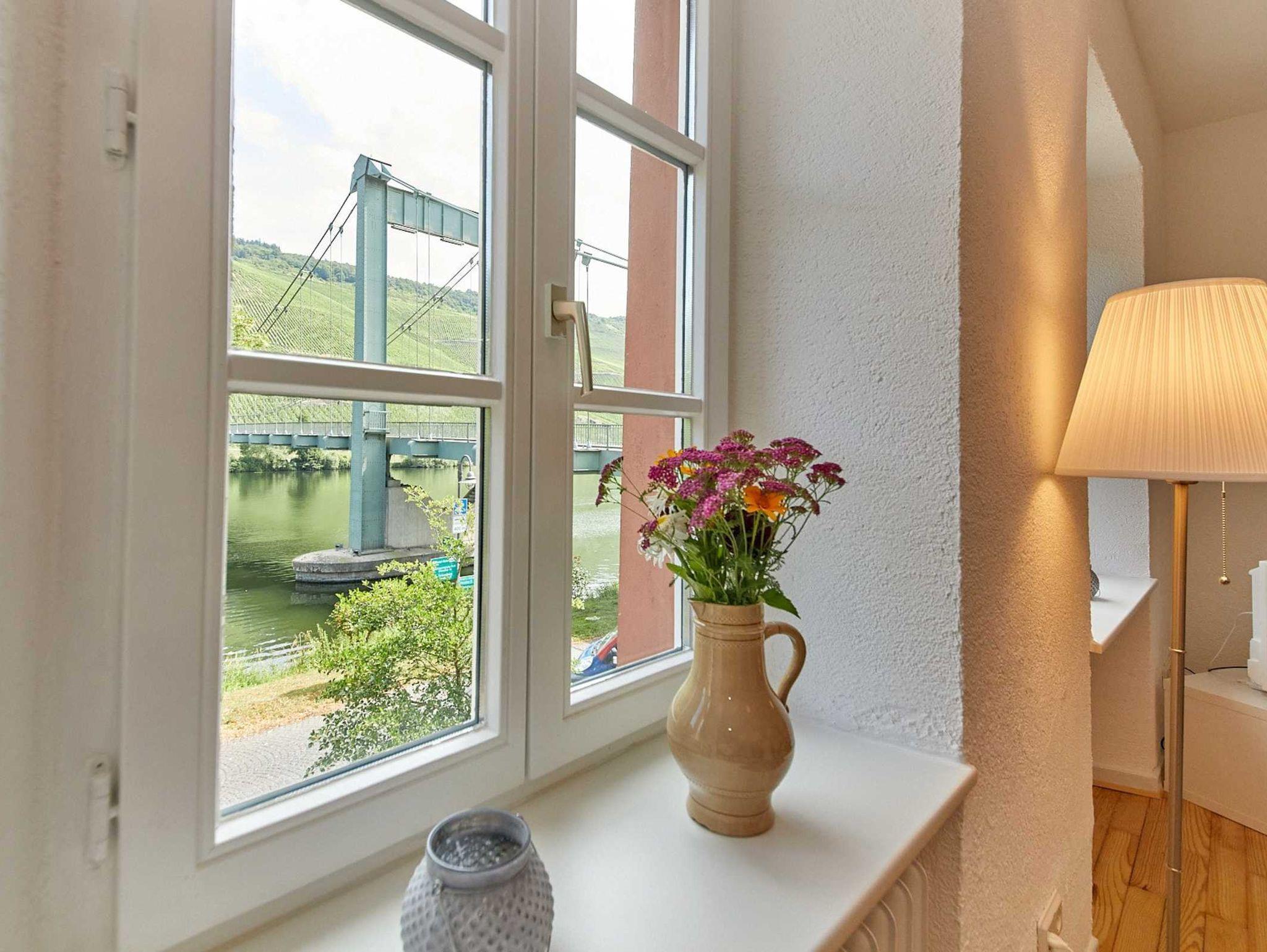 Die Ferienwohnung befindet sich auf der 1. Etage des denkmalgeschützten ehemaligen Weinguts direkt am Moselufer von Bernkastel-Kues im Ortsteil Wehlen. Die 50 qm große Wohnung für 2 - 4 Personen verfügt über eine separate und voll ausgestattete moderne Küche mit Sitzgelegenheit, einem großzügigen, offenen Wohn-/Essbereich mit Blick zur Mosel, ein Doppelschlafzimmer sowie ein modernes Bad mit großzügiger Walk-in-Dusche. Im Wohnzimmer steht ein Schlafsofa als zusätzliche Schlafmöglichkeit für 2 Personen zur Verfügung.