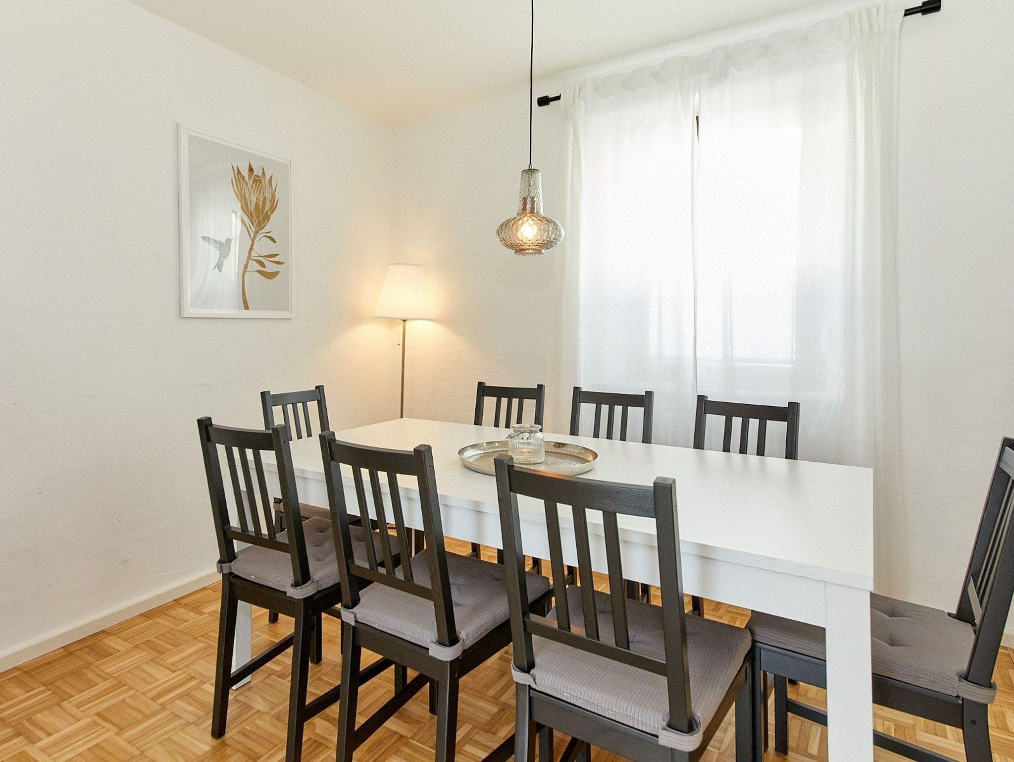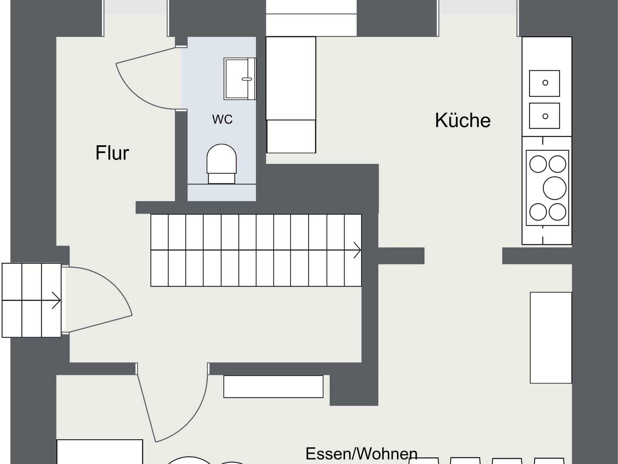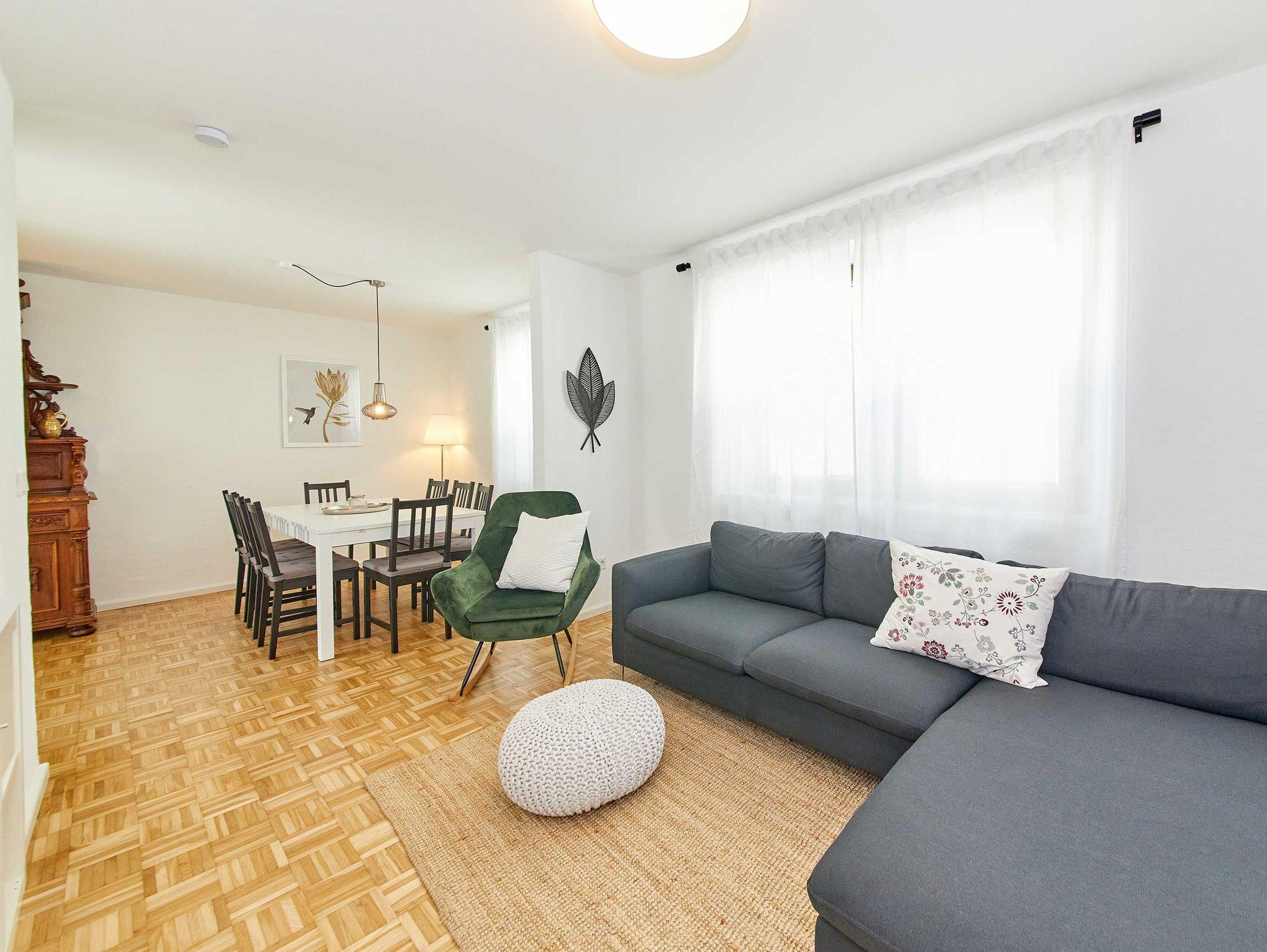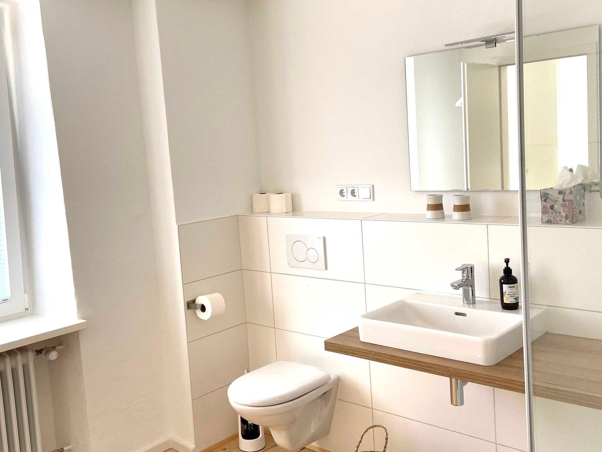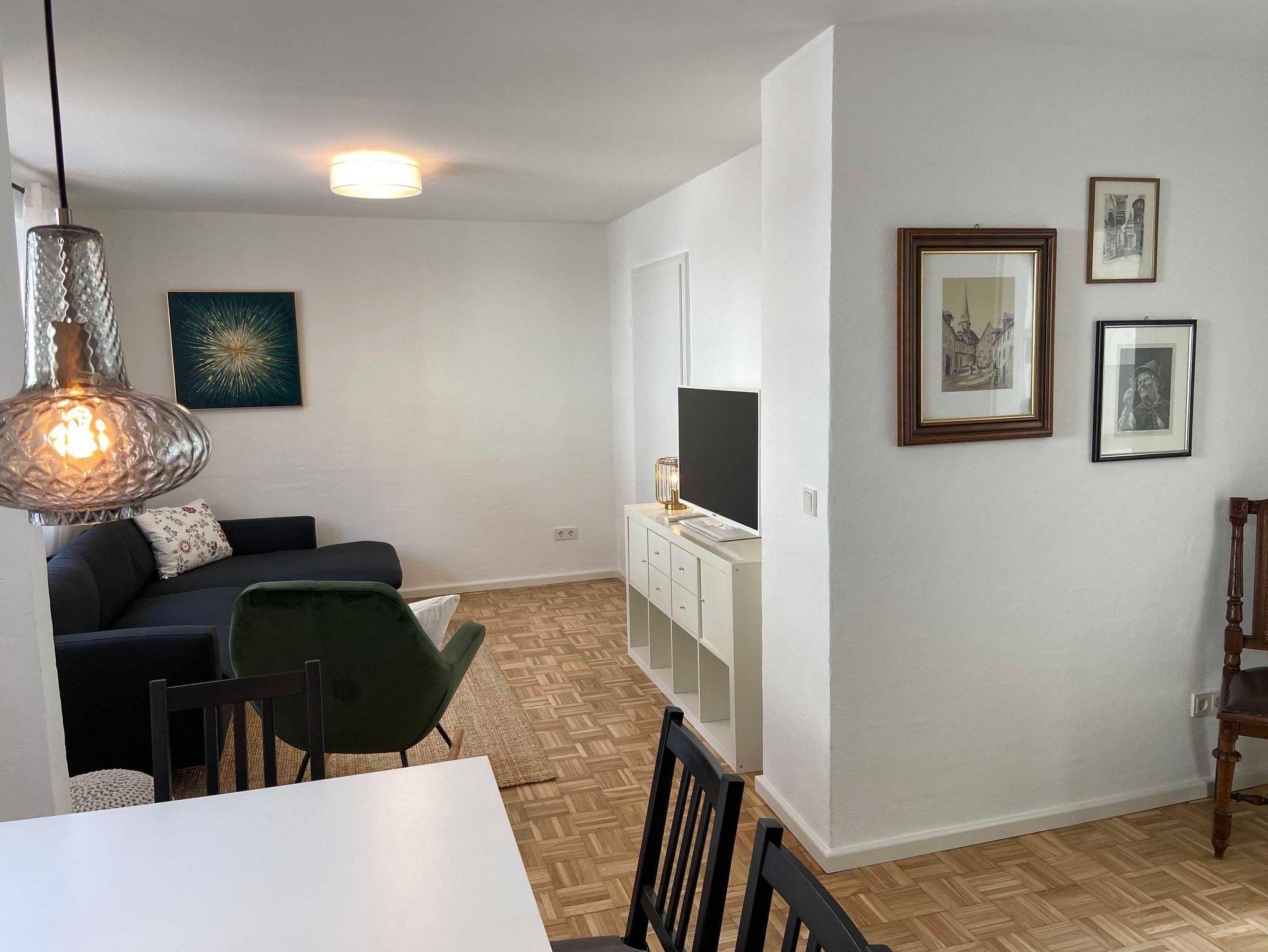 Im Erdgeschoss des ehemaligen Winzerhauses befinden sich eine großzügige voll ausgestattete Küche mit direktem Zugang zum Balkon und phantastischem Blick zur gegenüberliegenden Burg Landshut, ein offener Wohn- und Essbereich für bis zu 8 Personen sowie ein Gäste-WC.