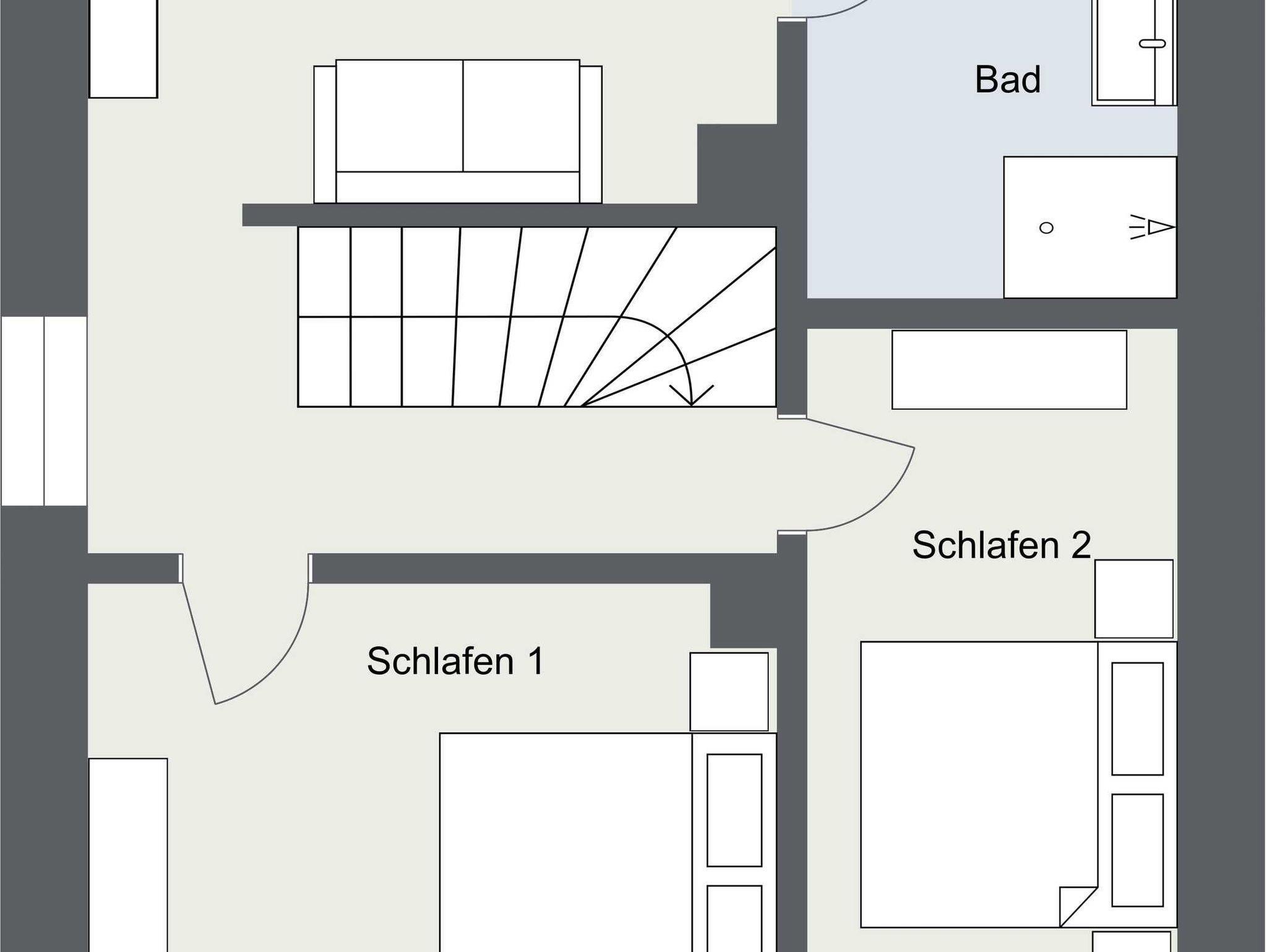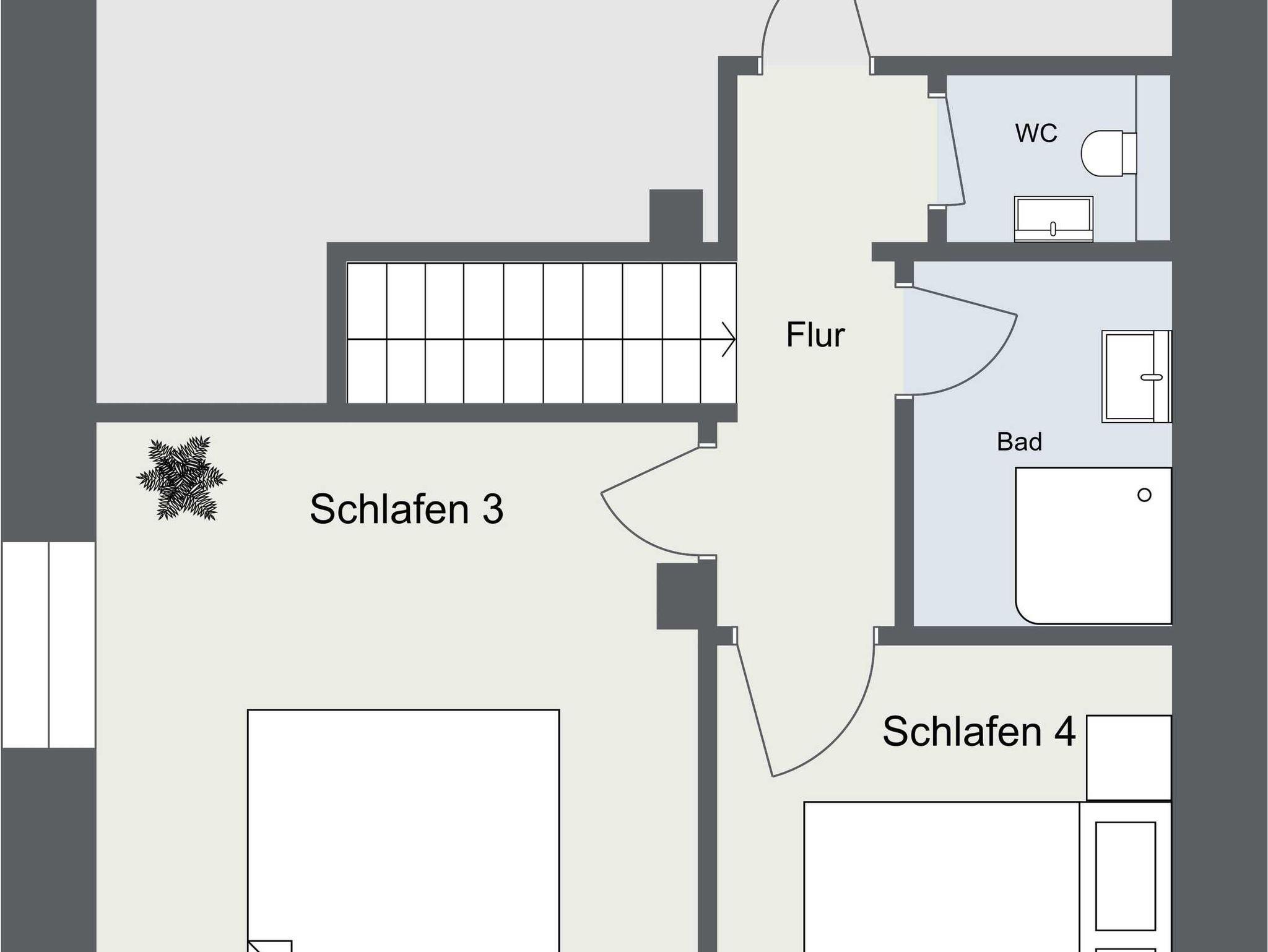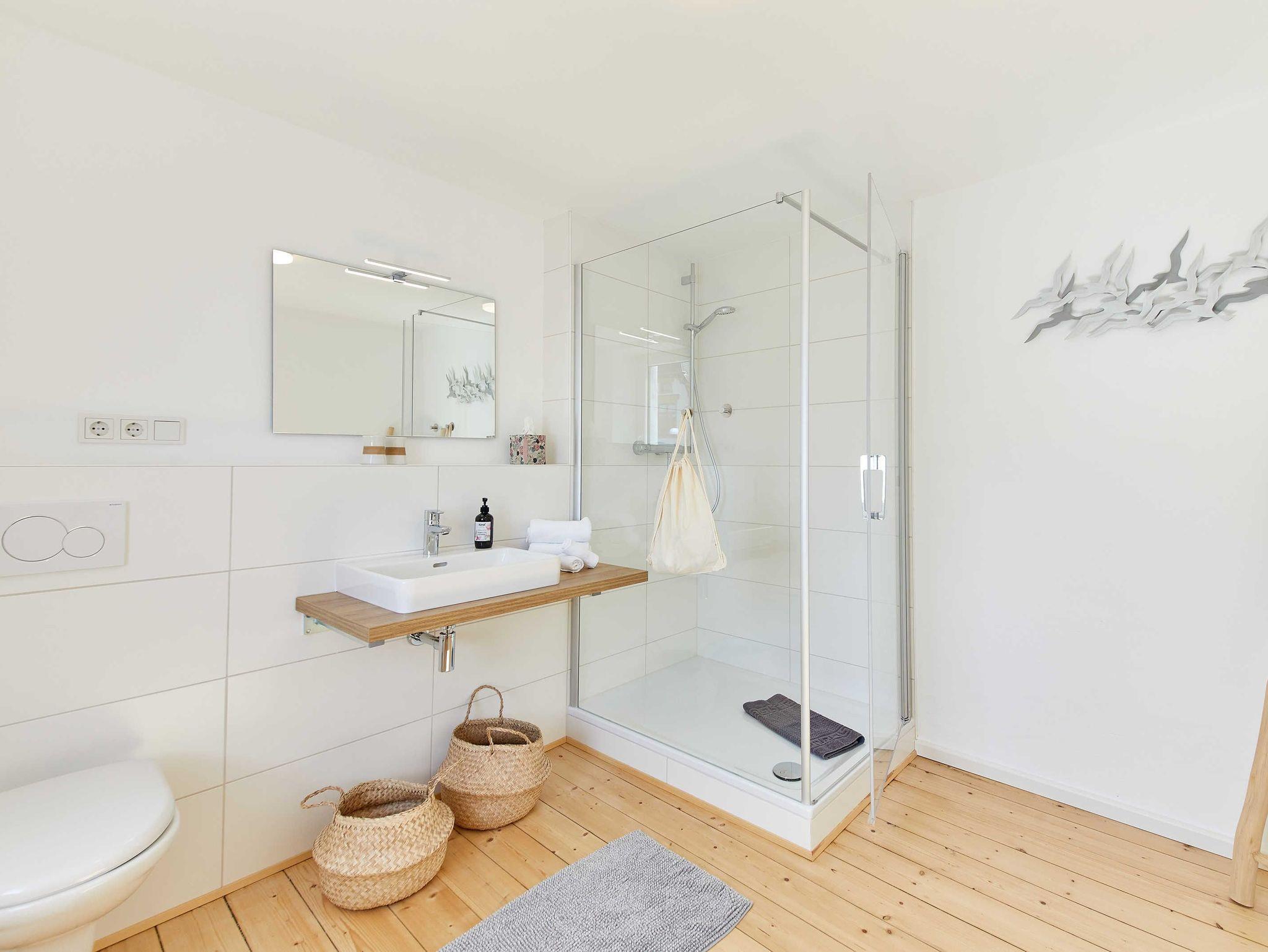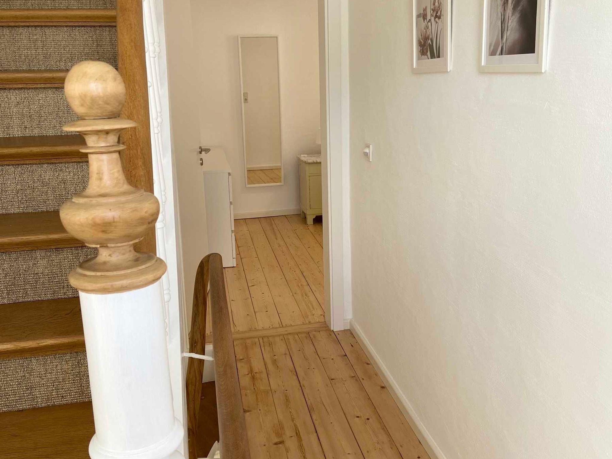 Das Obergeschoss verfügt über zwei Doppelschlafzimmer, ein großes Duschbad mit Holzdielenboden sowie über ein gemütliches Lese- und Lounge-Zimmer. Im Dachgeschoss des Hauses befinden sich zwei Doppelschlafzimmer, ein Duschbad und ein separates WC.