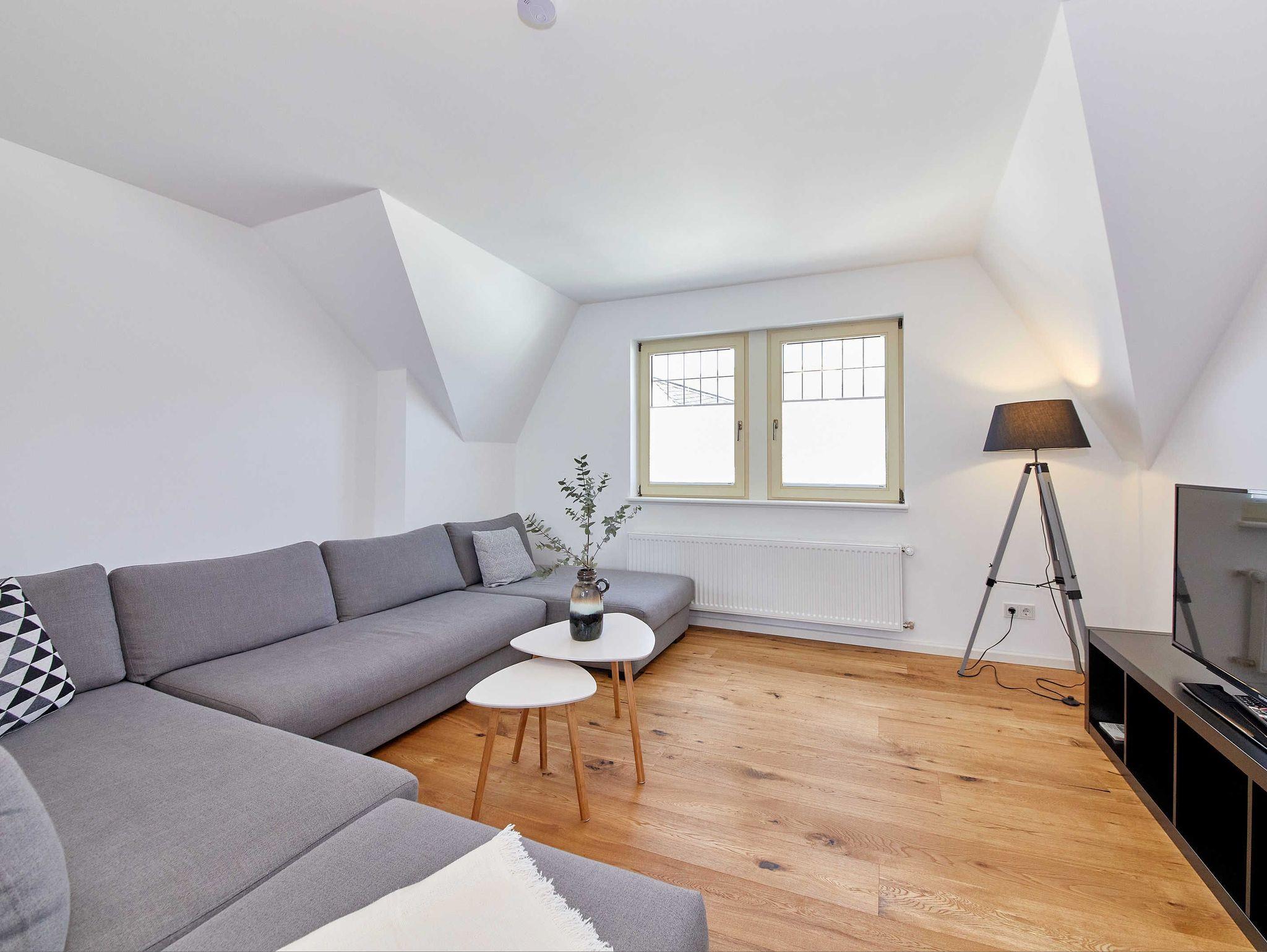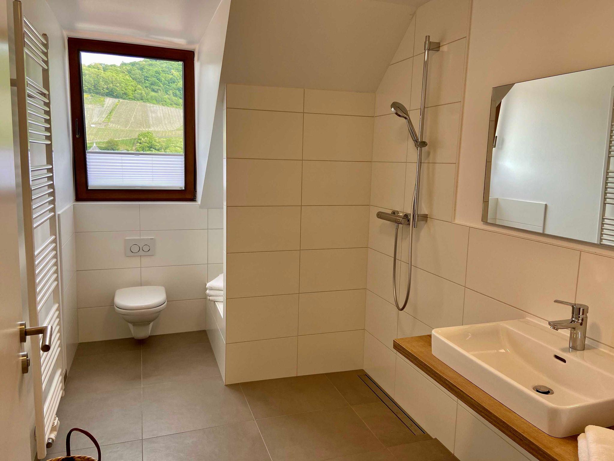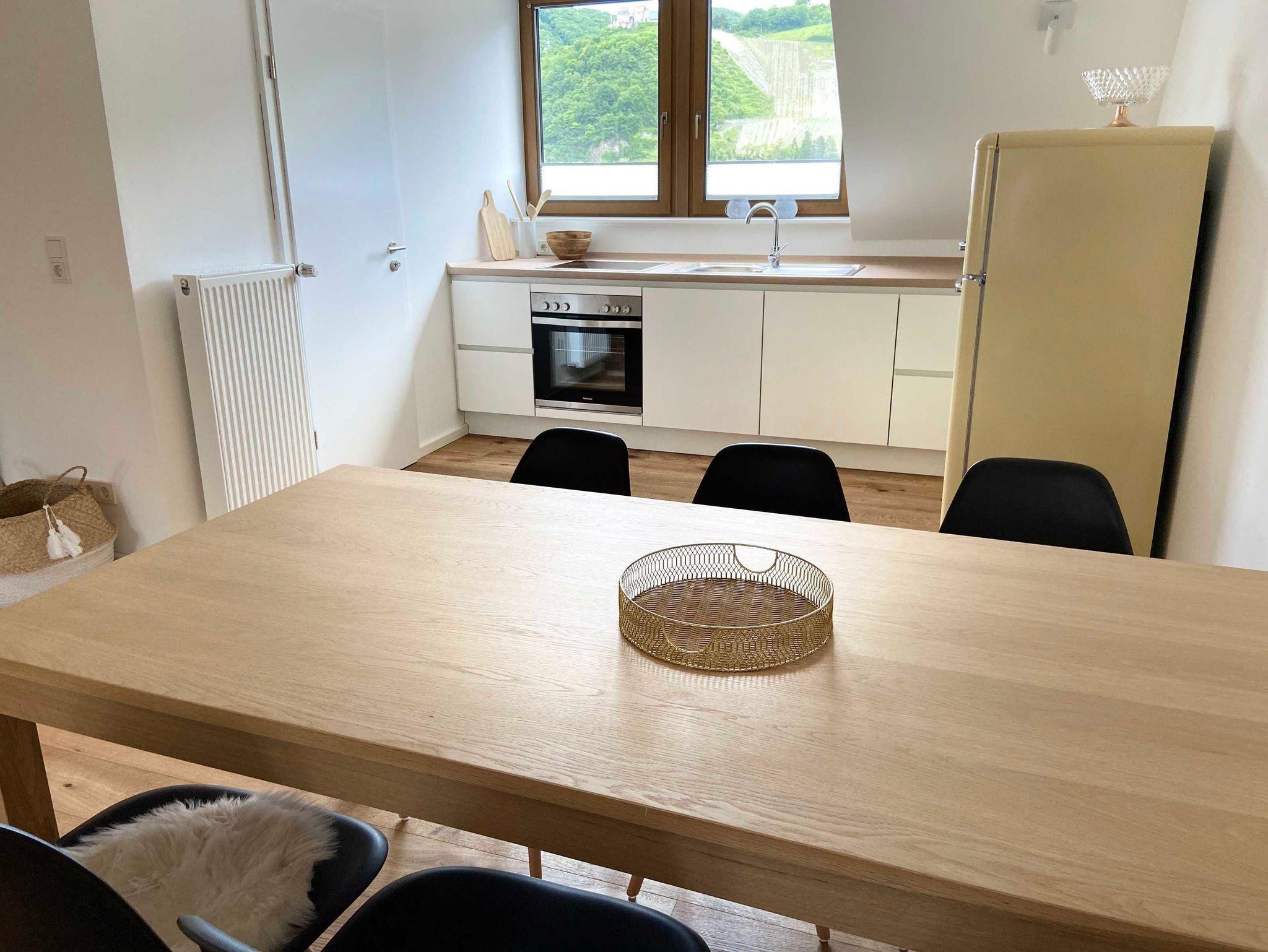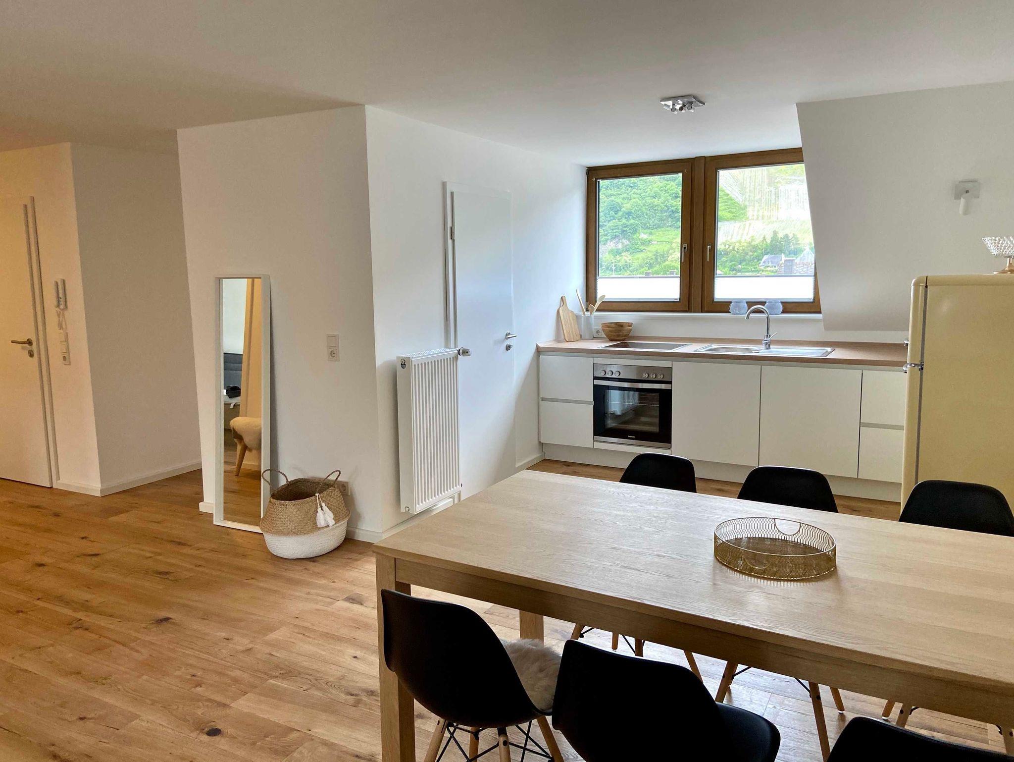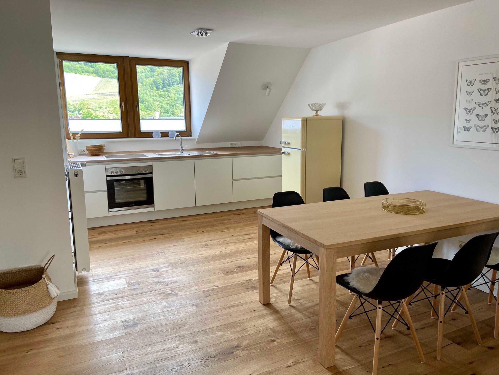 Die Ferienwohnung befindet sich im Dachgeschoss des Winzerhauses mit phantastischem Blick auf die gegenüberliegenden Weinberge und die berühmte Burg Landshut. Die luxuriöse, 100 qm große Ferienwohnung ist komplett mit Eichenparkett ausgestattet und verfügt über einen großzügigen Wohn-/Essbereich mit voll ausgestattete Küche, Vorratsraum, großem Esstisch für bis zu 8 Personen und einer großen Lounge- und Sofaecke. Zur Wohnung gehören drei Doppelschlafzimmer, ein großes helles Duschbad sowie ein separates Gäste-WC.
