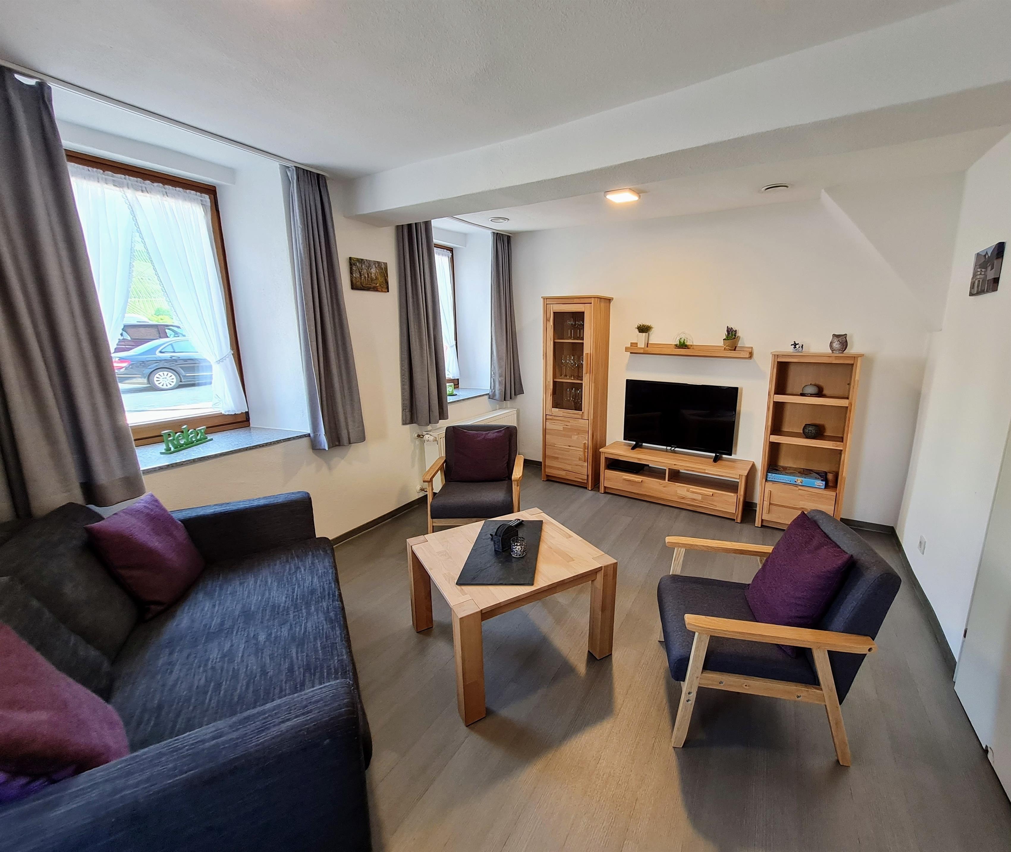 Das denkmalgeschützte moseltypische Fachwerkhaus ist um siebzehnhundertachtzig erbaut. Es wurde mit viel Eigenleistung saniert und steht nun als Ferienhaus zur Verfügung. Trotz der Moderne innen hat es seinen Charme der alten Gemäuer nicht verloren.