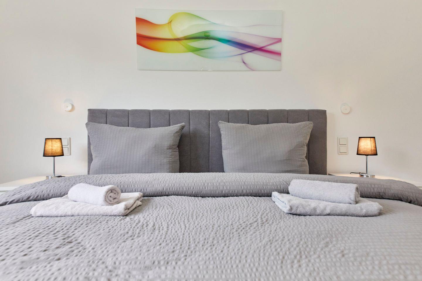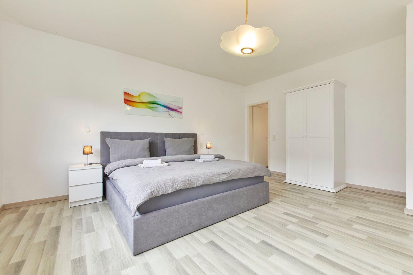 1 Schlafzimmer, 1 Bad mit Badewanne und bodengleicher Dusche plus Gäste-WC.