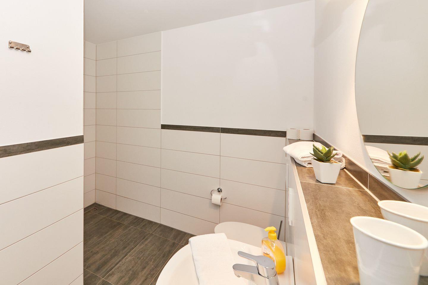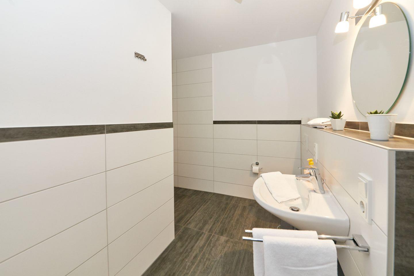 1 Badezimmer mit ebenerdiger Dusche und WC