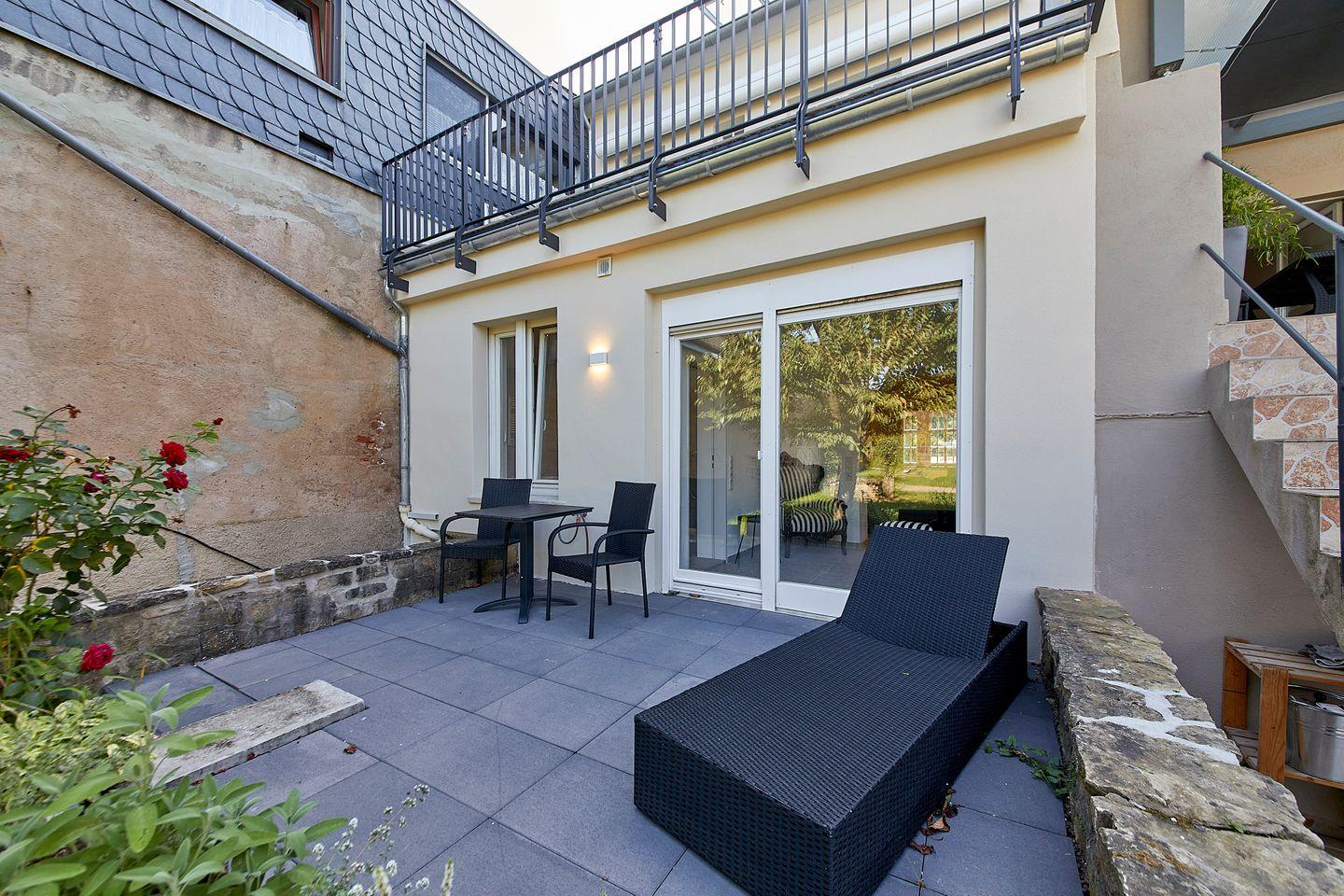 Terrasse mit Sitzbereich und einer Sonnenliege und Garten.