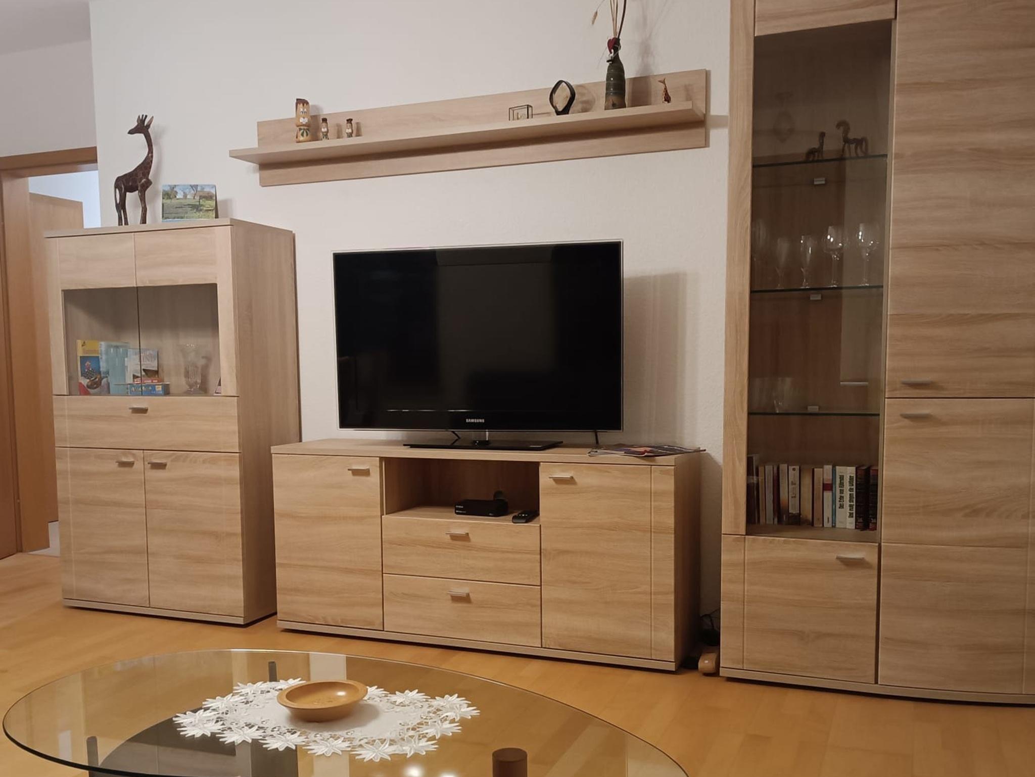 Das Wohnzimmer ist ausgestattet mit einem Sofa (Möglichkeit einer zusätzlichen Aufbettung), Couchtisch, sowie einem Esstisch mit 6 Stühlen und einer Wohnwand mit TV.