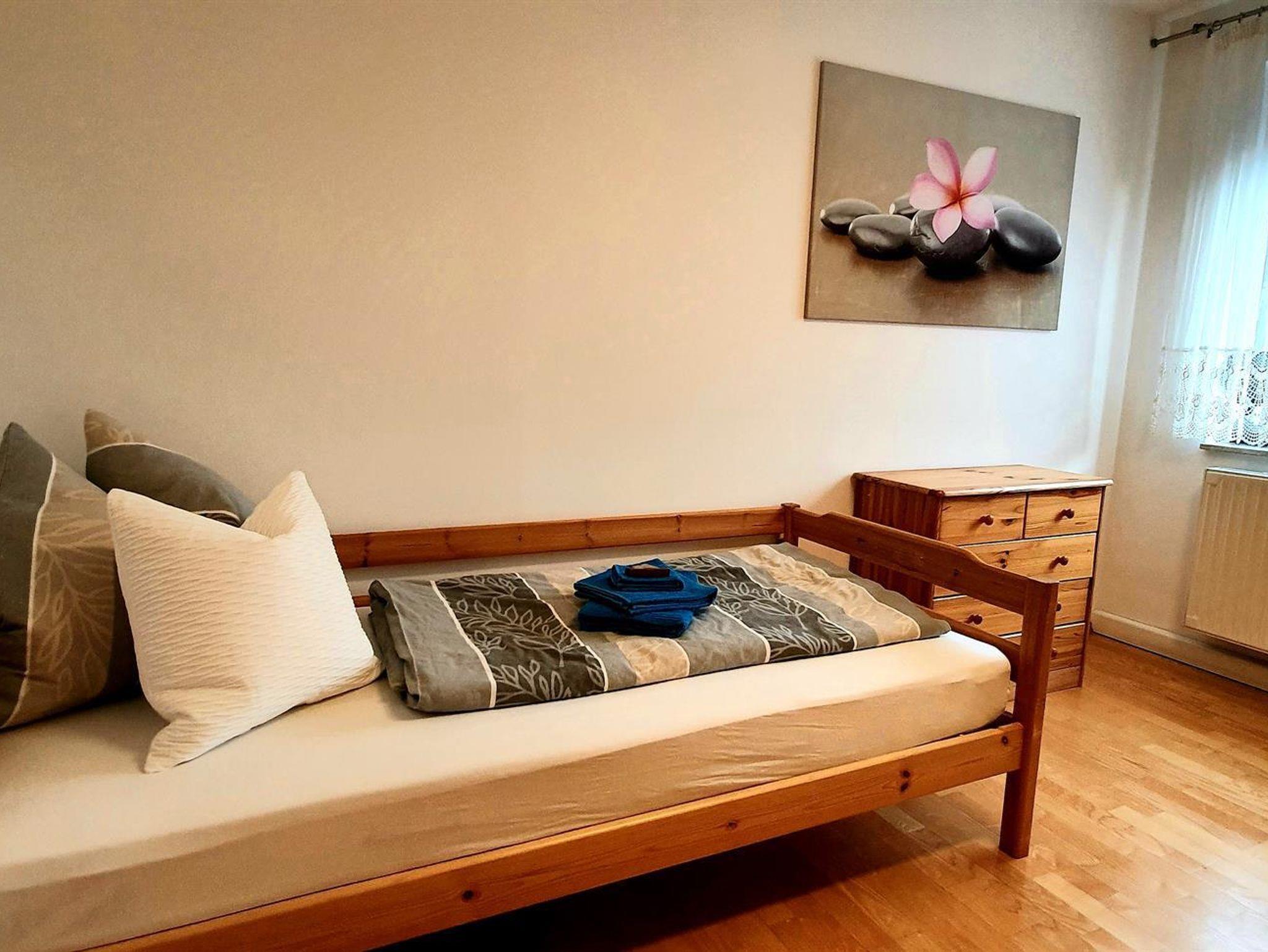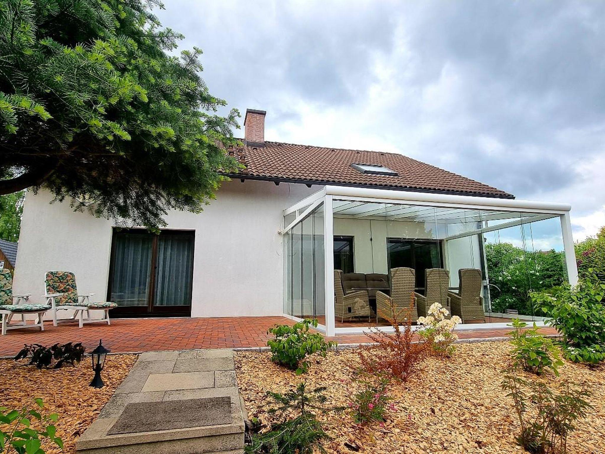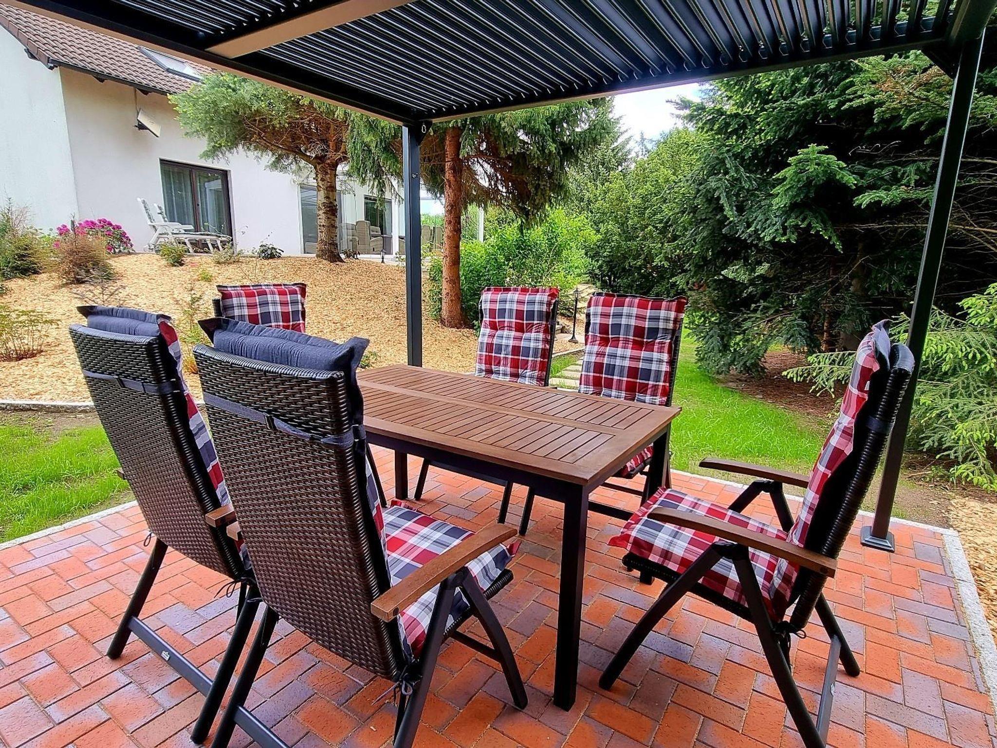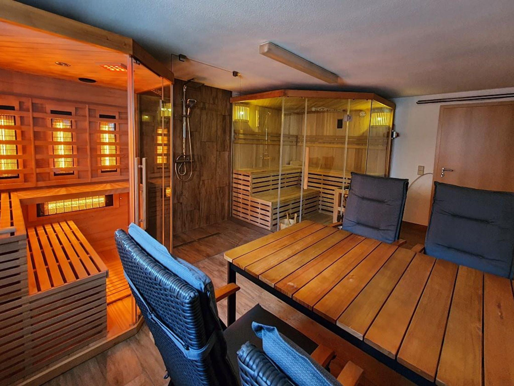 Die Wohnung im Obergeschoss verfügt über zwei Schlafzimmer, Küche, Bad und Balkon. Außerdem können Sie den Pavillon mit Sitzecke im Garten und den Wellnessbereich mit Sauna und Infrarotkabine nutzen.