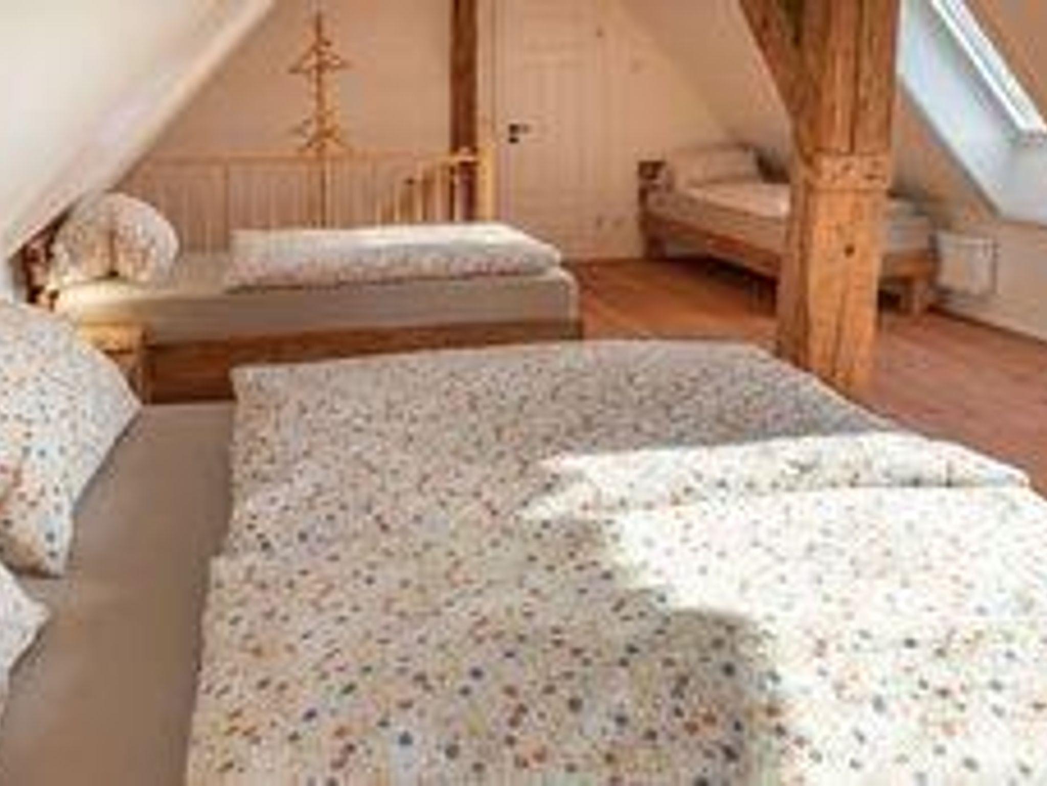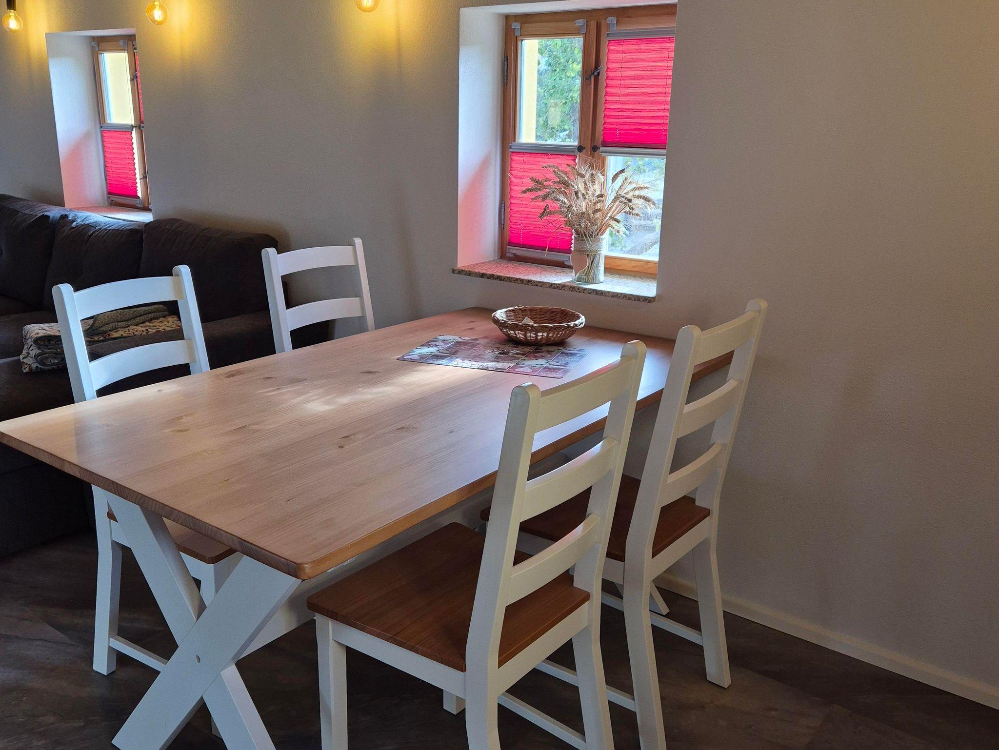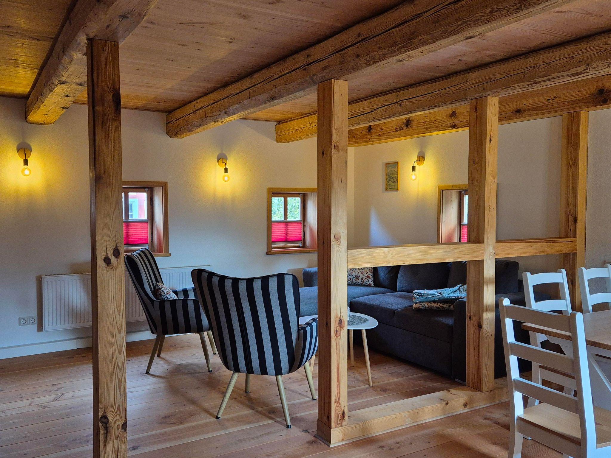 Oberlausitzer Charme mit Ausblick Die Ferienwohnung „Scheibe“ im Obergeschoss bietet auf 80?m² großzügigen Raum für Ihren Aufenthalt. Das große Schlafzimmer ist mit einem Doppelbett und zwei Einzelbetten ausgestattet und eignet sich perfekt für Familien oder kleine Gruppen. Für zusätzliche Schlafmöglichkeiten sorgt die bequeme Schlafcouch im Wohnzimmer.