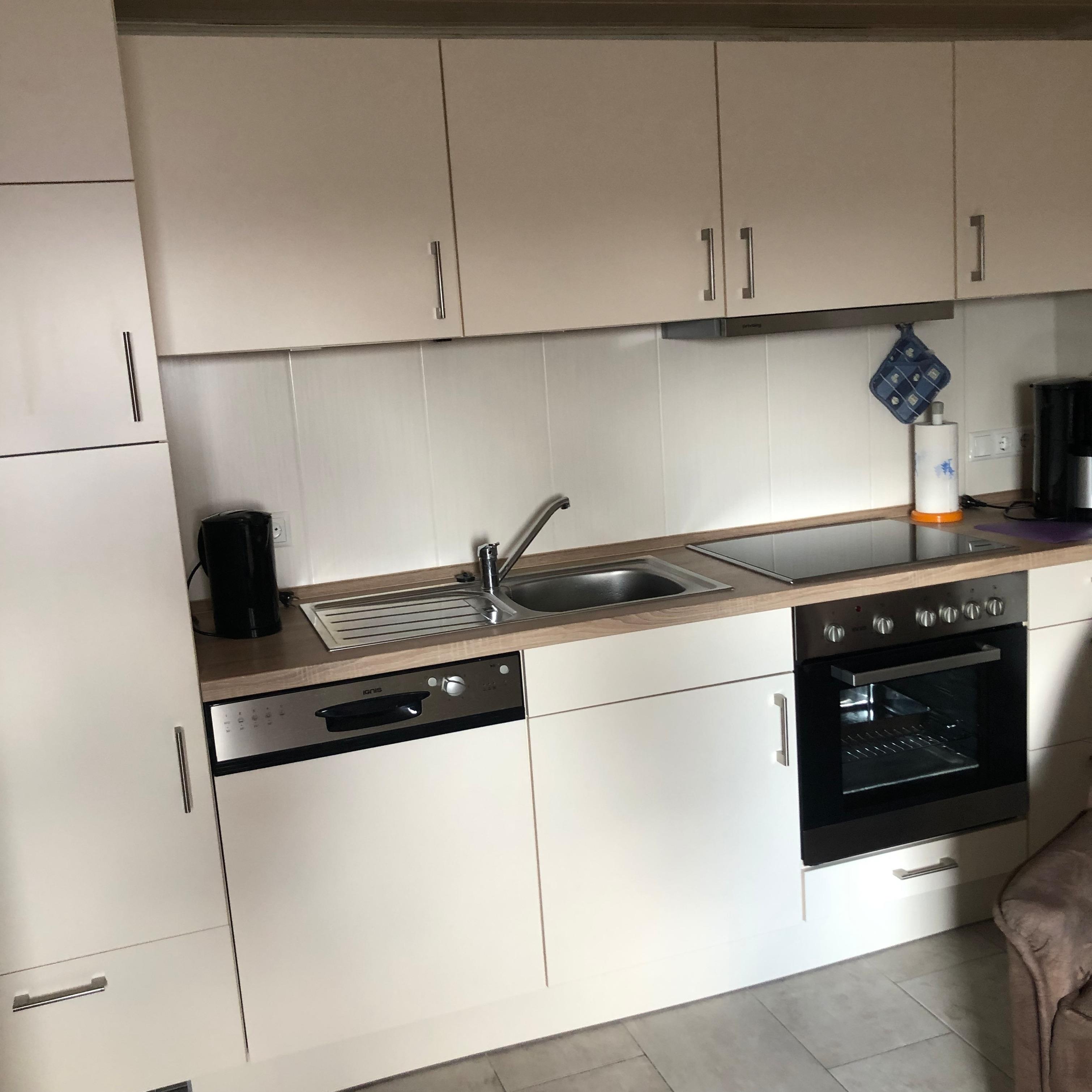 Im Erdgeschoß ist eine gut ausgestattete Wohnküche mit Spülmaschine und kleinem Gefrierschrank. Ein Fernseher sowie