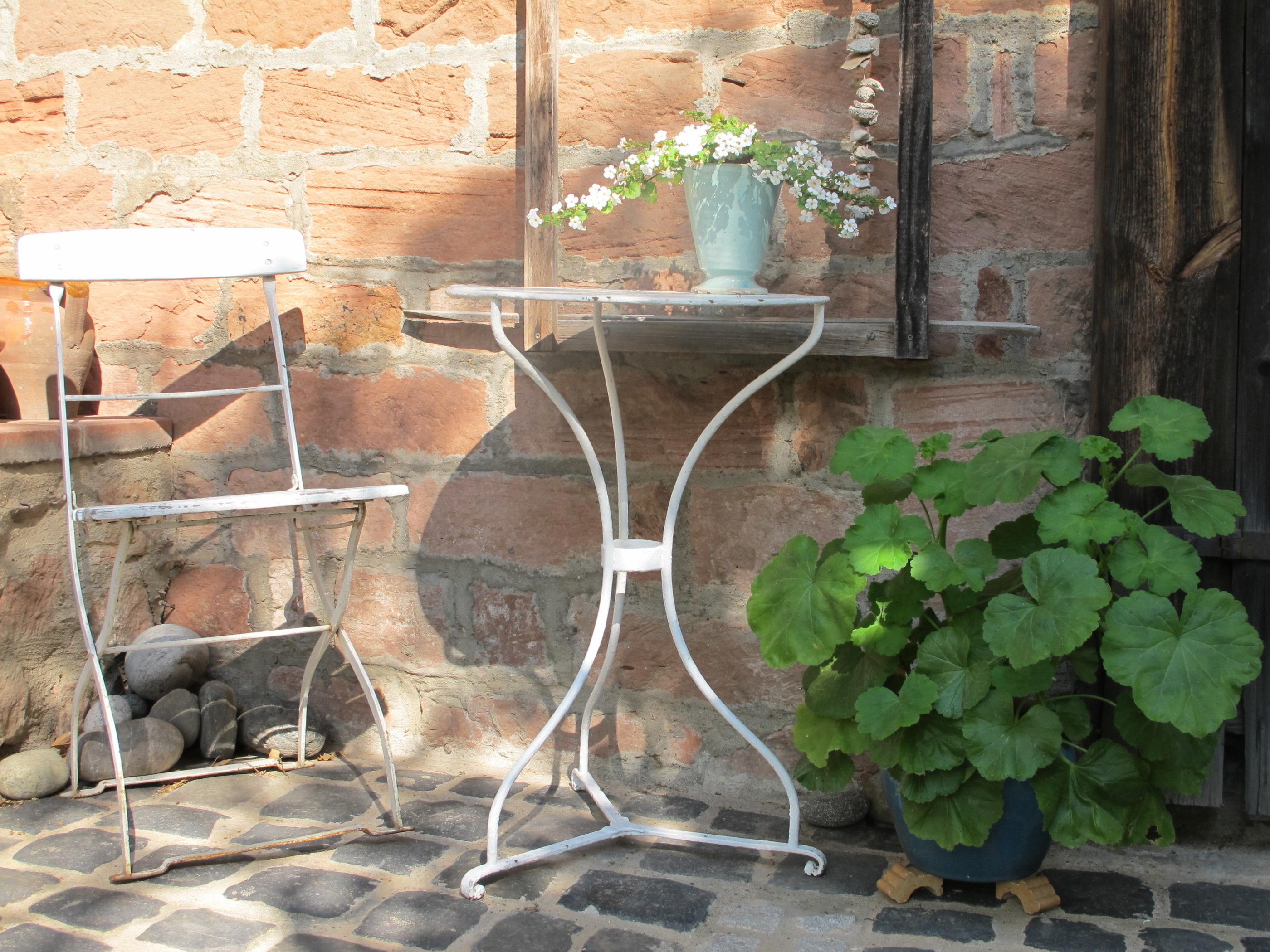 Kleine Terrasse: auf der Gartenseite mit kleinem Tisch und 2 Stühlen, Grillmöglichkeit
