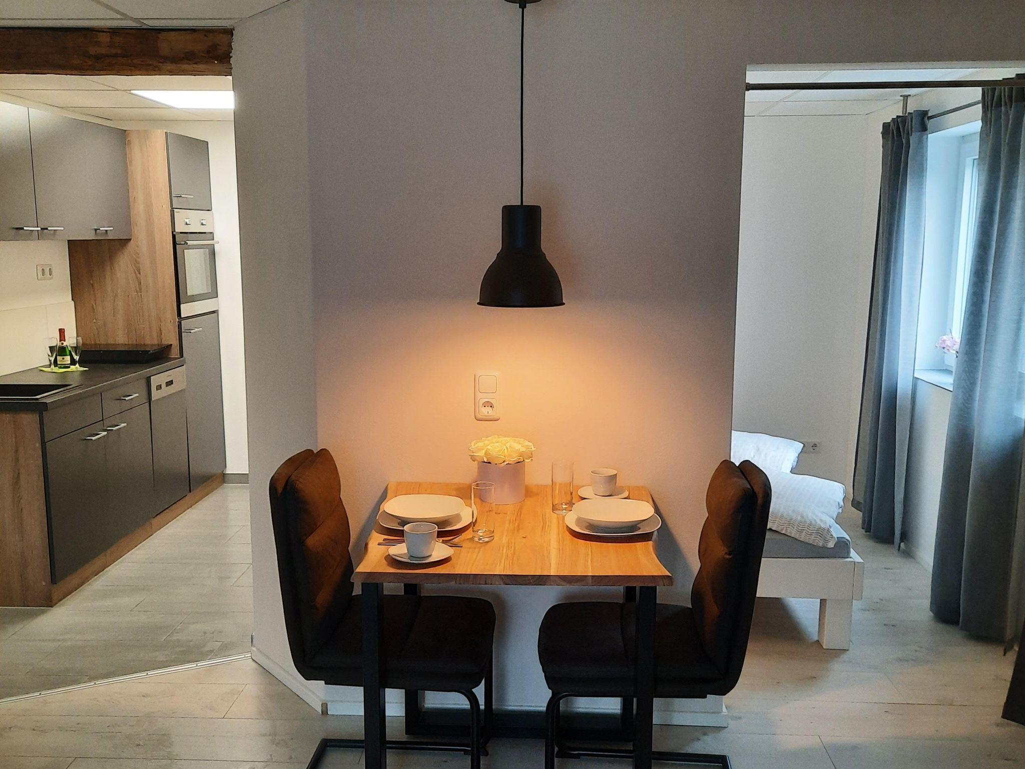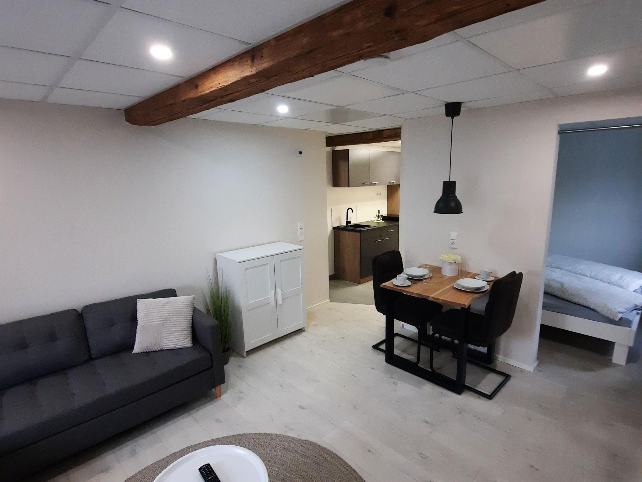 Das neu in 2023 entstandene 40 qm - Appartement ist stilvoll und modern eingerichtet, liegt parterre und ist optimal für 1-2 Personen. Im gemütlichen Wohnbereich befindet sich eine Couch zum relaxen, ein TV und eine Eßgruppe. Der Schlafbereich mit Doppelbett ist optisch abgegrenzt. In der gut ausgestatteten Küche mit Backofen, Kühlschrank mit Gefrierschrank, Geschirrspüler, Induktionskochfeld mit 2 Platten können Sie leckere Gerichte zubereiten. Eine Kaffeepadmaschine, Wasserkocher und Toaster stehen ebenfalls zur Verfügung. Separates Bad mit Dusche / WC. Haustiere sind nicht erlaubt. Ein Parkplatz steht nach Verfügbarkeit kostenlos zur Verfügung.