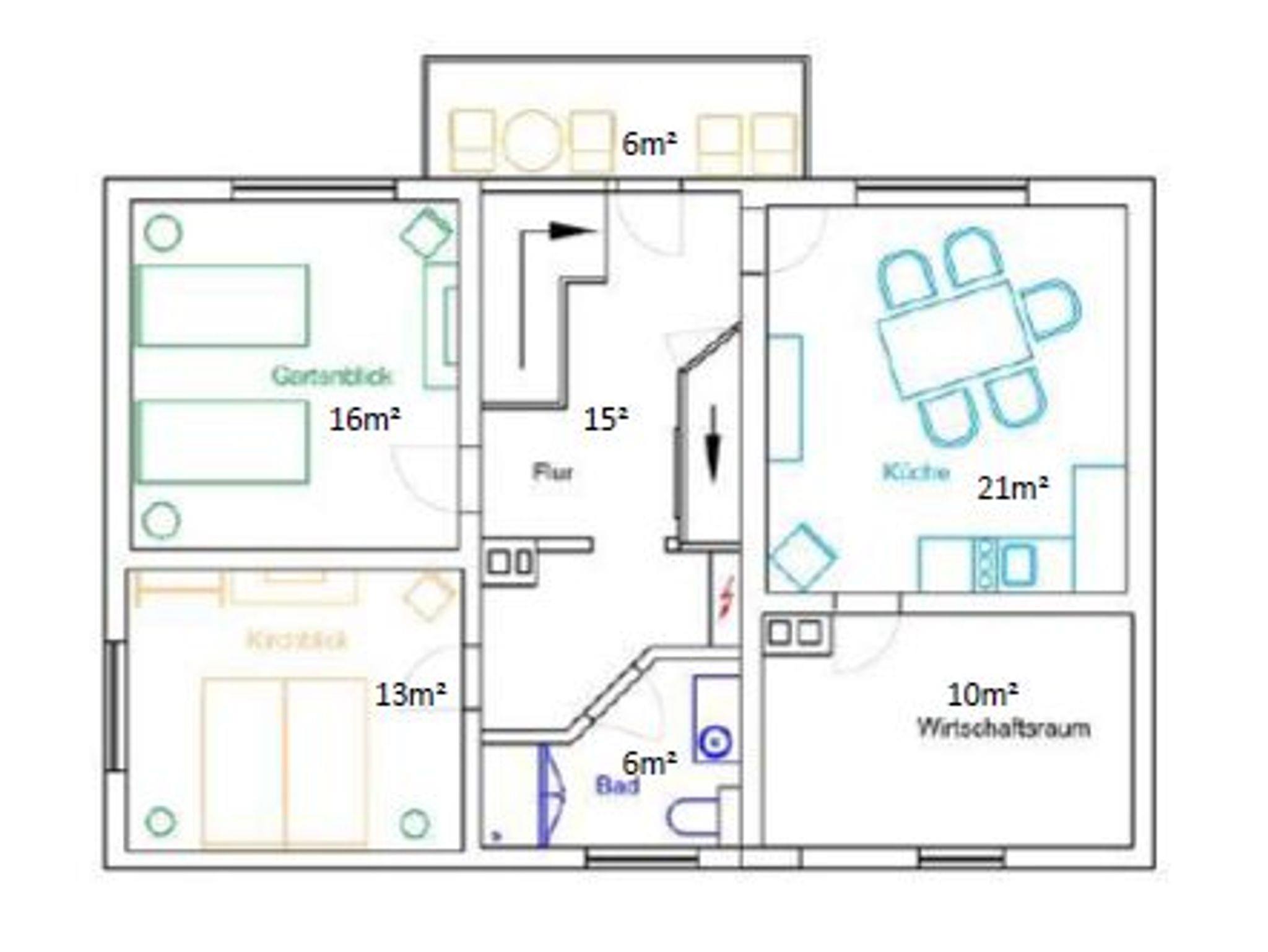 Genießen Sie Ihr Frühstück in der Ferienwohnung auf dem nach Süden liegenden Balkon oder lassen Sie dort den Tag ausklingen. In der voll ausgestatteten Wohnküche mit Backofen, Induktionskochfeld mit zwei Platten, Kühlschrank mit Gefrierfach, Mikrowelle, Toaster, Kaffeepadmaschine / Kaffeemaschine, Wasserkocher können Sie leckere Gerichte zubereiten. Eine gemütliche Sitzgruppe lädt zum Verweilen ein. Im Badezimmer gibt es eine bodengleiche Dusche, WC und Föhn sowie einen Kosmetikspiegel.