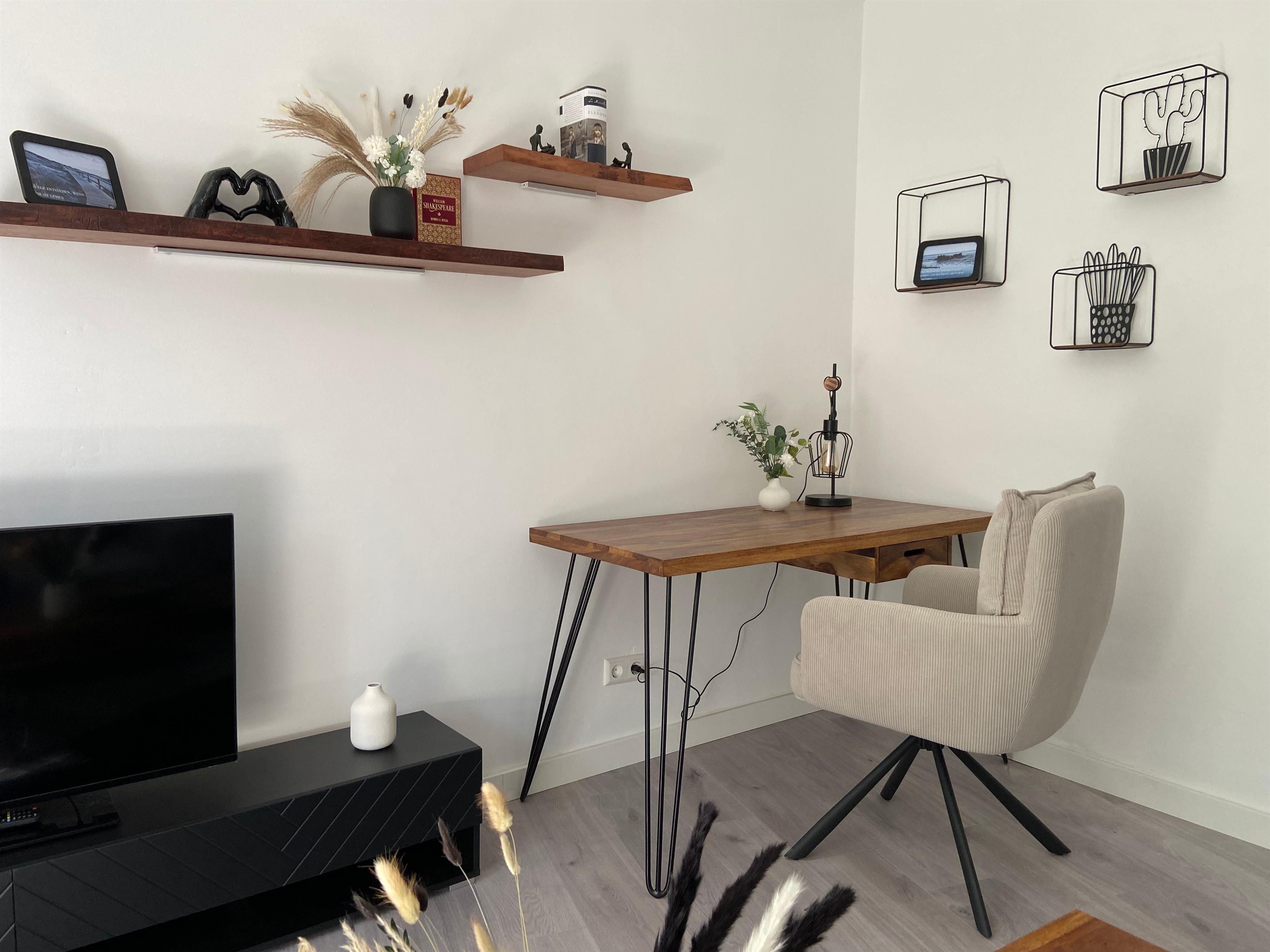Im gemütlichen Wohnzimmer mit internet-fähigem Smart TV ermöglicht ein kleiner Arbeitsbereich effektives Arbeiten im Homeoffice.