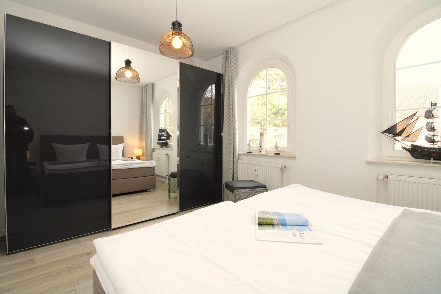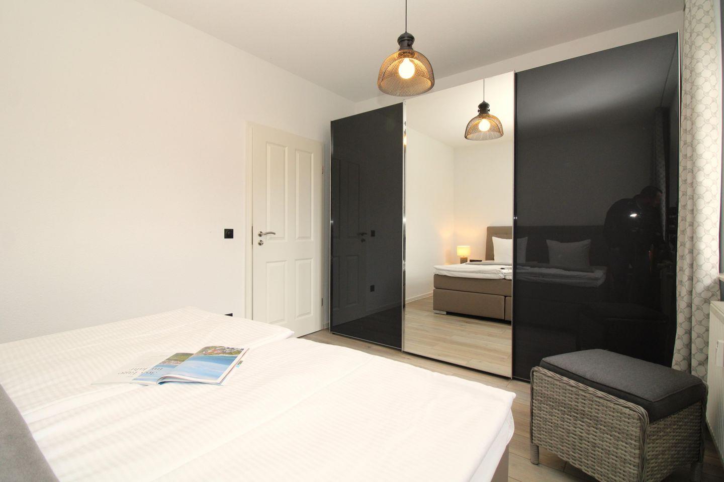 Das freundliche und gemütliche Schlafzimmer ist mit einem bequemen Doppel-Boxspringbett (2x90x200), Nachttischen und einem sehr geräumigen Kleiderschrank eingerichtet. Zusätzliche Verdunkelungsvorhänge an den Fenstern ermöglichen eine ungestörte Nachtruhe.
