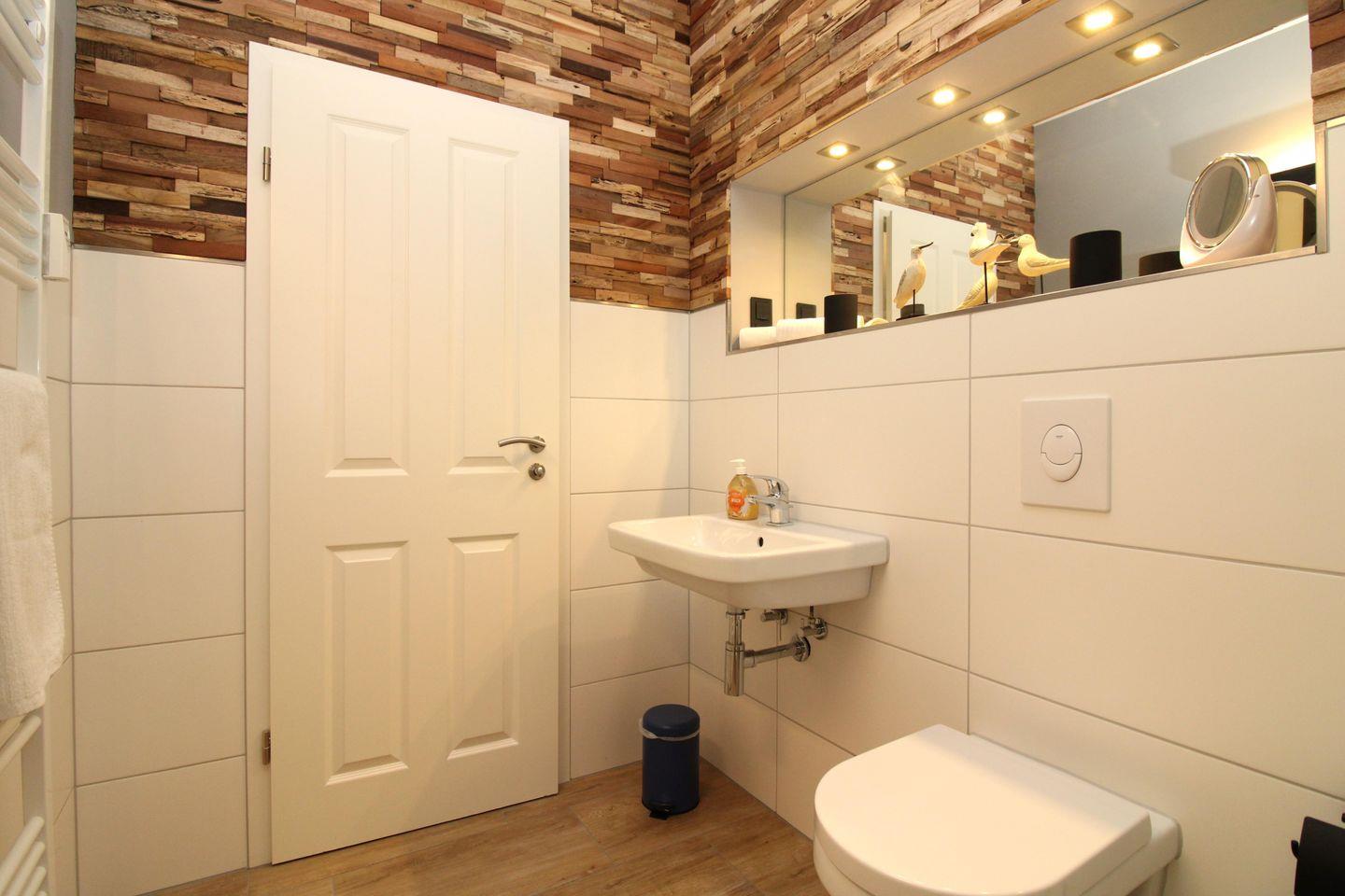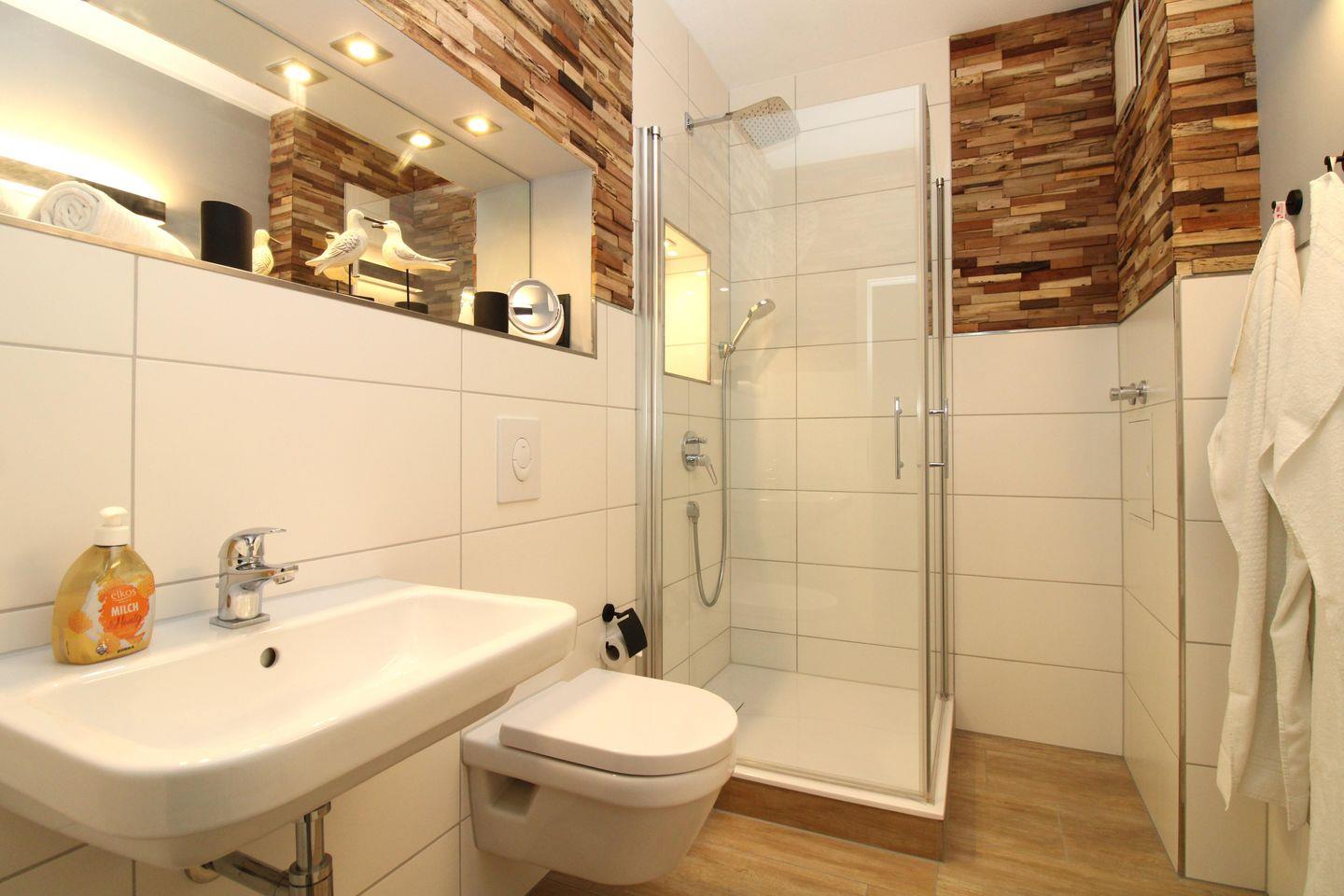 Das geräumige Badezimmer verfügt über eine Dusche mit niedrigem (seniorengerechten!) Einstieg und Echtglas-Duschabtrennung, Waschbecken, WC, Föhn, Kosmetikspiegel sowie ausreichend Ablageflächen.