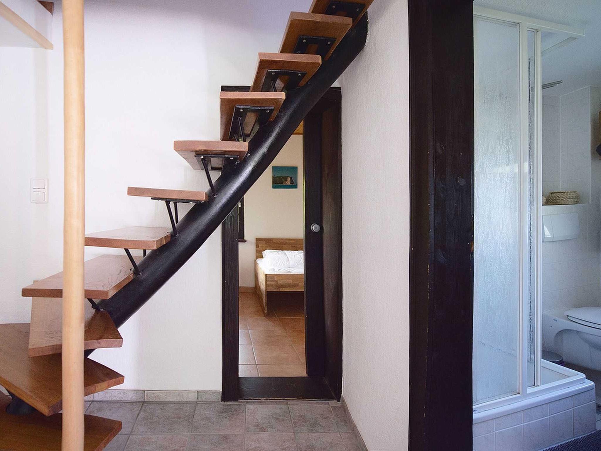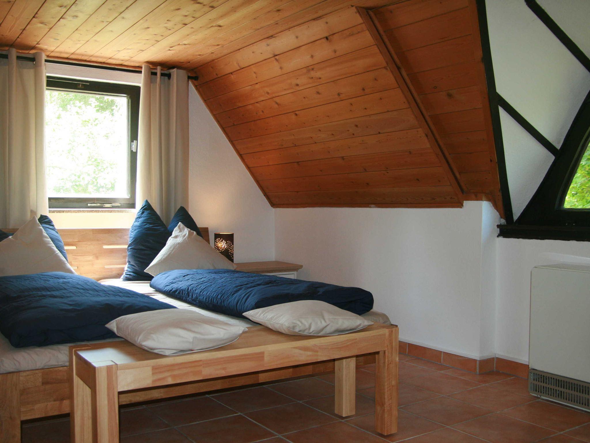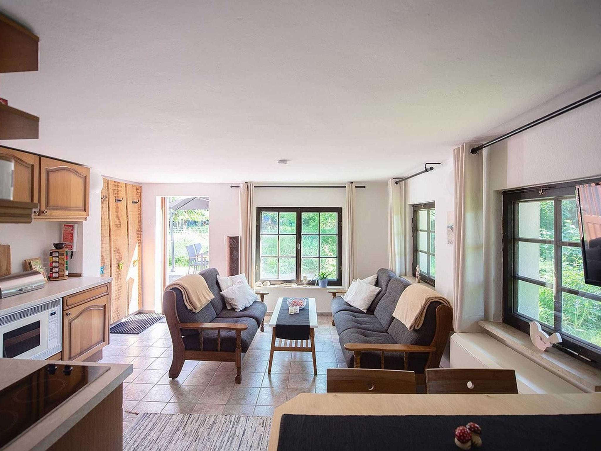 Rustikales Ferienhaus mit Terrasse und Garten auf separatem und eingezäuntem Grundstück. Mit 2 Schlafräumen, Duschbad/WC, Wohnküche mit direktem Terrassenzugang. Möblierte Sonnenterrasse und Grillkamin. PKW-Stellplatz und Fahrradabstellplatz am Haus. Vom separaten und eingezäunten Gartengrundstück freier Blick auf den gepflegten Kleinbauernhof mit Schafen, Hühnern und Enten, Hund und Katze der Gastgeberfamilie.
