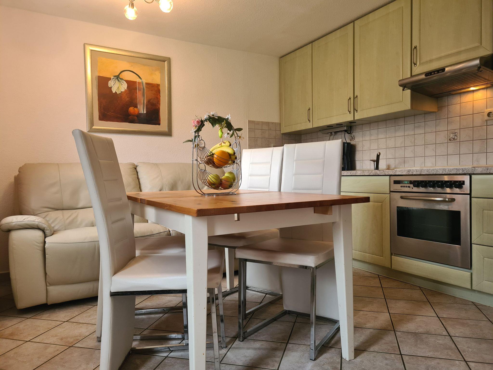 Erdgeschoß: Wohnküche (Sat-TV, Radio), Küchenzeile (E-Herd, Backofen, Mikrowelle, Kaffeemaschine, Toaster, Wasserkocher, Kühl/Gefrierschrank, Geschirrspüler). Kleines Duschbad/WC. Fußbodenheizung.