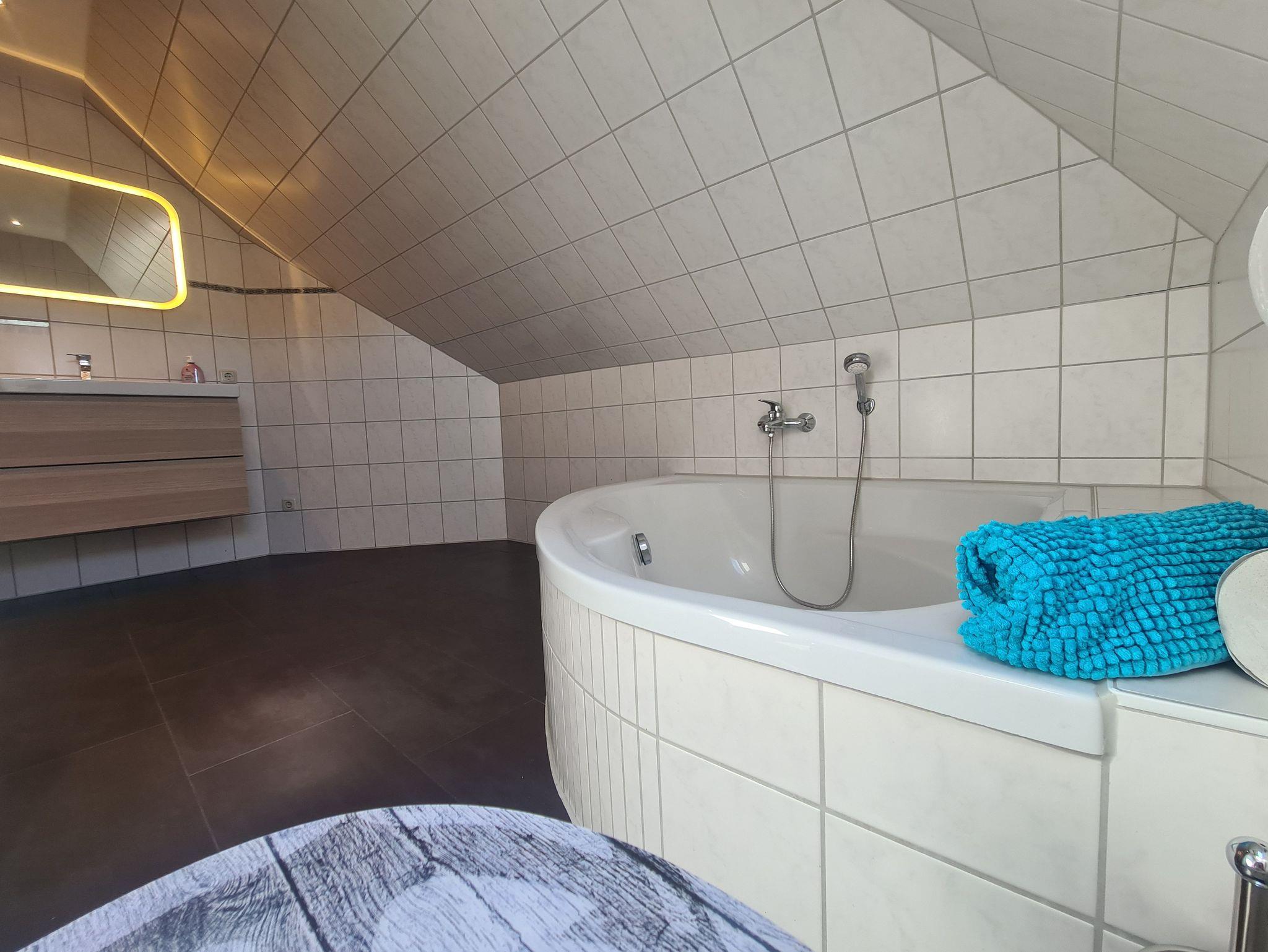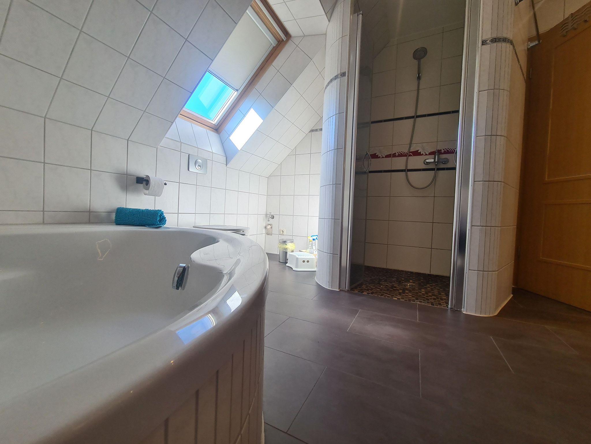 Duschbad/WC mit Eck-Badewanne und ebenerdiger Dusche. Fußbodenheizung.