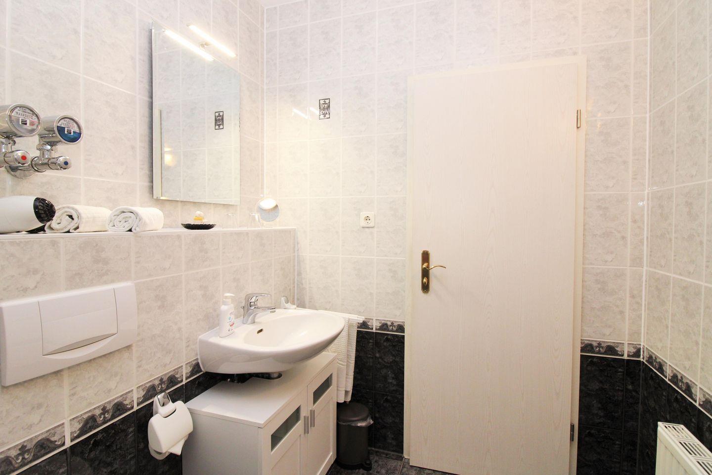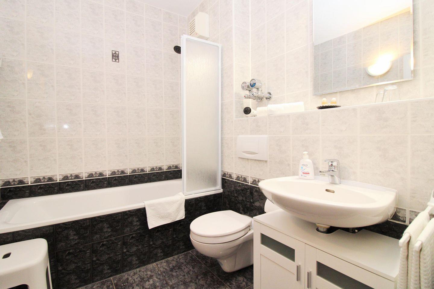 Das geräumige Badezimmer verfügt über eine Badewanne mit Duschabtrennung, Waschbecken mit Unterschrank, WC, Hocker, Föhn, Kosmetikspiegel sowie ausreichend Ablagemöglichkeiten.