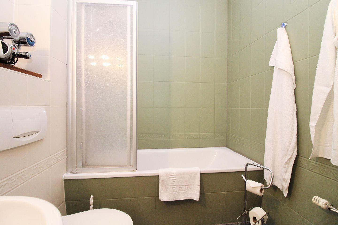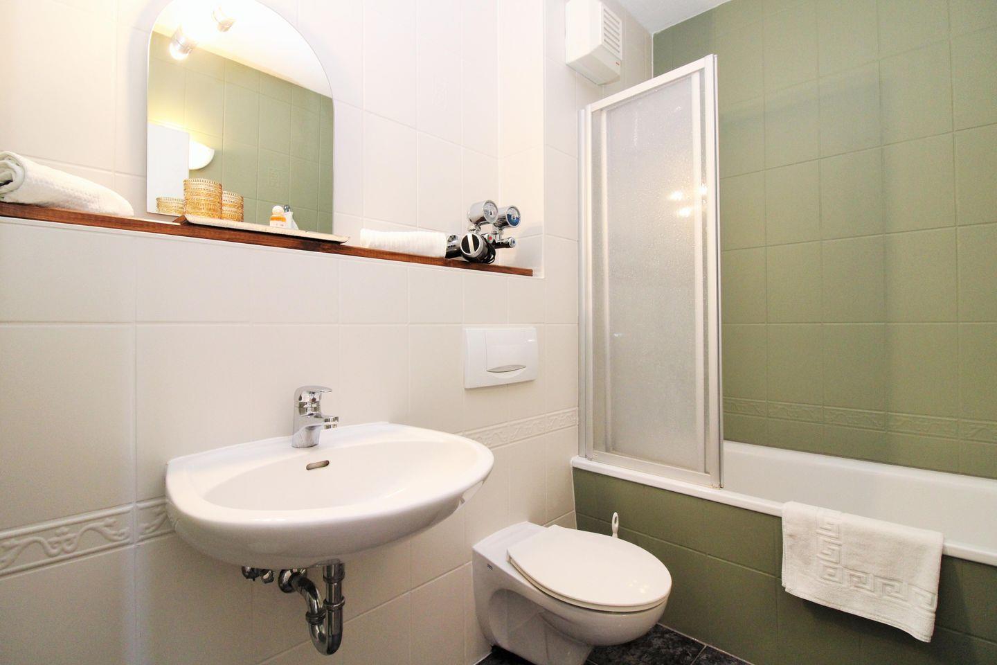Das vom 1. Schlafzimmer abgehende geräumige 1. Badezimmer verfügt über eine Badewanne mit Duschabtrennung, Waschbecken und WC, Föhn sowie ausreichend Ablagemöglichkeiten.