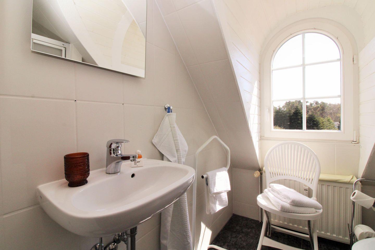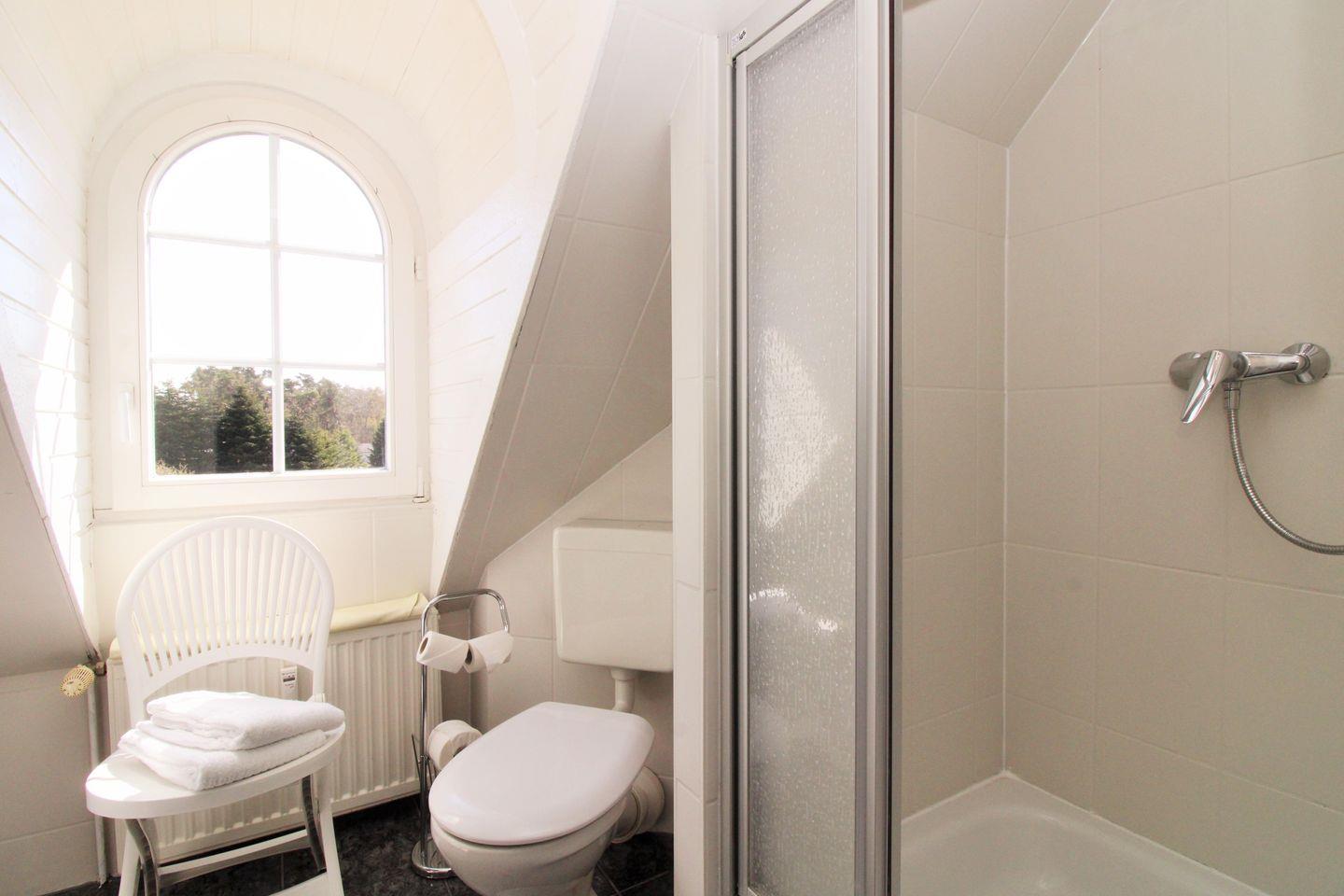 Das sich vom Flur vor dem 2. Schlafzimmer befindliche zusätzliche 2. Badezimmer (mit Tageslicht / Fenster) verfügt über eine Dusche, Waschbecken und WC sowie einen Stuhl.