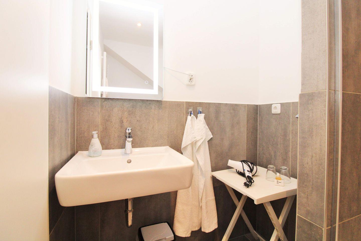 Das moderne Badezimmer verfügt über eine Dusche mit Echtglas-Duschabtrennung und niedrigem, seniorenfreundlichen Einstieg, Waschbecken, WC, einen Föhn sowie ausreichend Ablagemöglichkeiten.
