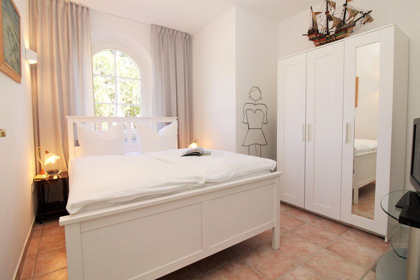 Das gemütliche und helle Schlafzimmer ist mit einem bequemen Doppelbett, Nachttischen sowie einem geräumigen Kleiderschrank eingerichtet. Hier steht Ihnen ein weiteres TV-Gerät zur Verfügung. Zusätzliche Verdunkelungsvorhänge an den Fenstern ermöglichen eine ungestörte Nachtruhe.