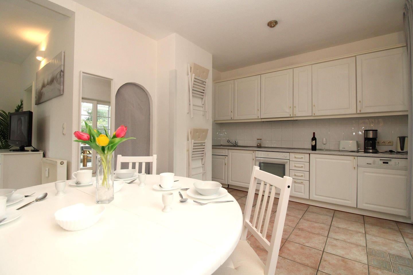 Der offene und geräumige Küchenbereich beinhaltet eine komplett ausgestattete Einbauküche in gehobener Ausstattung mit 4-Zonen-Ceran-Kochfeld, Backofen, Dunstabzug, Geschirrspülmaschine, Kühlschrank mit Gefrierfach sowie Kaffeemaschine, Wasserkocher und Toaster. Die Küche ist mit Geschirr, Gläsern, Besteck und Töpfen komplett ausgestattet.