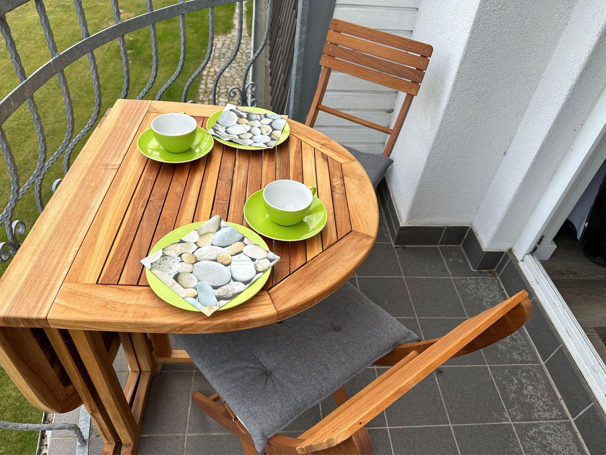 Vom gemütlich eingerichteten Wohn-/Essbereich mit Küchenzeile gelangt man auf den größeren Balkon mit Süd-/Westausrichtung und Blick in den Garten. Dieser Gemeinschaftsgarten mit Sitzecke und Grillmöglichkeit lädt zum gemütlichen Zusammensitzen, Spielen und Entspannen ein.