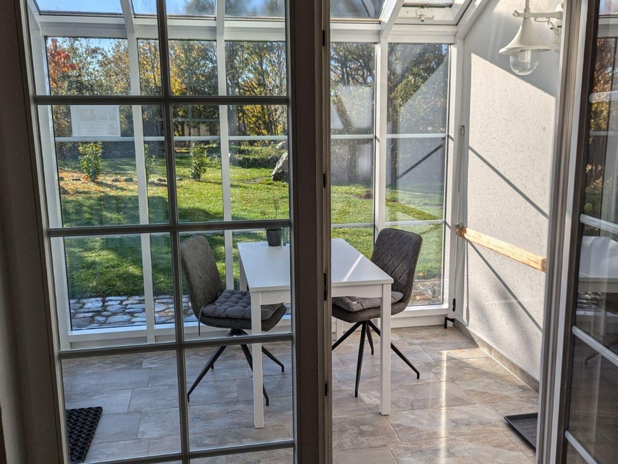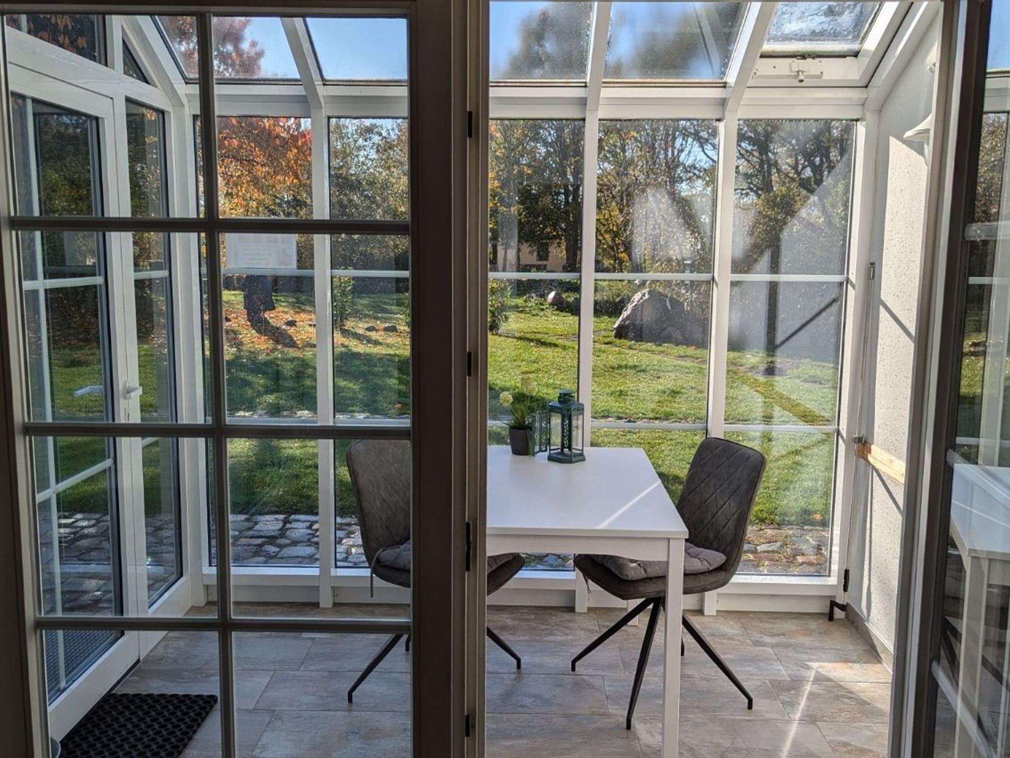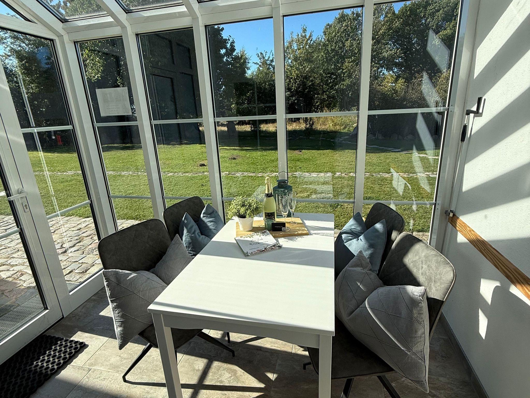 Der gemütliche Wintergarten ist mit einem Esstisch, 2 Stühlen und 1 Sitzbank eingerichtet