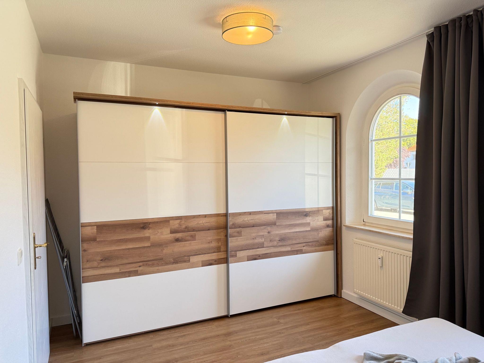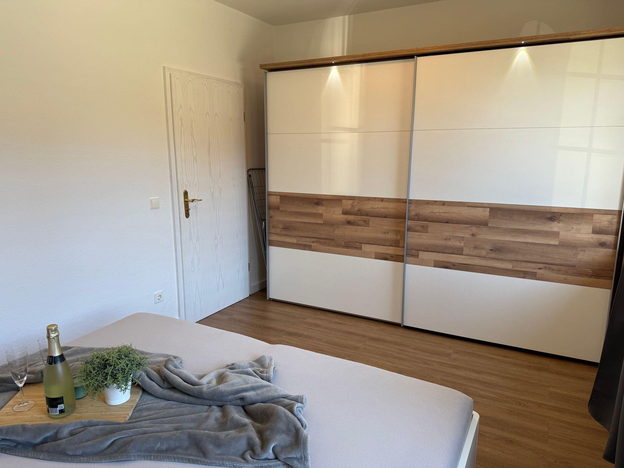 (mit getrennten Matratzen) in der Größe 1,80 x 2,00m, Nachttischen, sowie einem geräumigen Kleiderschrank