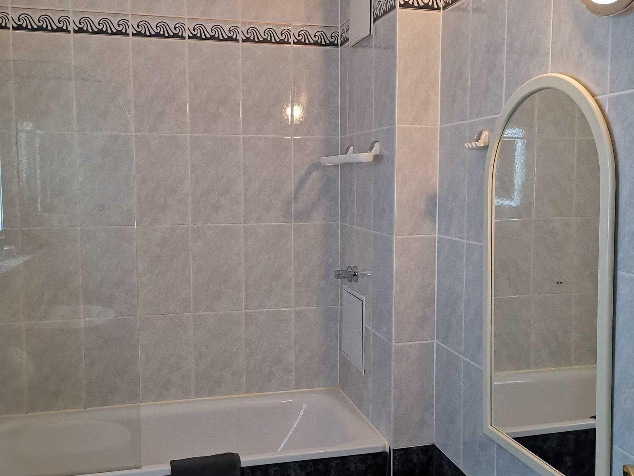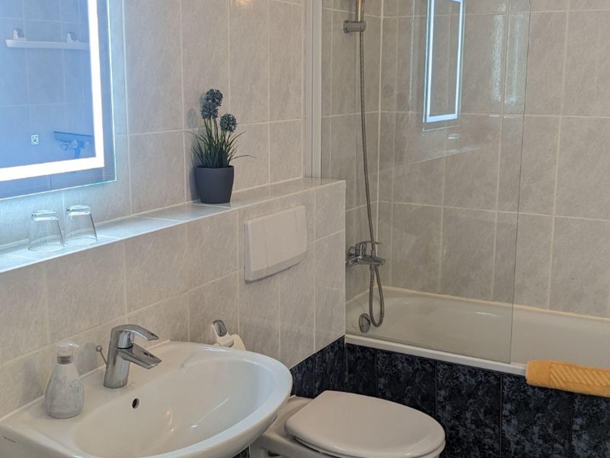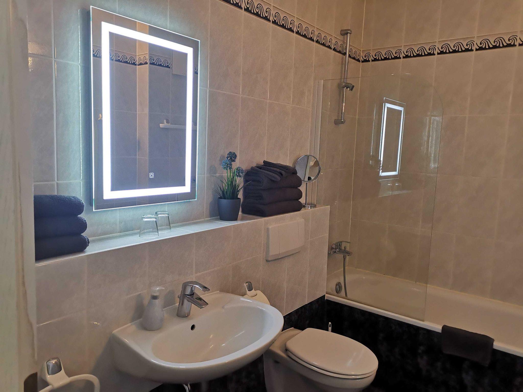 Das Badezimmer verfügt über eine Badewanne mit Duschmöglichkeit, Waschbecken,