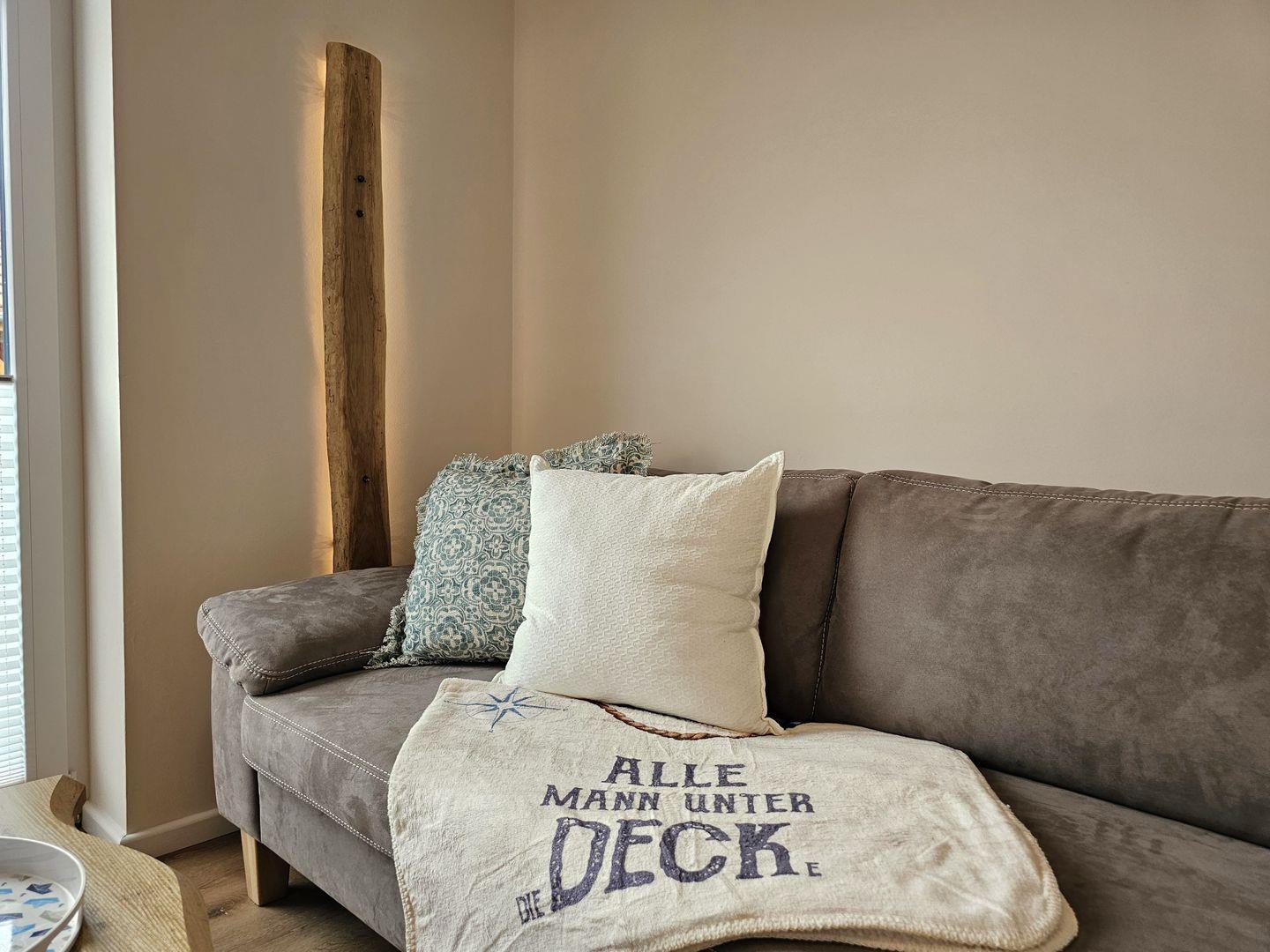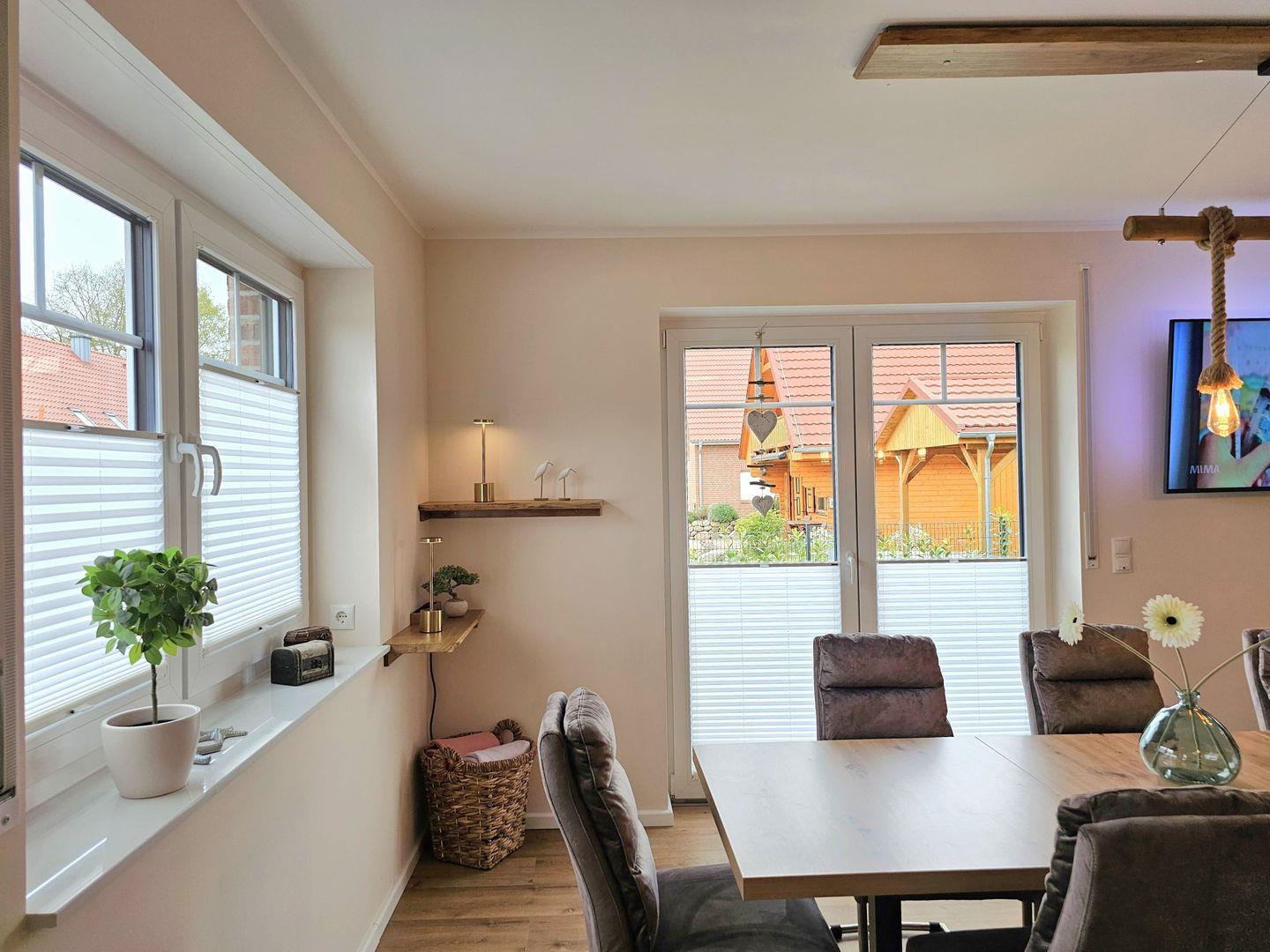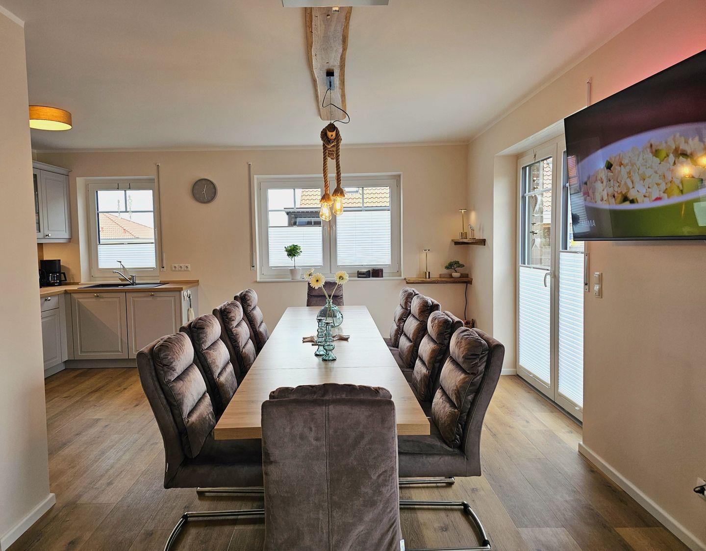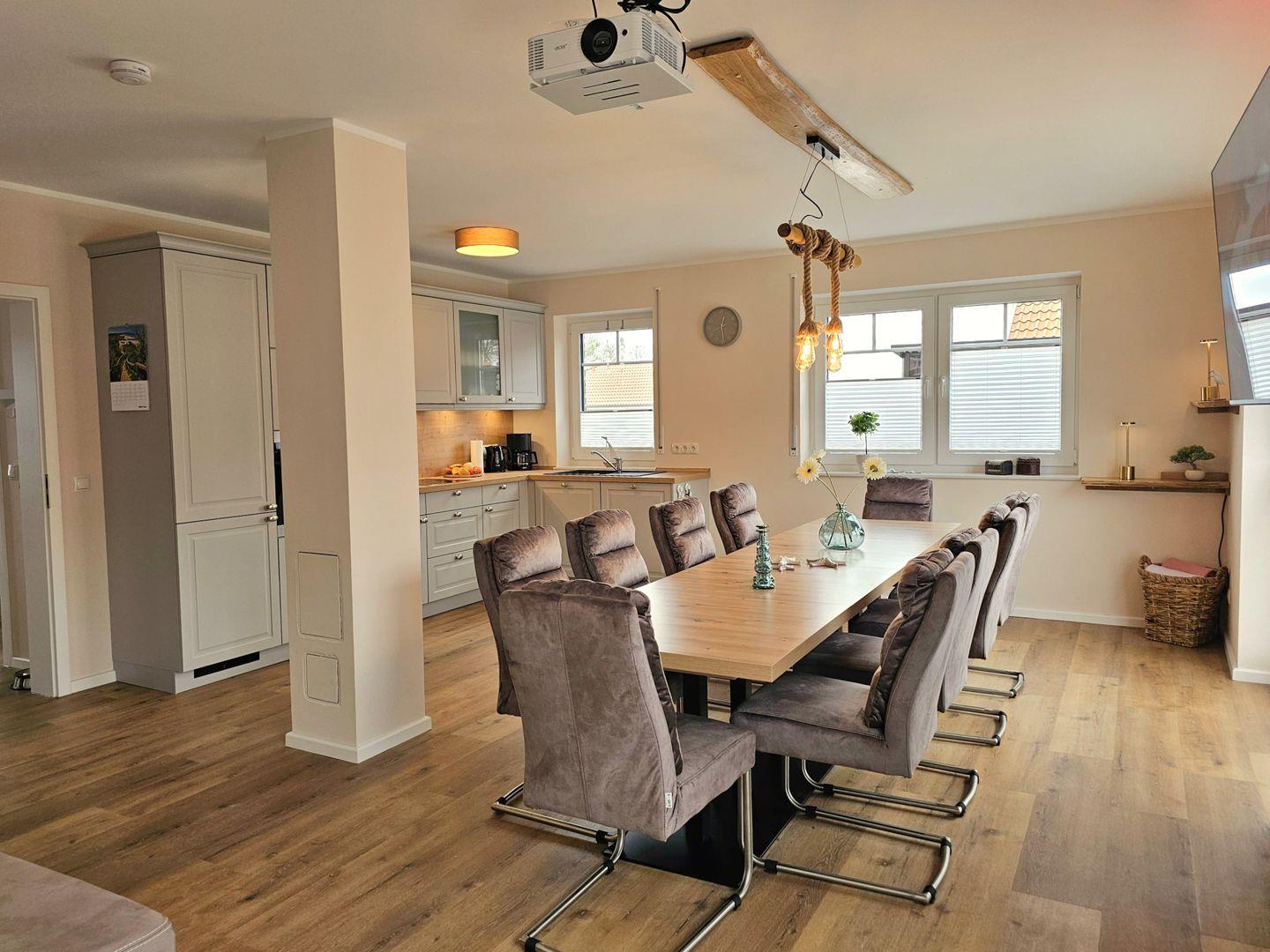 Der großzügige Wohnbereich lädt nicht nur zum Verweilen ein, sondern auch dazu, gemeinsame Zeit zu verbringen. Eine gemütliche Sofaecke, ein Esstisch mit super bequemen Polsterstühlen und moderne Unterhaltungstechnik wie ein Smart-TV, sowie ein Beamer garantieren unvergessliche Abende. Für Ihr digitales Wohl sorgt ein WLAN-Anschluss, damit Sie problemlos im Internet surfen oder Ihre Erlebnisse teilen können.